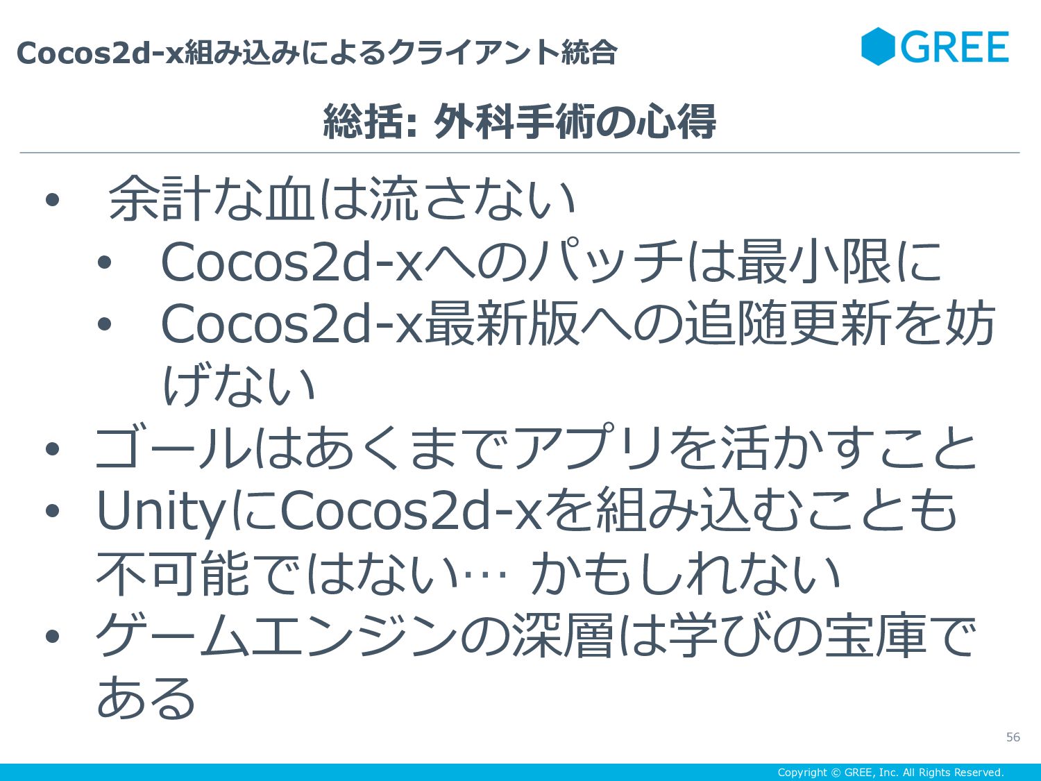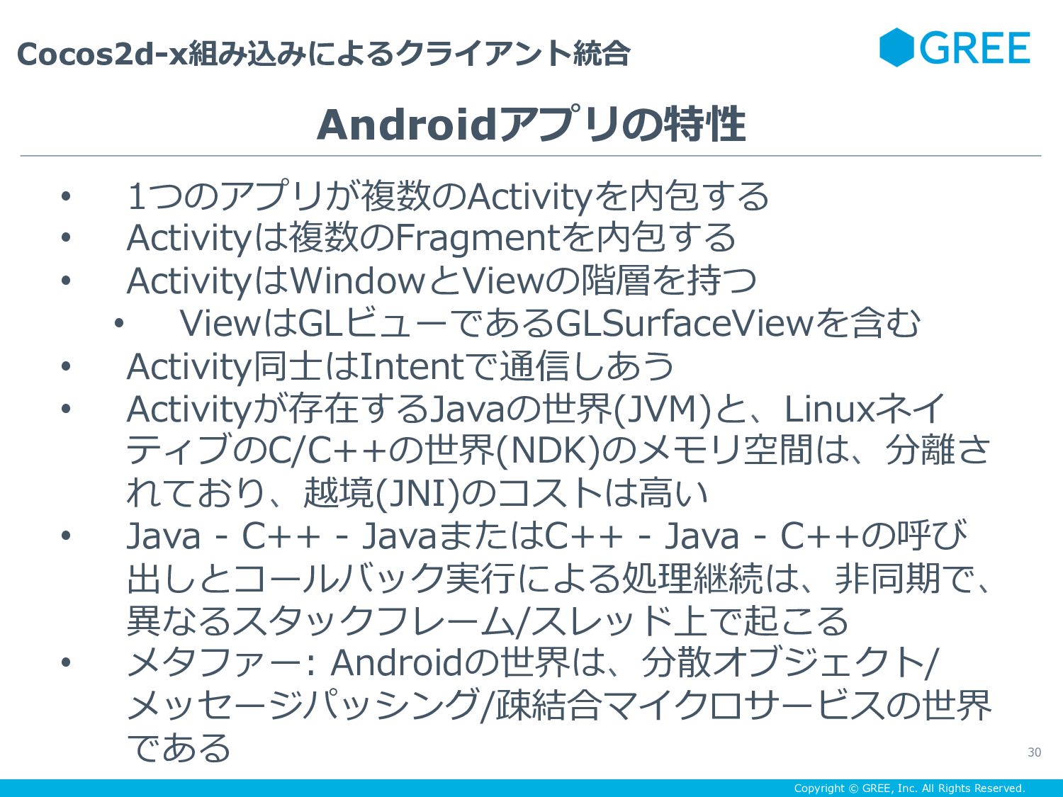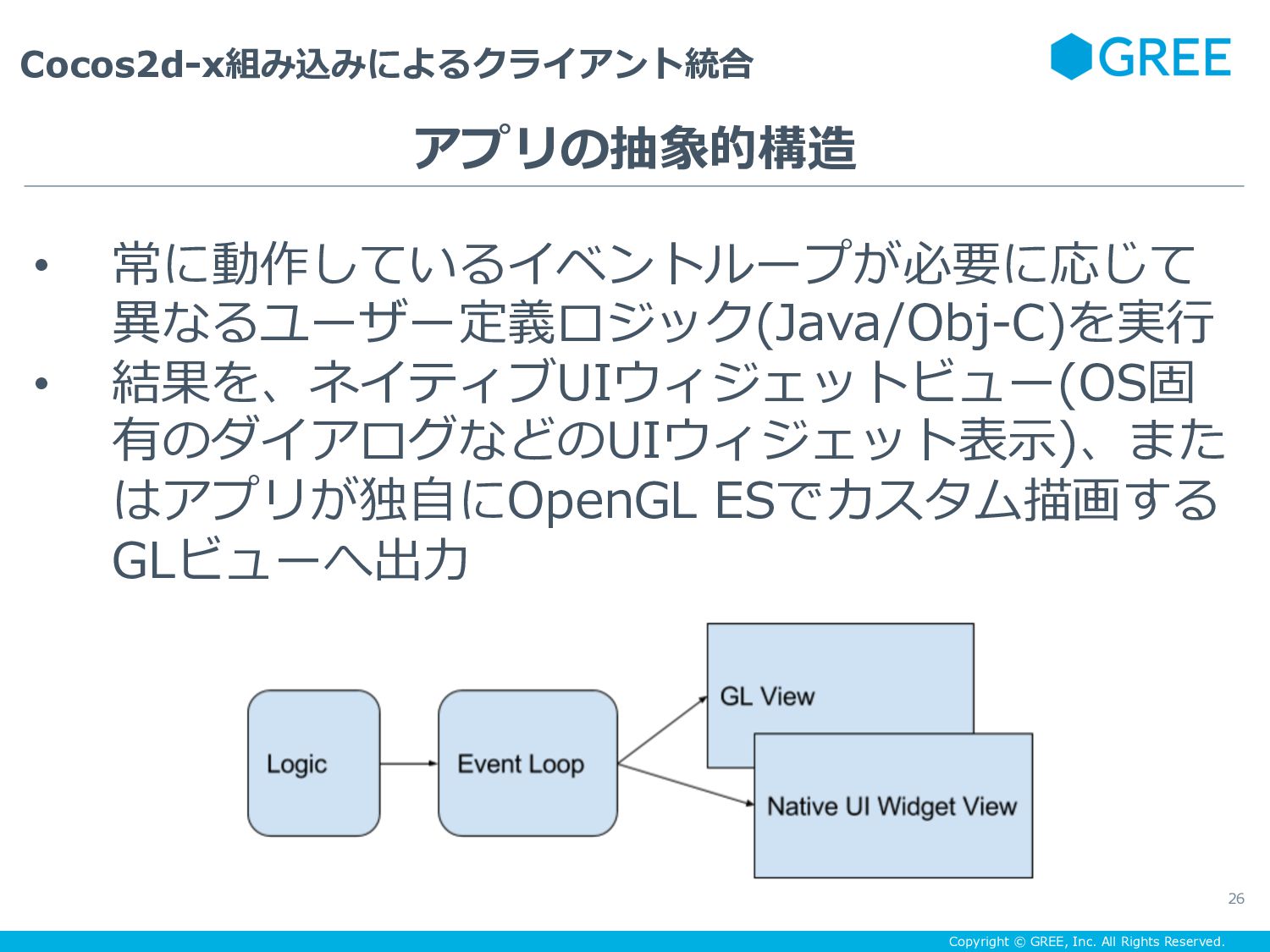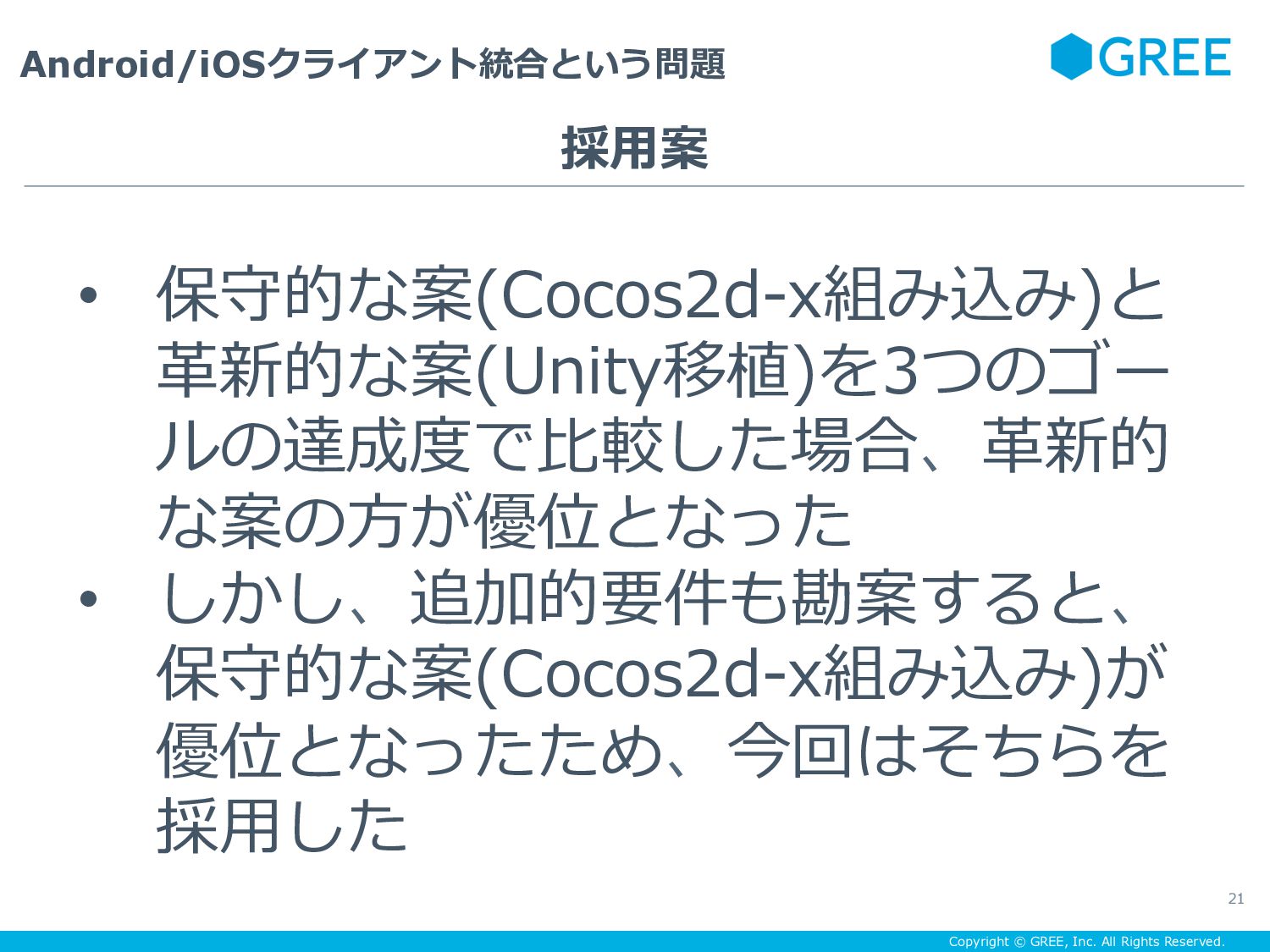 ピュアJavaまたはObjective-Cで別個に開発されたAndroid/iOS各プラットフォーム向けクライアントコードベースを、Cocos2d-xへの単純移植ではなく、既存アプリへのプラグインのようにCocos2d-x自体をまるごと組み込むこと(embed)により、移行のコストとリスクを最小限に抑制しつつ統合してゆく手法をご紹介いたします。