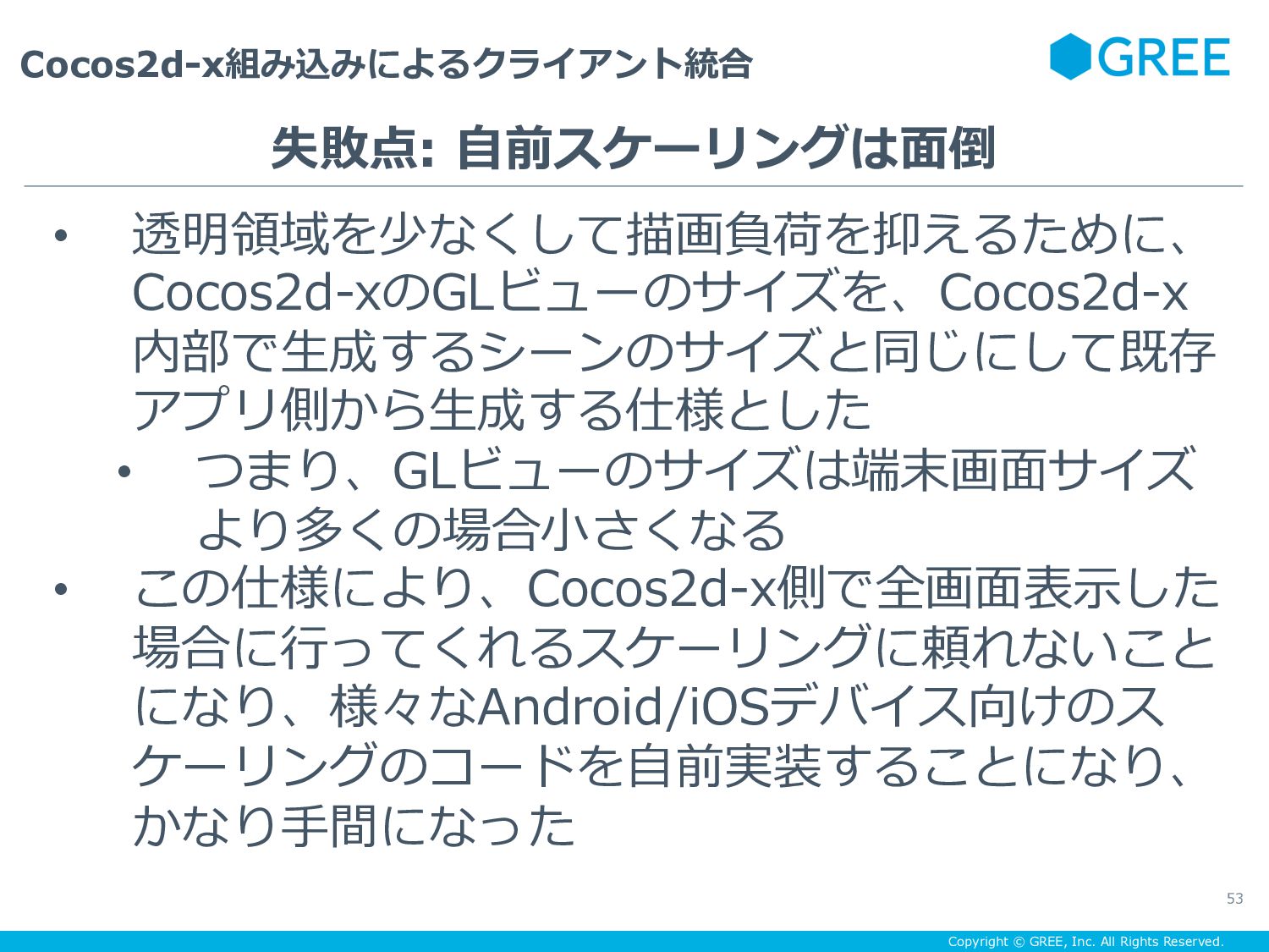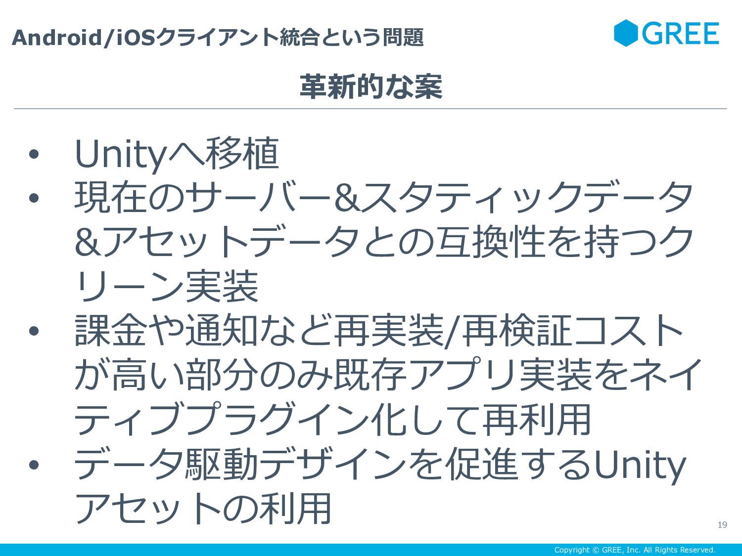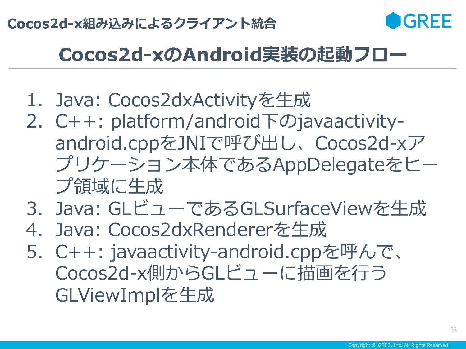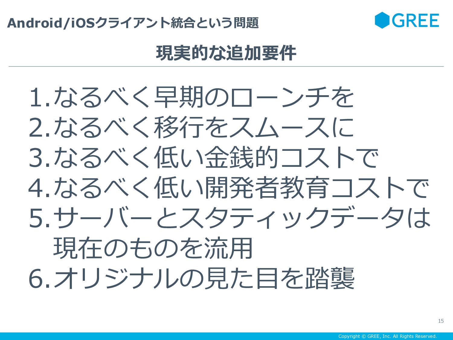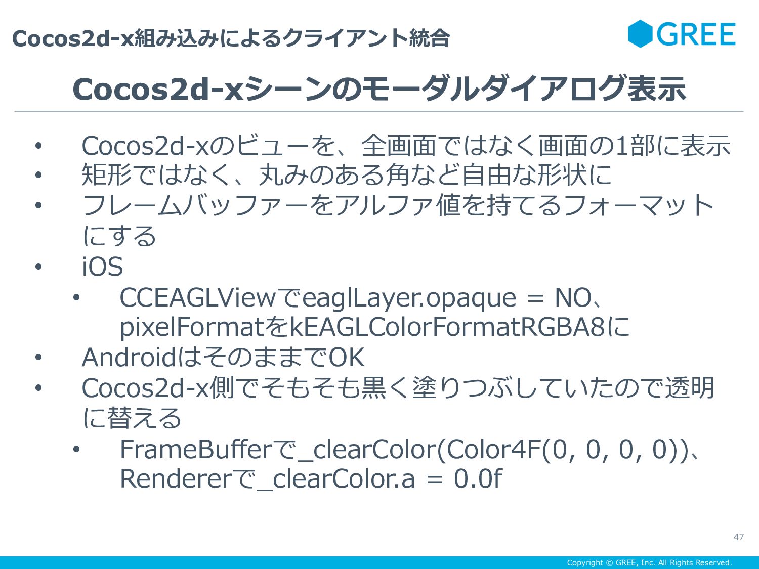 ピュアJavaまたはObjective-Cで別個に開発されたAndroid/iOS各プラットフォーム向けクライアントコードベースを、Cocos2d-xへの単純移植ではなく、既存アプリへのプラグインのようにCocos2d-x自体をまるごと組み込むこと(embed)により、移行のコストとリスクを最小限に抑制しつつ統合してゆく手法をご紹介いたします。