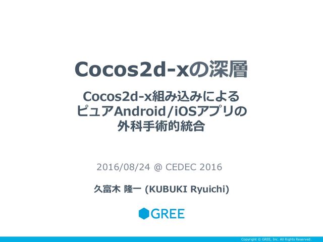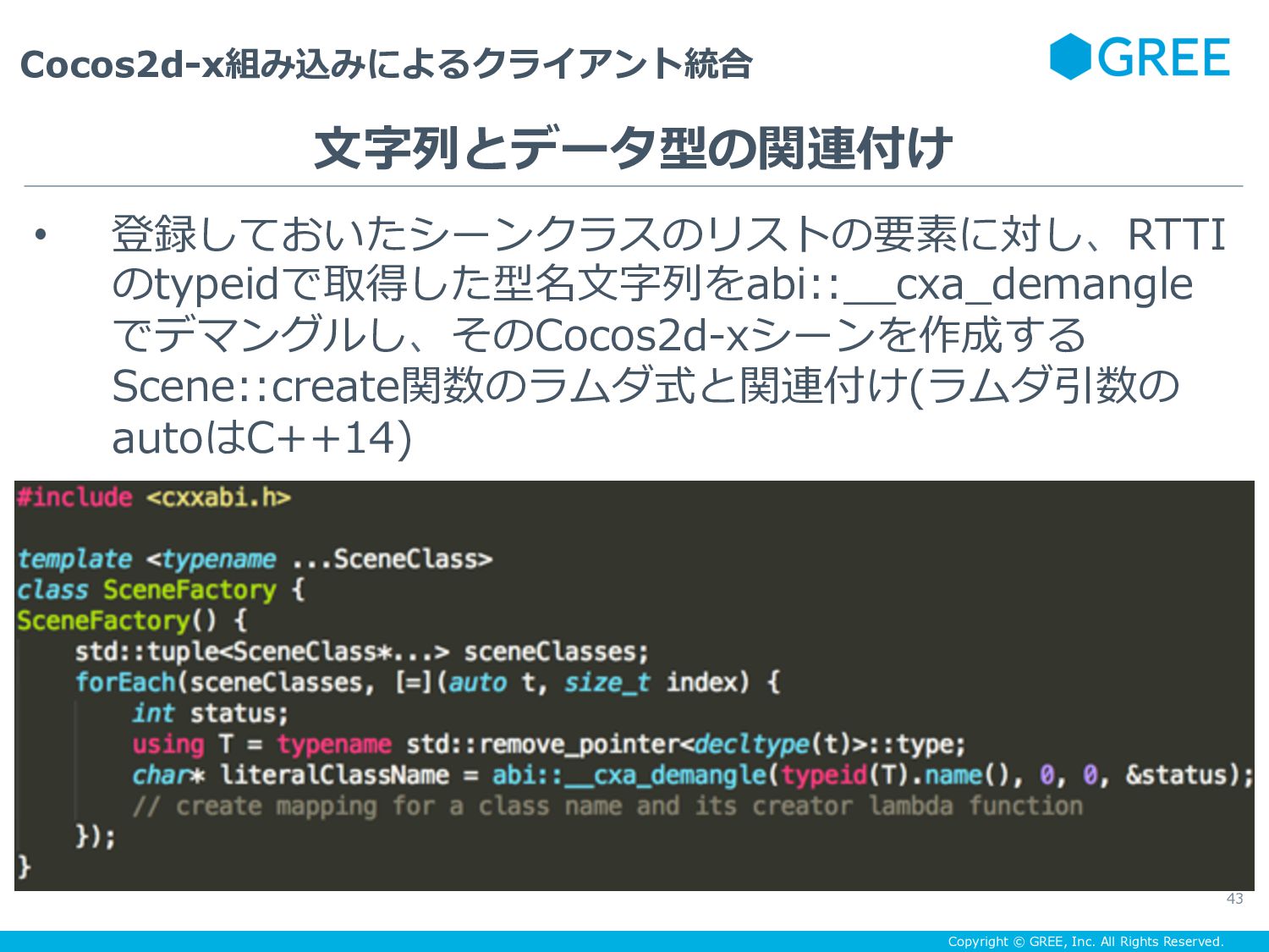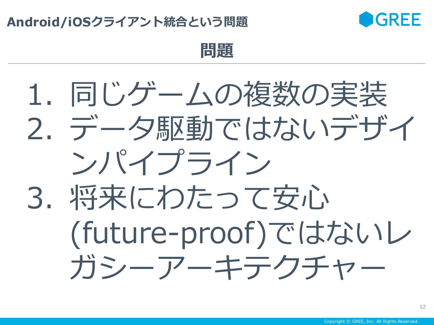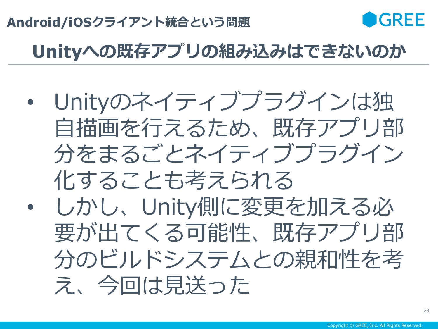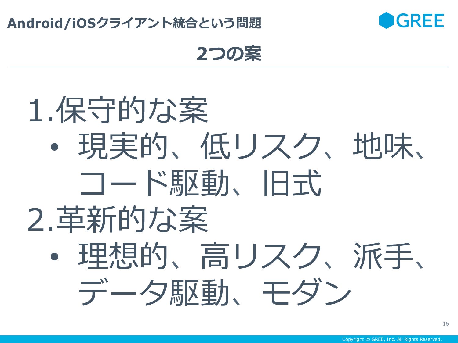 ピュアJavaまたはObjective-Cで別個に開発されたAndroid/iOS各プラットフォーム向けクライアントコードベースを、Cocos2d-xへの単純移植ではなく、既存アプリへのプラグインのようにCocos2d-x自体をまるごと組み込むこと(embed)により、移行のコストとリスクを最小限に抑制しつつ統合してゆく手法をご紹介いたします。