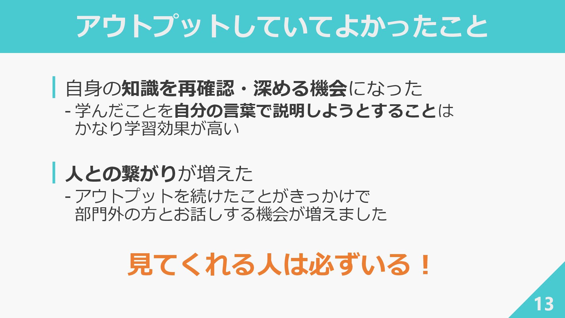 ┃自身の知識を再確認・深める機会になった ‐ 学んだことを自分の言葉で説明しようとすることは かなり学習効果が高い ┃人との繋がりが増えた ‐ アウトプットを続けたことがきっかけで 部門外の方とお話しする機会が増えました アウトプットしていてよかったこと 12
