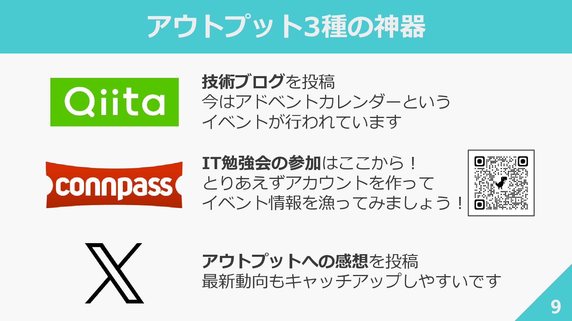 アウトプット3種の神器 9 技術ブログを投稿 今はアドベントカレンダーという イベントが行われています IT勉強会の参加はここから! とりあえずアカウントを作って イベント情報を漁ってみましょう! アウトプットへの感想を投稿 最新動向もキャッチアップしやすいです