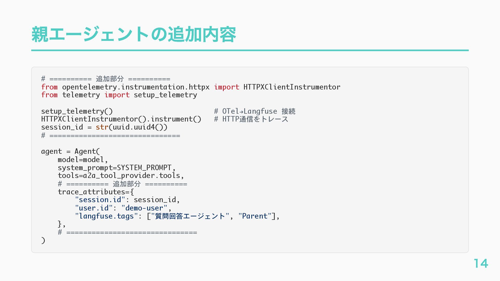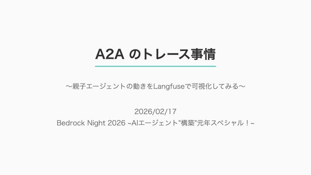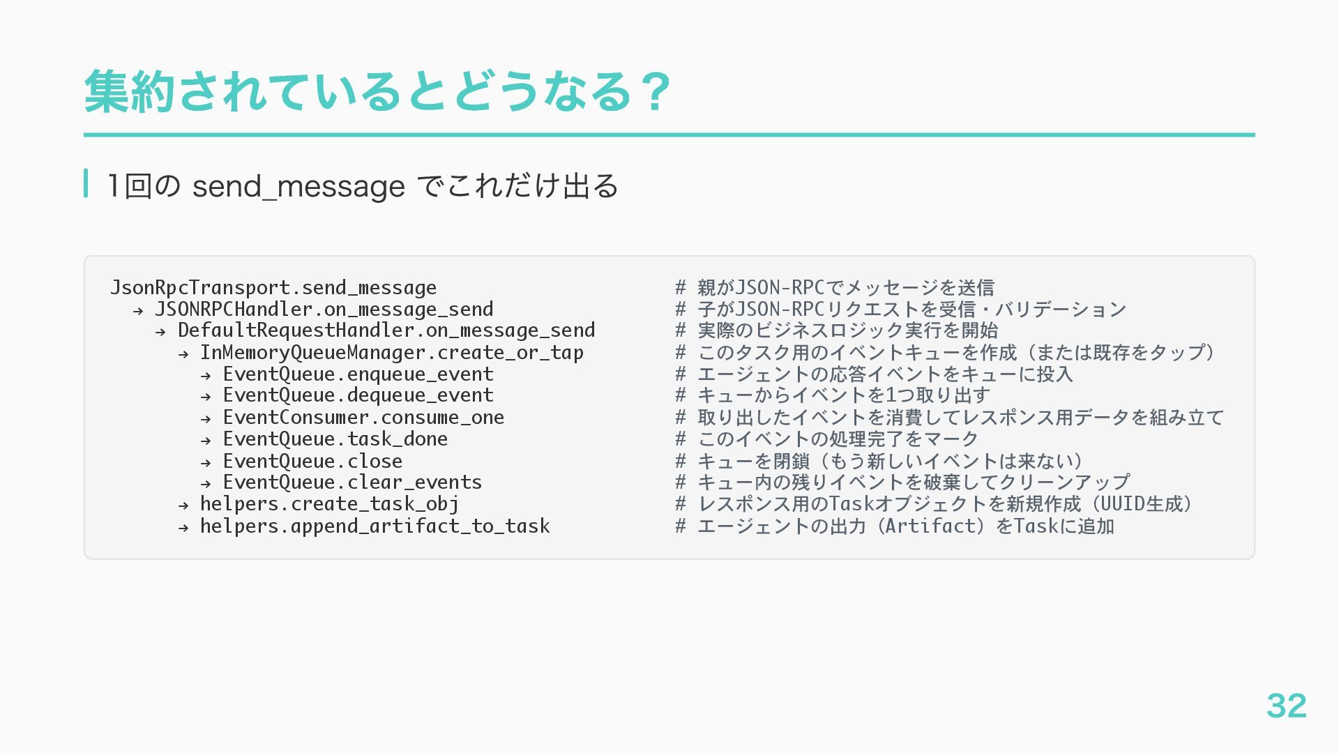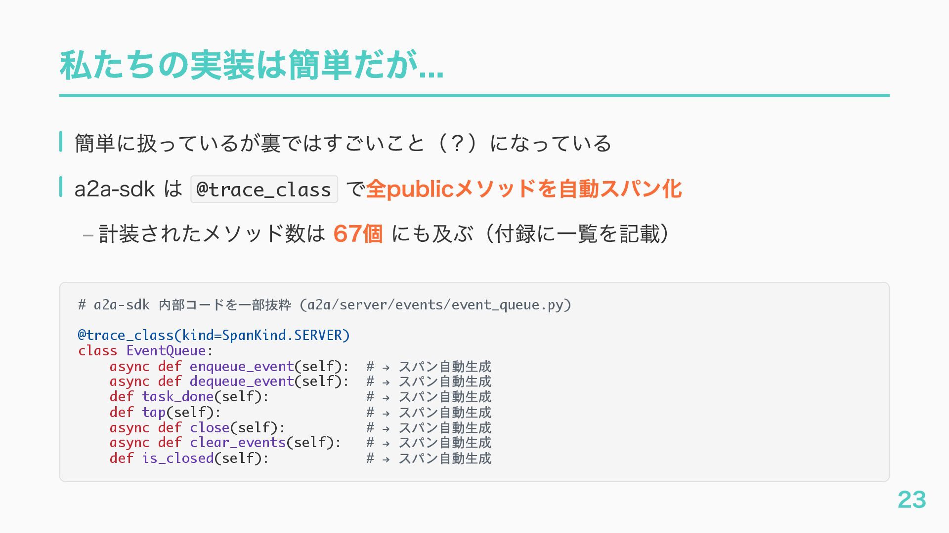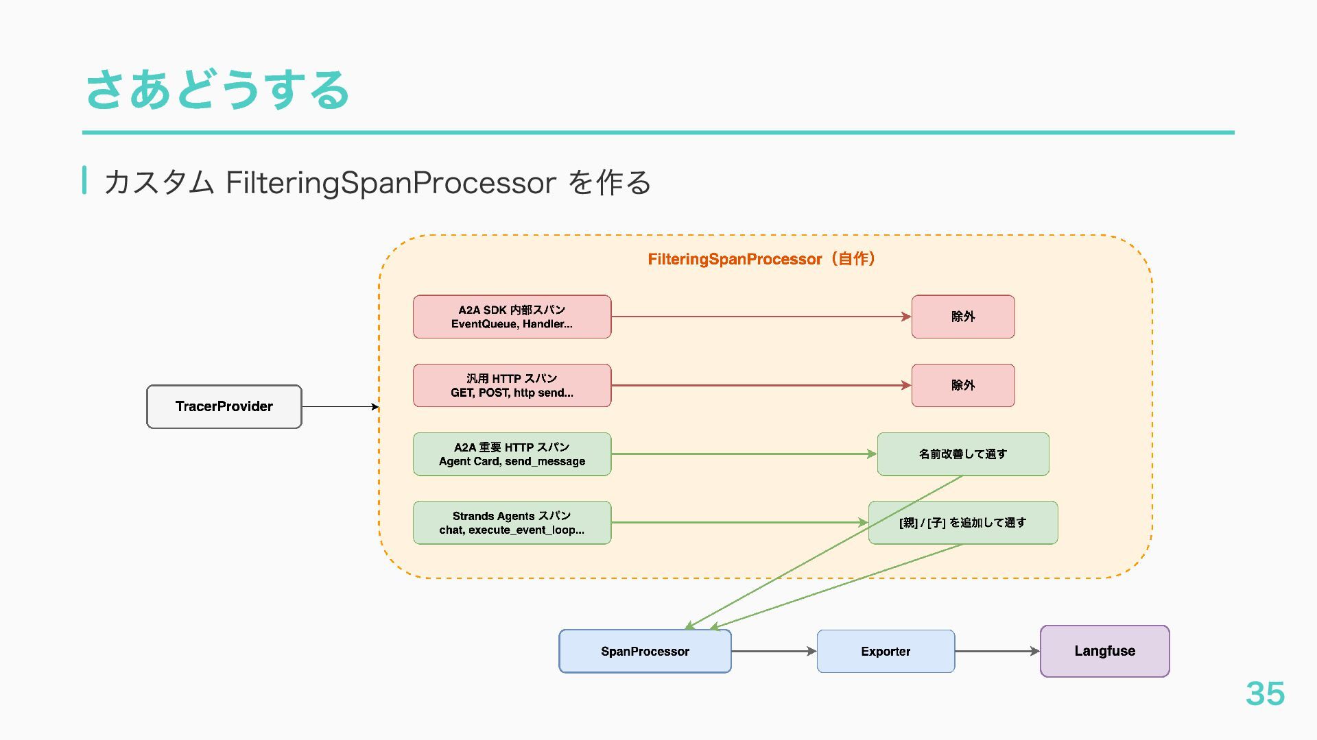 EventQueue関連 "a2a.server.events.event_queue.EventQueue.enqueue_event", "a2a.server.events.event_queue.EventQueue.dequeue_event", ... ] # A2Aプロトコルで重要なHTTPスパン(除外せずにキャッチする) A2A_IMPORTANT_HTTP_PATTERNS = [ "/.well-known/agent", # Agent Card取得(GET /.well-known/agent.json) "/jsonrpc", # JSON-RPC エンドポイント(send_message等) "send_message", # A2A send_message "tasks/sendSubscribe", # A2A streaming ] # スパン名にエージェント名を追加する対象 RENAME_TARGET_SPANS = [ "execute_event_loop_cycle", "chat", ] 36