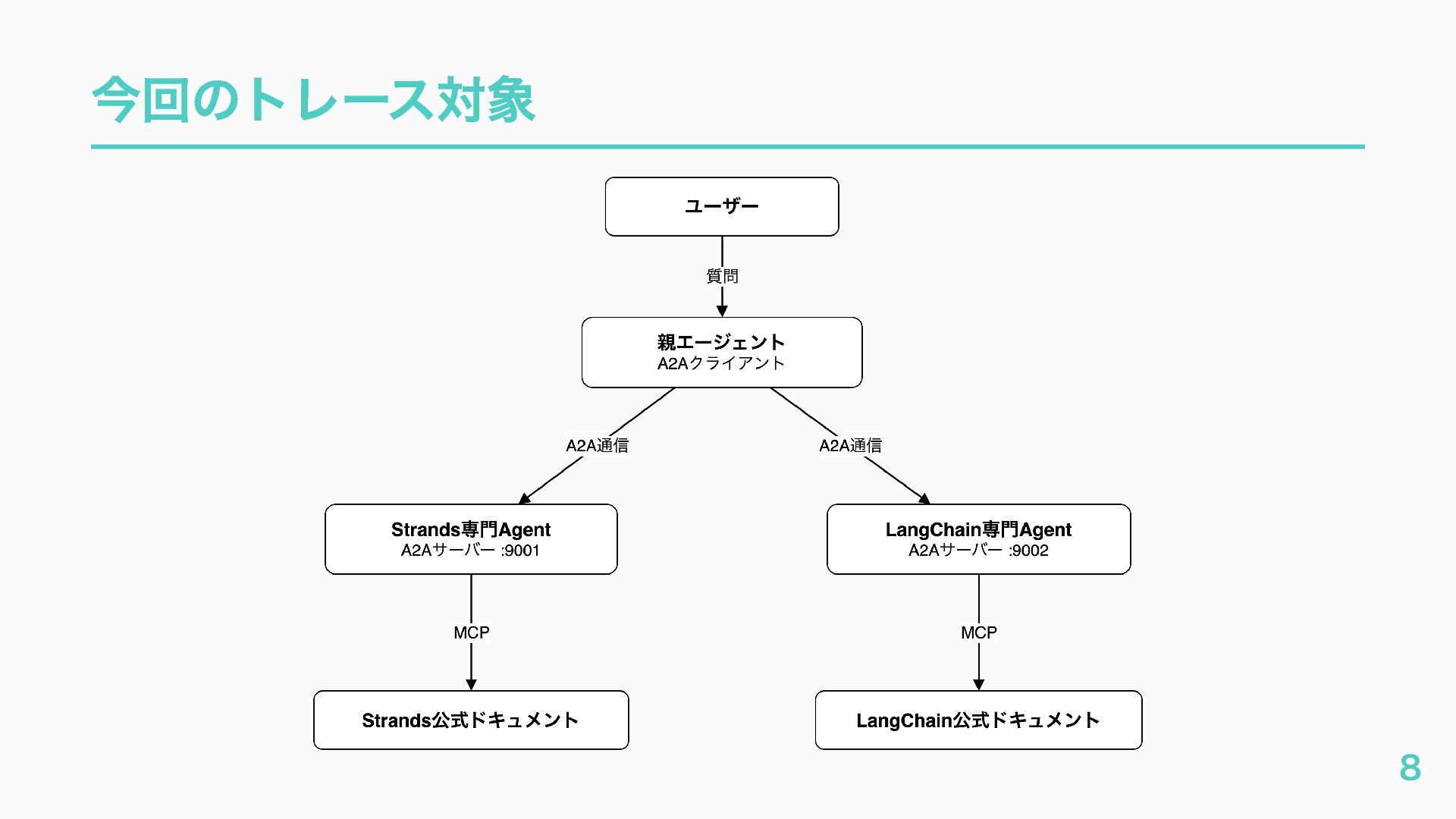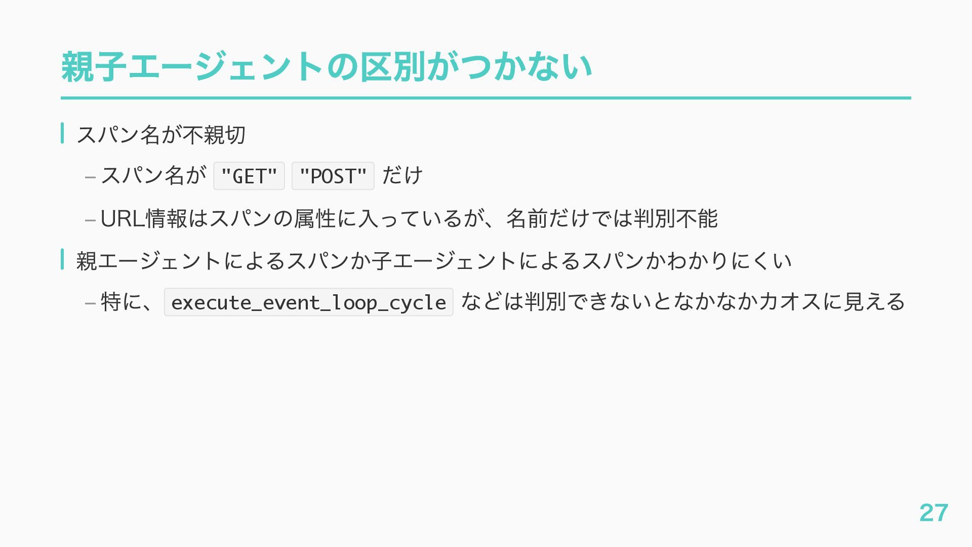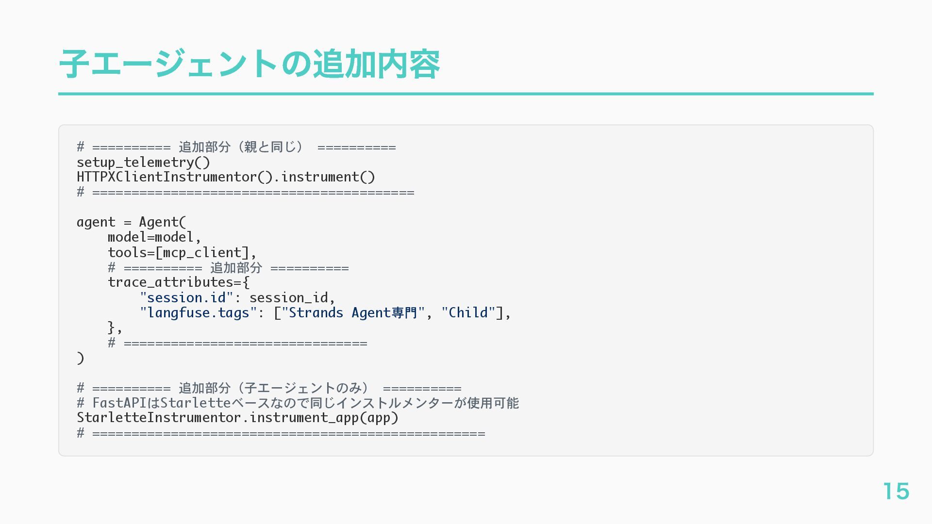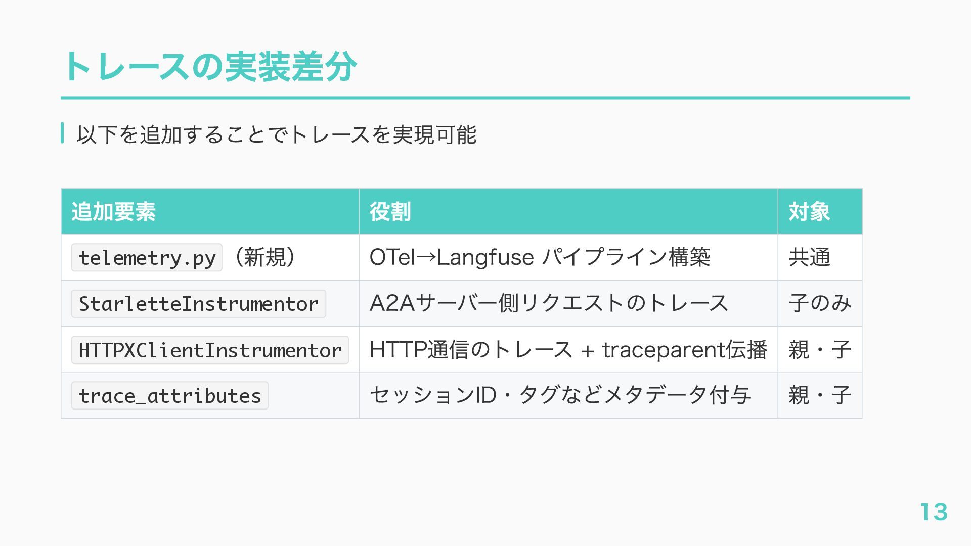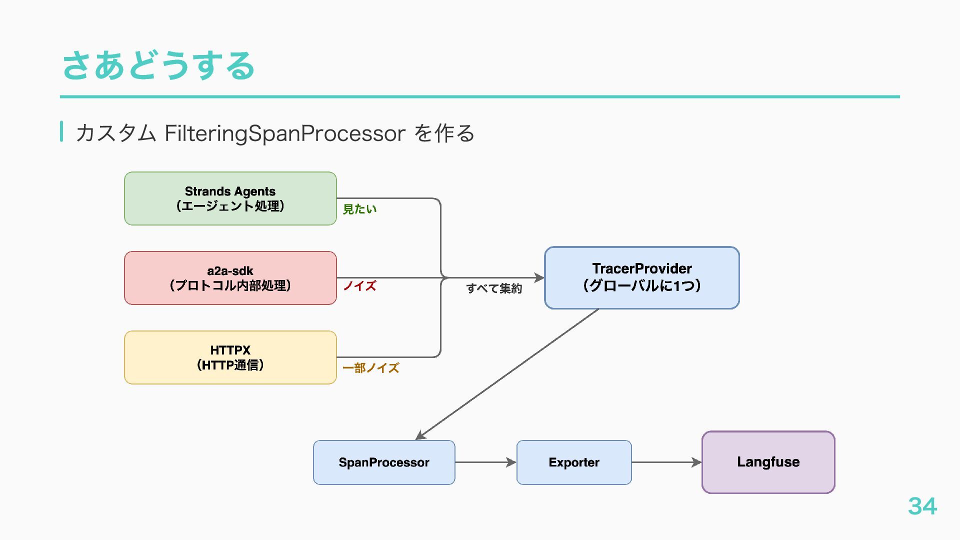 EventQueue関連 "a2a.server.events.event_queue.EventQueue.enqueue_event", "a2a.server.events.event_queue.EventQueue.dequeue_event", ... ] # A2Aプロトコルで重要なHTTPスパン(除外せずにキャッチする) A2A_IMPORTANT_HTTP_PATTERNS = [ "/.well-known/agent", # Agent Card取得(GET /.well-known/agent.json) "/jsonrpc", # JSON-RPC エンドポイント(send_message等) "send_message", # A2A send_message "tasks/sendSubscribe", # A2A streaming ] # スパン名にエージェント名を追加する対象 RENAME_TARGET_SPANS = [ "execute_event_loop_cycle", "chat", ] 36