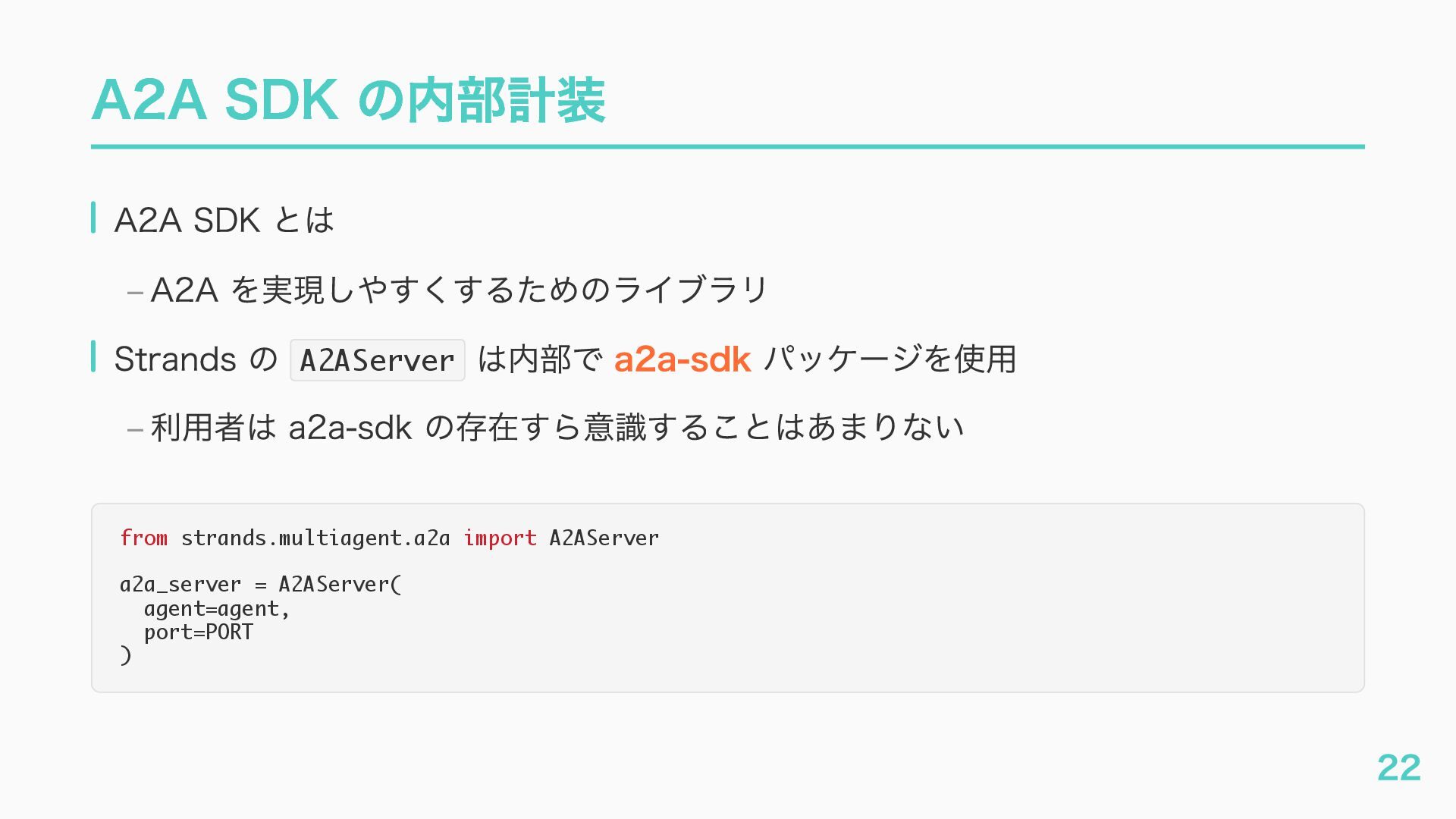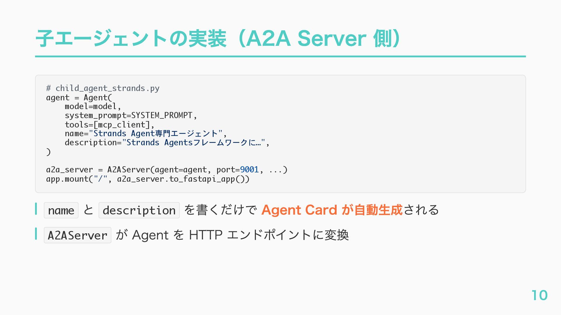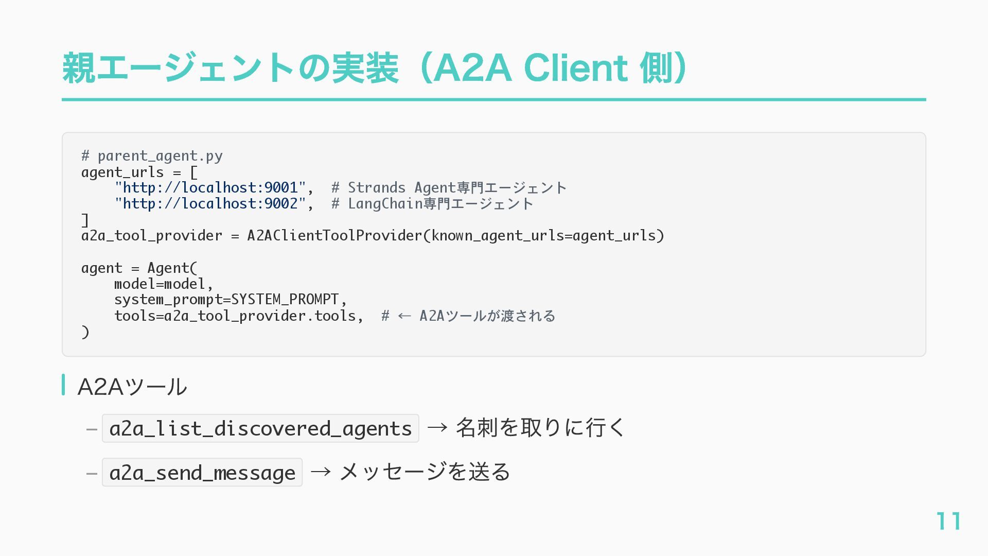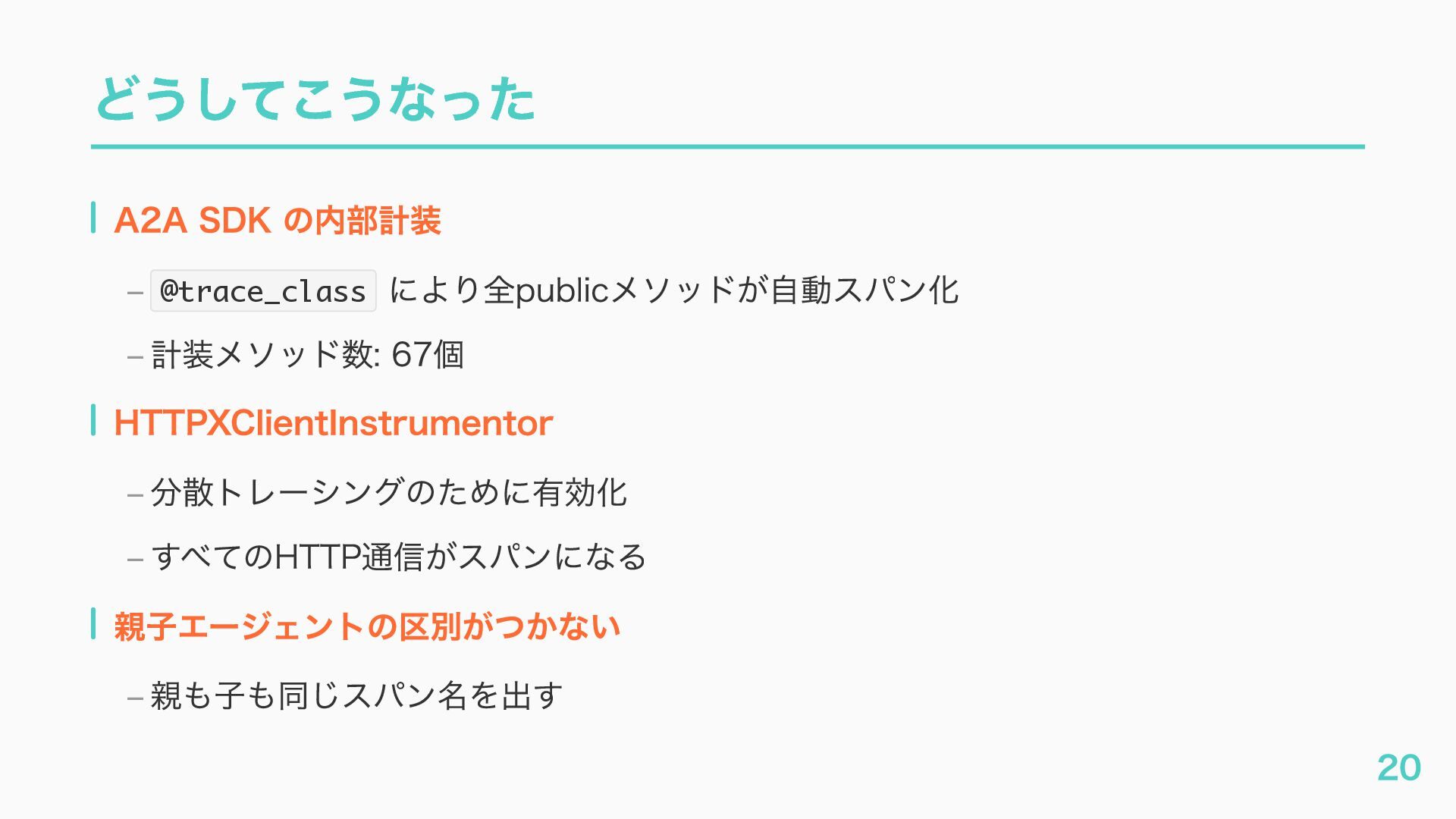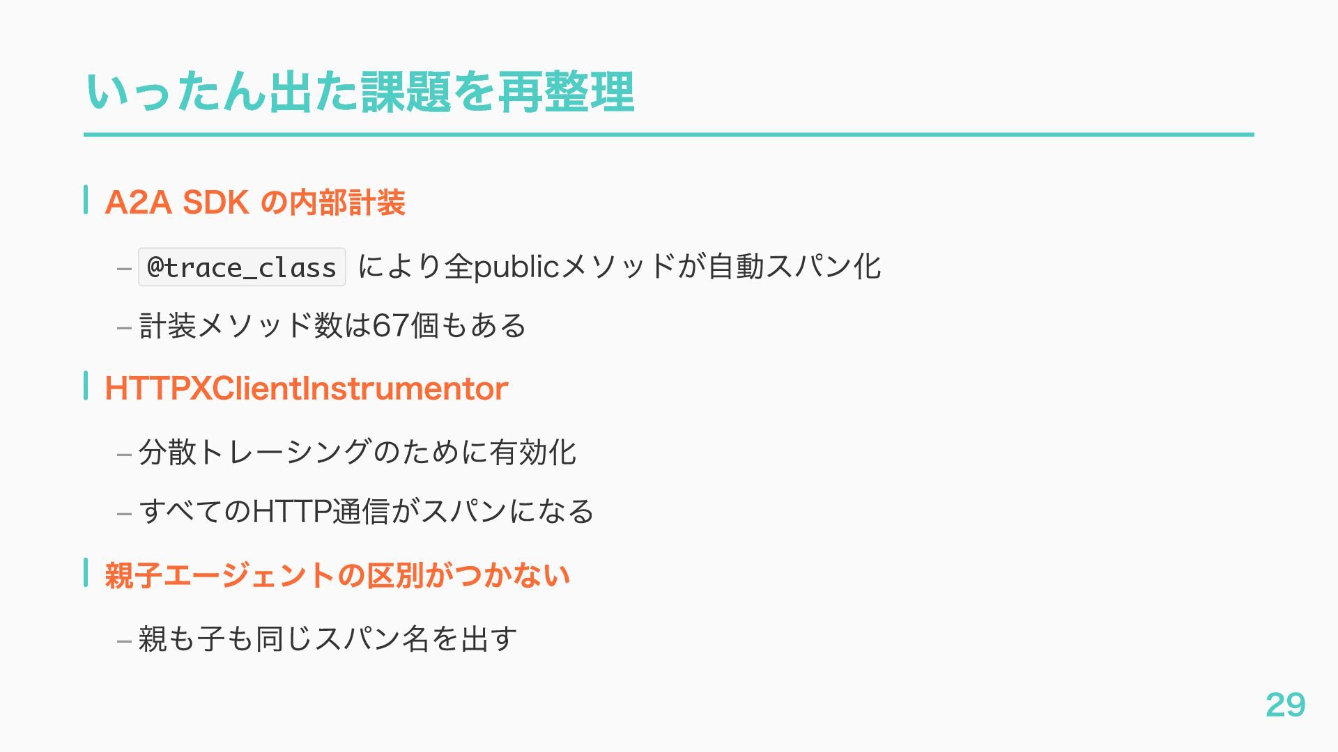 EventQueue関連 "a2a.server.events.event_queue.EventQueue.enqueue_event", "a2a.server.events.event_queue.EventQueue.dequeue_event", ... ] # A2Aプロトコルで重要なHTTPスパン(除外せずにキャッチする) A2A_IMPORTANT_HTTP_PATTERNS = [ "/.well-known/agent", # Agent Card取得(GET /.well-known/agent.json) "/jsonrpc", # JSON-RPC エンドポイント(send_message等) "send_message", # A2A send_message "tasks/sendSubscribe", # A2A streaming ] # スパン名にエージェント名を追加する対象 RENAME_TARGET_SPANS = [ "execute_event_loop_cycle", "chat", ] 36