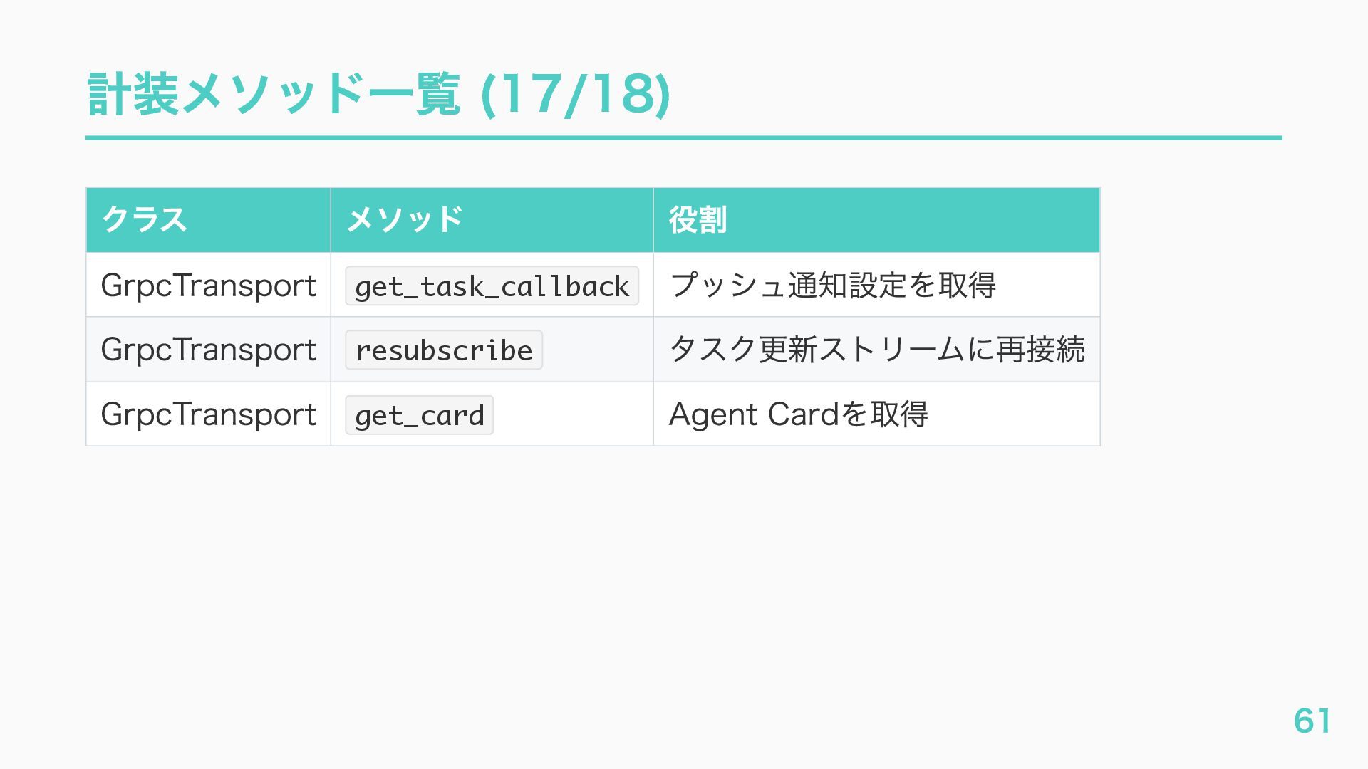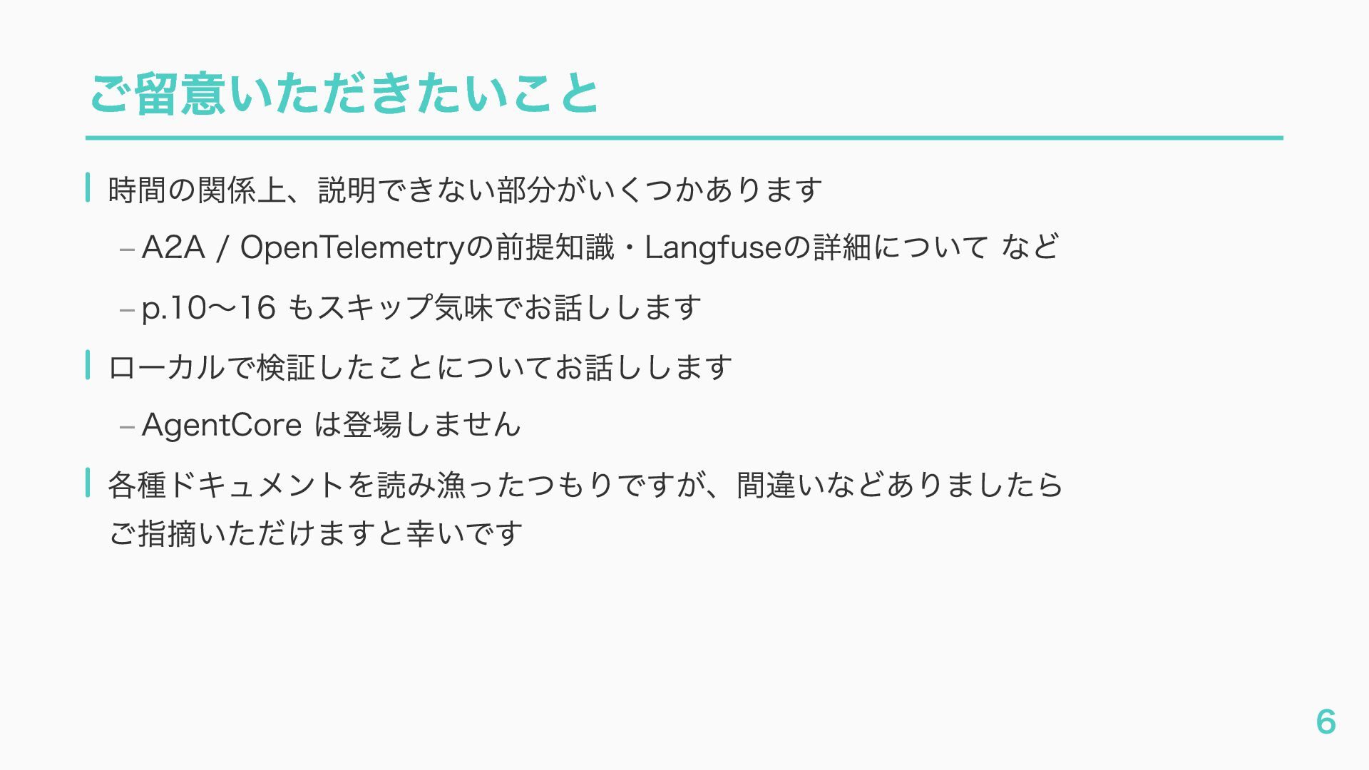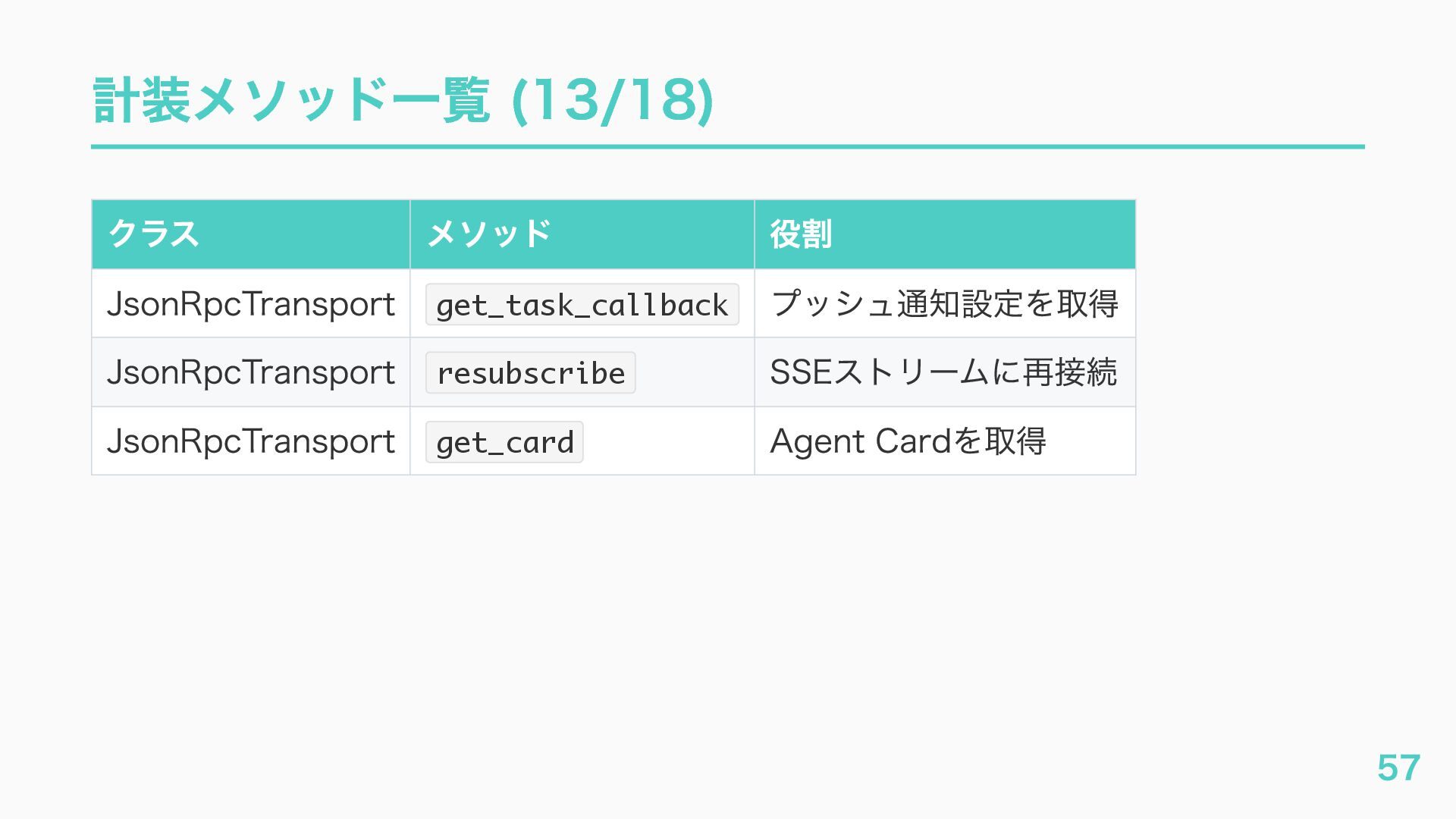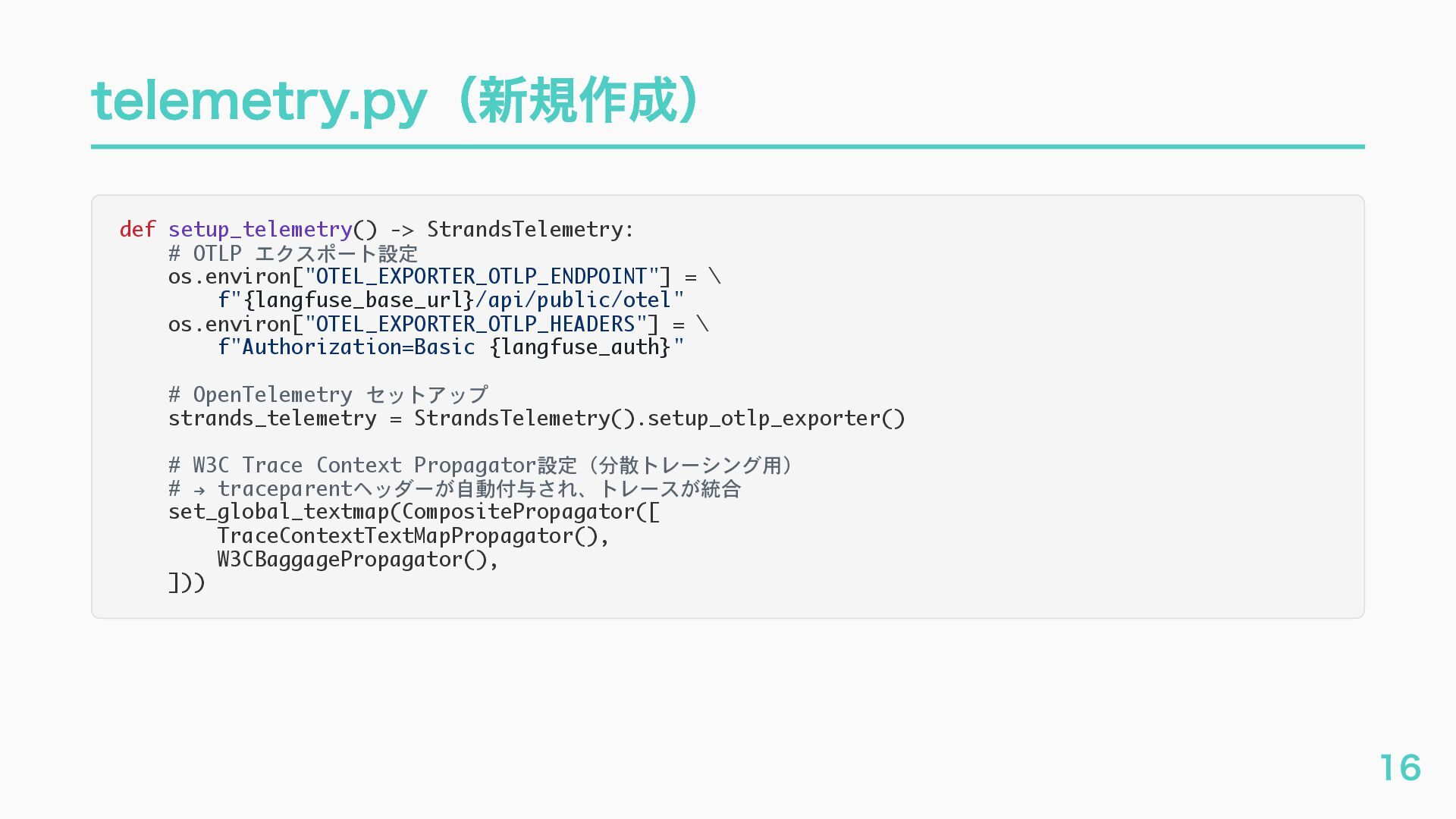 EventQueue関連 "a2a.server.events.event_queue.EventQueue.enqueue_event", "a2a.server.events.event_queue.EventQueue.dequeue_event", ... ] # A2Aプロトコルで重要なHTTPスパン(除外せずにキャッチする) A2A_IMPORTANT_HTTP_PATTERNS = [ "/.well-known/agent", # Agent Card取得(GET /.well-known/agent.json) "/jsonrpc", # JSON-RPC エンドポイント(send_message等) "send_message", # A2A send_message "tasks/sendSubscribe", # A2A streaming ] # スパン名にエージェント名を追加する対象 RENAME_TARGET_SPANS = [ "execute_event_loop_cycle", "chat", ] 36