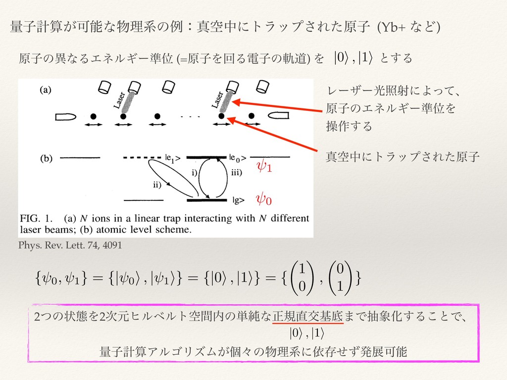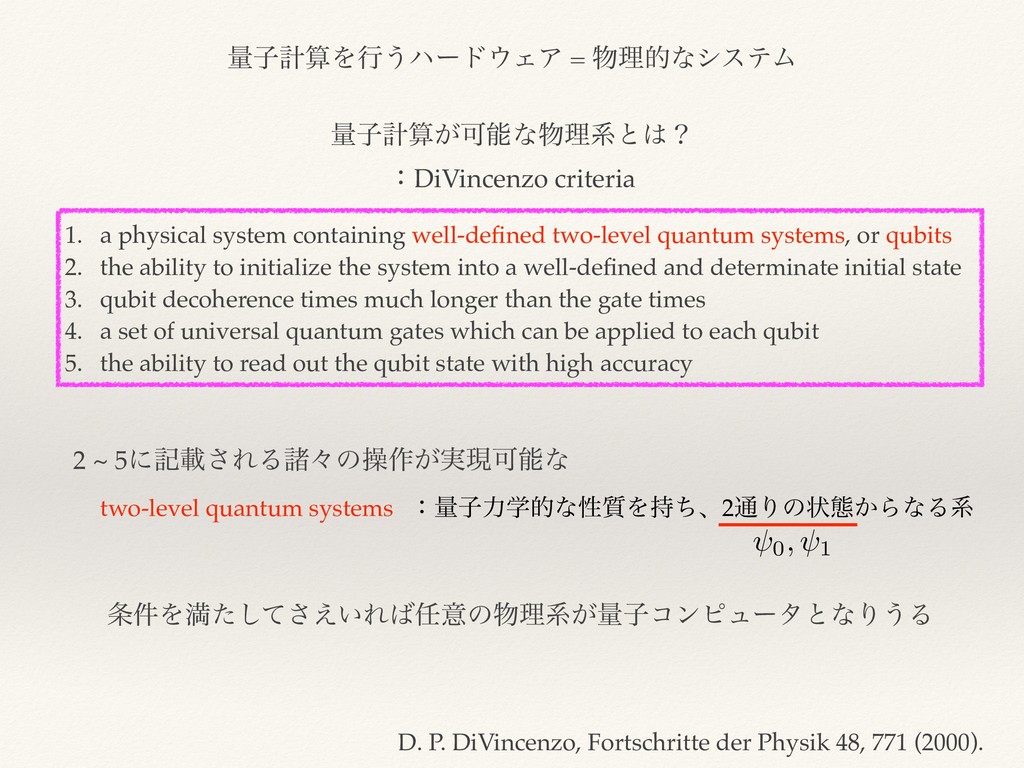 containing well-defined two-level quantum systems, or qubits 2. the ability to initialize the system into a well-defined and determinate initial state 3. qubit decoherence times much longer than the gate times 4. a set of universal quantum gates which can be applied to each qubit 5. the ability to read out the qubit state with high accuracy D. P. DiVincenzo, Fortschritte der Physik 48, 771 (2000). two-level quantum systems 2 ~ 5ʹهࡌ͞ΕΔॾʑͷૢ࡞͕࣮ݱՄೳͳ ɿྔࢠྗֶతͳੑ࣭Λ࣋ͪɺ2௨Γͷঢ়ଶ͔ΒͳΔܥ ݅Λຬ͍ͨͯ͑͠͞Εҙͷཧܥ͕ྔࢠίϯϐϡʔλͱͳΓ͏Δ 0, 1 <latexit sha1_base64="IUwxB2kvN8gMgeWPqyIRENd5QyU=">AAACt3ichVHLSsNQED3GV3226kZwUyyKCymTKvhYFd249FUVfJQk3taLeZmkhVr6A/6AgisFF+JnuBH3LvwEcangxoWTNCAq6oRkZs6dMzlzR3dN6QdEjy1Ka1t7R2eiq7unt68/mRoY3PCdimeIguGYjrela74wpS0KgQxMseV6QrN0U2zqh4vh+WZVeL507PWg5opdSyvbsiQNLWBob8f1ZZEm05FXi6kMZSmy9M9AjYMMYlt2UvfYwT4cGKjAgoCNgGMTGnx+tqGC4DK2izpjHkcyOhdooJu5Fa4SXKExesjfMmfbMWpzHvb0I7bBfzH59ZiZxhg90DW90B3d0BO9/9qrHvUItdTY602ucIvJk+G1t39ZFvsAB5+sPzUHKGE20ipZuxsh4RRGk189Pn1Zm18dq4/TJT2z/gt6pFuewK6+GlcrYvX8Dz06z61xLrjn7zcX1llo8BrV70v7GWzksupUNrcynckvxAtNYASjmOCtzSCPJSyjwN09nOECl8qcUlRKykGzVGmJOUP4YsrRB2sgnW8=</latexit>