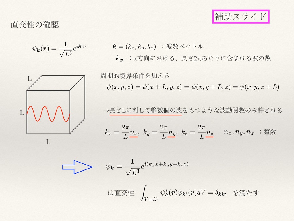 (kx, ky, kz) <latexit sha1_base64="5aBJDpaL7qj4U+pDxiPB886tp54=">AAACw3ichVHLSsNAFD3G97vqRnATLBUFKVMVFEEQRXDpq62gEpI41ZAnybRYS/0Af8CFK0UXIvoTbsS9Cz9BXFZw48KbNCAq6h0yc++Ze27Onat5lhEIxp4apMam5pbWtvaOzq7unt5EX38ucIu+zrO6a7n+pqYG3DIcnhWGsPim53PV1iye18zF8D5f4n5guM6GKHt8x1b3HKNg6KogSEkMbmt2xazKc/KoqRyMy6ZSDrfDMSWRZGkWmfzTycROErGtuIkHbGMXLnQUYYPDgSDfgoqA1hYyYPAI20GFMJ88I7rnqKKDuEXK4pShEmrSvkfRVow6FIc1g4it018s+nxiykixR3bFauyeXbNn9v5rrUpUI9RSplOrc7mn9B4Prr/9y7LpFNj/ZP2pWaCAmUirQdq9CAm70Ov80uFJbX12LVUZYefshfSfsSd2Rx04pVf9cpWvnf6hR6O+VYo51fz95cI8G1UaY+b70H46uYl0ZjI9sTqVnF+IB9qGIQxjlKY2jXksYwVZqn6EC9zgVlqSTMmXRD1Vaog5A/hiUvUDiPahBg==</latexit> ɿϕΫτϧ kx <latexit sha1_base64="i+GRJ5nsQW4JxQhO69J0p+TQ0QU=">AAACrHichVE9SwNBEH05v+NHojaCTTAoVmETBcUqaGOZGKNCDOHu3MQl98XdJhiDf0Cw1cJKwUL8GTZib5GfIJYRbCycuxyIijrH3s68nTf7ZkdzDOFJxjoRpa9/YHBoeCQ6OjY+EYtPTu14dsPVeVG3Ddvd01SPG8LiRSmkwfccl6umZvBdrb7hn+82uesJ29qWLYeXTbVmiarQVUlQoV45qsSTLMUCS/x00qGTRGg5O/6IfRzAho4GTHBYkOQbUOHRV0IaDA5hZbQJc8kTwTnHCaLEbVAWpwyV0Dr9axSVQtSi2K/pBWydbjFoucRMYJ49sVvWZQ/sjj2z919rtYMavpYW7VqPy51K7HSm8PYvy6Rd4vCT9admiSpWA62CtDsB4neh9/jN44tuYW1rvr3ArtkL6b9iHXZPHVjNV/0mz7cu/9CjUd8qxZxq/v5yfp6JExpj+vvQfjo7mVR6KZXJLyez6+FAhzGLOSzS1FaQxSZyKFL1Gs5wjgslpWwrJaXcS1UiIWcaX0ypfgDIFZmI</latexit> ɿxํʹ͓͚Δɺ͞2"͋ͨΓʹؚ·ΕΔͷ L L L पظతڥք݅ΛՃ͑Δ (x, y, z) = (x + L, y, z) = (x, y + L, z) = (x, y, z + L) <latexit sha1_base64="y6sCPqA4z1f4FW0I+qde1F2+JgY=">AAAC4HichVE7S8NQFP4aX/XZqovgUiyKYim3PlAEQXRxcPBVFVRKEm/rxbxI0mJbuouLOAk6KTiIv0JcRGcHf4I4Krg4eJIGfKGekNzvO/d8J9+9R7E04biMPYSkmtq6+oZwY1NzS2tbJNreseKYeVvladXUTHtNkR2uCYOnXeFqfM2yuawrGl9Vdma8/dUCtx1hGstu0eKbupwzRFaoskupTHR0w3JE/26imCgNTFbx4NxnligS/8QSpcG5gUw0zpLMj9hPkApAHEHMm9FbbGALJlTkoYPDgEtYgwyHnnWkwGBRbhNlytmEhL/PUUETafNUxalCpuwOfXPE1oOsQdzr6fhqlf6i0WuTMoZeds8u2DO7YZfskb392qvs9/C8FGlVqlpuZSL7XUuv/6p0Wl1sf6j+9Owii3HfqyDvlp/xTqFW9YXS0fPSxGJvuY+dsSfyf8oe2DWdwCi8qOcLfPHkDz8KnVsmzqnn7zfn1emo0BhT34f2E6wMJVPDyaGFkfjUdDDQMLrRg36a2himMIt5pKn7Ca5wiztJkfakA+mwWiqFAk0nvoR0/A5u9Kt3</latexit> →͞Lʹରͯ͠ݸͷΛͭΑ͏ͳಈؔͷΈڐ͞ΕΔ kx = 2⇡ L nx, ky = 2⇡ L ny, kz = 2⇡ L nz <latexit sha1_base64="di83r//Kkk8EN+6l1RxIKK/iI4E=">AAAC9nichVFLS+NQFP7M+H52xo0wm2BRXEi57Qw4DAyIsxlwFr5aBSshibd6aV4kaWkb+gf8Ay4GBmZARNzob3Aj7kW606W4VHDjwpM0IGqrJyT3nO+c7+Q792iOITyfsUaH9KGzq7unt69/YHBoeCTx8VPOs0uuzrO6bdjumqZ63BAWz/rCN/ia43LV1Ay+qhV/hvnVMnc9YVsrftXhG6a6ZYmC0FWfICUxX1Qq8g85X3BVPcjkHVEPftctpTKdl4tKtUWmGmVqLTI1JZFkKRaZ/NpJx04SsS3YiTPksQkbOkowwWHBJ9+ACo+edaTB4BC2gYAwlzwR5Tnq6Cduiao4VaiEFum7RdF6jFoUhz29iK3TXwx6XWLKmGDn7IDdslN2yK7ZQ9teQdQj1FKlU2tyuaOM7Iwt37/LMun0sf3EelOzjwK+RVoFaXciJJxCb/LLtd3b5e9LE8Ek+89uSP8/1mAnNIFVvtP3FvnSnzf0aDS3SjGnnu1vLqwzUac1pl8u7bWTy6TSX1KZxa/J2bl4ob34jHFM0dZmMItfWECWuh/jApe4kirSX2lP2m+WSh0xZxTPTDp6BOMctno=</latexit> ɿ nx, ny, nz <latexit sha1_base64="GfkP6tulIP7hXEkbKavKhlUtEU4=">AAACtnichVHLSsNAFD3GV3226kZwUyyKCymTKlhcFd24rI+qoDUkcayheZlMi23pD/gDXbixggvxM9yIexd+grhUcOPCmzQgKuodMnPvmXtuzp2ruabhC8Yeu6Tunt6+/tjA4NDwyGg8MTa+7TsVT+cF3TEdb1dTfW4aNi8IQ5h81/W4amkm39HKq8H9TpV7vuHYW6Lm8qKllmzjyNBVQVDRVk7nk7ZSC7a6kkixNAst+dORIyeFyPJO4h77OIQDHRVY4LAhyDehwqe1BxkMLmFFNAjzyDPCe44mBolboSxOGSqhZdpLFO1FqE1xUNMP2Tr9xaTPI2YSM+yBXbMXdsdu2BN7/7VWI6wRaKnRqXW43FXiZ5Obb/+yLDoFjj9Zf2oWOEI21GqQdjdEgi70Dr9ab71sLm/MNGbZJXsm/W32yG6pA7v6ql+t843zP/Ro1LdKMaeav79ckGehSWOUvw/tp7OdScsL6cz6Yiq3Eg00hilMY46mtoQc1pBHgaqfoIULtKWsdCBxqdRJlboizgS+mOR+AIeynRQ=</latexit> k = 1 p L3 ei(kxx+kyy+kzz) <latexit sha1_base64="47LMQXHzkmdTYNnitjG3c9cCbmk=">AAAC7XichVFLa9RQFP4aX219dGo3BTcXh0pFGG5awSIIpd24cNHXtIWmDUm8017yNLkzdOaSP9B96aIiKIiKP8ONdOFOtD9BXFZw48KTTEC0tJ6QnHO+e76T79zjJoHMFOfHA8aFi5cuXxkcGr567fqNkdrozdUsbqeeaHpxEKfrrpOJQEaiqaQKxHqSCid0A7Hm+vPF+VpHpJmMoxXVTcRm6GxHsiU9RxFk1+asJJO2ttxQ+3nOHjGrlTqeNnNtZc9SpZ9sTRMstpiWk769y3bZPebbXdYtfY/17uZ2rc4bvDR2OjCroI7KFuLaESw8RQwPbYQQiKAoDuAgo2cDJjgSwjahCUspkuW5QI5h4rapSlCFQ6hP323KNio0orzomZVsj/4S0JsSk2GCf+bv+An/yN/zb/zXmb102aPQ0iXv9rkisUf2xpd//pcVklfY+cM6V7NCCzOlVknakxIppvD6/E7v4GT54dKEvsNf8e+k/yU/5h9ogqjzw3u9KJYOz9Hj0twO5YJ6nn1zRV2IYo3mv0s7HaxONczpxtTi/frsXLXQQdzCbUzS1h5gFo+xgCZ1f4tP+IKvRmzsG8+NF/1SY6DijOEvM978Bs1csio=</latexit> ަੑ Λຬͨ͢ Z V =L3 ⇤ k (r) k0 (r)dV = kk0 <latexit sha1_base64="MGwXOR6+JG7dGnfmsqC3f8PGSA4=">AAADAHichVE9T9tQFD24X4GWEmBBYrEa8dEO0QtUAlVCQrB0YOCjCUgYLNt5gaf4S/ZLpGB56dg/wNCpSJVADKhrO3apundg7AiMILEwcO04oi2CXst+5513z/W575q+LULJ2HGX8uDho8dPct09T5/1Pu/L9w9UQq8RWLxsebYXrJlGyG3h8rIU0uZrfsANx7T5qlmfT85XmzwIhee+ky2fbzjGlitqwjIkUXq+rAlX6lFlZmFzMlY1PxR6pJlOVI/jzVfjCQril3/QY3HcYasVdUbVqtyWRkfTSdHzBVZkaai3QSkDBWSx6OV/QkMVHiw04IDDhSRsw0BIzzpKYPCJ20BEXEBIpOccMXpI26AsThkGsXX6btFuPWNd2ic1w1Rt0V9segNSqhhhv9gBO2c/2CE7YVd31orSGomXFq1mW8t9ve/D0Mrlf1UOrRLbN6p7PUvUMJ16FeTdT5mkC6utb+7snq+8WR6JRtkeOyP/n9gx+04duM0L6/MSX/54jx+T+jZoz6nm3TeX5DlIxlj6d2i3QWWiWJosTiy9LszOZQPNYRgvME5Tm8Is3mIRZar+Db9xijPlvbKvHClf2qlKV6YZxF+hfL0Ggtq8BQ==</latexit> ަੑͷ֬ೝ ิॿεϥΠυ