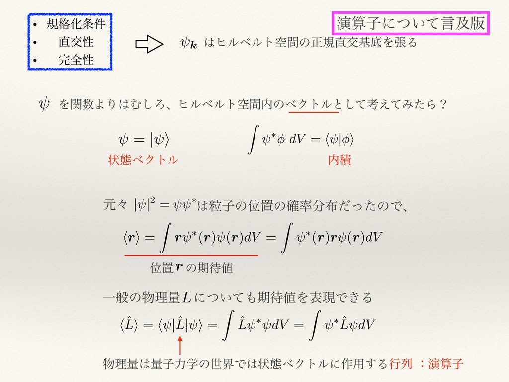 ަੑ • શੑ Z ⇤ dV = h | i <latexit sha1_base64="6fIKy+1cVFWLe/c8/adPTYK+OuE=">AAAC1HichVE7LwRRFP6M93vRSDQTG4JicxcJkUiERum1S2LYzIyLm51XZu5uwlKJRkGpUJEoRK2l0Ihe4SeIkkSjcGZ2EkFwJjPn3O+c78x37jE8SwSSsccKpbKquqa2rr6hsam5pTXR1p4N3IJv8ozpWq6/ZOgBt4TDM1JIiy95Ptdtw+KLRn4qzC8WuR8I11mQWx5fsfUNR6wLU5cE5RL9mnCkqnmBWB0gtyk0dS2rjqua4et5LkthZifEd3OJJEuxyNSfQToOkohtxk3cQ8MaXJgowAaHA0mxBR0BPctIg8EjbAUlwnyKRJTn2EUDcQtUxalCJzRP3w06LceoQ+ewZxCxTfqLRa9PTBU97IFdsBd2xy7ZE3v/tVcp6hFq2SJvlLncy7UedM6//cuyyUtsfrL+1CyxjtFIqyDtXoSEU5hlfnH7+GV+bK6n1MvO2DPpP2WP7JYmcIqv5vksnzv5Q49Bc+t05tTz95sL62yEa0x/X9rPIDuYSg+lBmeHkxOT8ULr0IVu9NHWRjCBacwgQ92PcIVr3ChZZUfZU/bLpUpFzOnAF1MOPwA6gajo</latexit> = | i <latexit sha1_base64="VjhsDkxI/60c3vQltnMXqqFbzWY=">AAACvHichVHLSsNAFD2Nr/quuhHcFEvFVZlWQRGUohuXWq0W2lKSOOrQvEimlVr6A/6AC3GhoCJ+hhtx78JPEJcKblx4kwZERb0hmTNn7rk5d67mGMKTjD1GlI7Oru6eaG9f/8Dg0HBsZHTLs2uuzvO6bdhuQVM9bgiL56WQBi84LldNzeDbWnXFP9+uc9cTtrUpGw4vm+qeJXaFrkqiKrGRkuOJ+GK8VOWy6eNWJZZgKRZE/CdIhyCBMNbs2D1K2IENHTWY4LAgCRtQ4dFTRBoMDnFlNIlzCYngnKOFPtLWKItThkpslb57tCuGrEV7v6YXqHX6i0GvS8o4kuyBXbMXdsdu2BN7/7VWM6jhe2nQqrW13KkMH41vvP2rMmmV2P9U/elZYhfzgVdB3p2A8bvQ2/r64fHLxkIu2Zxi5+yZ/J+xR3ZLHVj1V/1inedO/vCjUd8q7TnV/P3m/DwT/hjT34f2E2xlUumZVGZ9NpFdDgcaxQQmMU1Tm0MWq1hDnqof4BSXuFKWlB2lqpjtVCUSasbwJZT6B0SZn2g=</latexit> hri = Z r ⇤(r) (r)dV = Z ⇤(r)r (r)dV <latexit sha1_base64="ky8MGdnuSNXlWQGlG+/YGUlXG/k=">AAADEnichVFNSxtRFD1OrU3TalLdCN0MDRZ1EV7SQosgiG661Gii4GiYGZ/xkfli5iWQDvkDrgUXrix0UfoPuivZFGmXLvwJpcsUulHwzkf9RL3DzLvnvHPu3Peu4VkikIydDCiPBh8PPck8zT57PjySy78YrQVuyzd51XQt118z9IBbwuFVKaTF1zyf67Zh8VWjuRDtr7a5HwjXWZEdj2/YesMR28LUJVH1fEMzfL3JZagZduh3u+qsqglHqgnUvEBsTk8mYEqN4AXYqmX/a2+oLqxXtPV8gRVZHOrtpJQmBaSx6OaPoGELLky0YIPDgaTcgo6AnnWUwOARt4GQOJ8yEe9zdJElb4tUnBQ6sU36Ngitp6xDOKoZxG6T/mLR65NTxQQ7Zl9Yn/1gX9lvdnpnrTCuEfXSodVIvNyr53bHl/896LJpldi5dN3bs8Q23se9Curdi5noFGbib3/c7y/PVCbC1+wT+0P9H7IT1qMTOO2/5uclXjm4px+Dzq0T5lTz7puLdDa6NMbSzaHdTmrlYulNsbz0tjA3nw40g5d4hUma2jvM4QMWUaXqv9DHKc6UPeWb8l3pJVJlIPWM4VooP88Bk87BmQ==</latexit> Ґஔɹͷظ hˆ Li = h |ˆ L| i = Z ˆ L ⇤ dV = Z ⇤ ˆ L dV <latexit sha1_base64="1Jf/j1q8A8B/981ADayPZMtfgj4=">AAADFHichVFNSxxBEH1OjJpN1I1eArkMWQzBw9KrgkFYWPSSQw5+ZFfBNUvP2KvNzhczvQtm3D+QHxAPOSWQQ/AveBNBPCSnHPwJIUeVXIKmZrZVVNQaZrrqvXo1VV1W4MhIMXbYZTzoftjT2/co8/hJ/8Bg9ulQJfKboS3Ktu/44ZLFI+FIT5SVVI5YCkLBXcsRi1ZjJuEXWyKMpO+9UxuBWHH5mifr0uaKoFpWVq2QN4SKq+tcxW/bbbNoXkBBJM1NTWwmUcKaVekpU6MJ+H7UTDNXK5miJlNUp5yTtWyO5Vlq5k2noJ0ctM362QNUsQofNppwIeBBke+AI6JnGQUwBIStICYsJE+mvEAbGdI2KUtQBie0Qd81ipY16lGc1IxStU1/cegNSWlihP1i39kR22fb7Df7d2utOK2R9LJBp9XRiqA2+PHZwt97VS6dCuuXqjt7VqjjddqrpN6DFEmmsDv61oeto4Wp+ZH4JfvK/lD/X9gh26UJvNax/W1OzH++ox+L5uYUC6p5+80leS7atMbC9aXddCpj+cJ4fmxuIlea1gvtw3O8wCva2iRKeINZlKn6T5zgFGfGJ2PH2DX2OqlGl9YM44oZP/4Db4PCnA==</latexit> r <latexit sha1_base64="XBpPG3XJFE9IumniF9au7Mf+r8A=">AAACr3ichVE7SwNBEP5yvmJ8JGoj2ASDYhX2oqBYBW0s8zCJ4PPuXHXNvbi7BGLIH7CyE7VSsBB/ho3YW+QniKWCjYVzlwNRUefY25lv55v9Zke1deF6jLUjUld3T29ftD82MDg0HE+MjJZdq+ZovKRZuuWsqYrLdWHykic8na/ZDlcMVecVtbrsn1fq3HGFZa56DZtvGsq+KfaEpngElTdUo+m0thMplmaBJX86cuikEFrOSjxgA7uwoKEGAxwmPPJ1KHDpW4cMBpuwTTQJc8gTwTlHCzHi1iiLU4ZCaJX++xSth6hJsV/TDdga3aLTcoiZxBR7ZDfshd2zW/bE3n+t1Qxq+FoatKsdLre348fjxbd/WQbtHg4+WX9q9rCHhUCrIO12gPhdaB1+/ej0pbhYmGpOsyv2TPovWZvdUQdm/VW7zvPCxR96VOpboZhTzd9fzs8z4I9R/j60n045k5Zn05n8XCq7FA40iglMYoamNo8sVpBDiaof4gRnOJdkqSJtSTudVCkScsbwxSTxAUDVmvk=</latexit> | |2 = ⇤ <latexit sha1_base64="06ZVnLkchaQkLyBEMVonxR00JgI=">AAACoHichVHLSsNQED2N7/qqiiC4EYsiLsptFRRBEN24sw9rxbaWJF7rpWkSkrSgsT/gD7hwpeBC+wdu3fgDLvoJ4lLBjQsnaUBU1Ak3M3PunLlnGMXUhO0w1gpJHZ1d3T29feH+gcGh4cjI6I5t1CyVZ1VDM6xdRba5JnSedYSj8V3T4nJV0XhOqWx497k6t2xh6NvOscmLVbmsi0Ohyg5Bpcj4acG0xel+YtXz3tl35xulSJTFmG9TP4N4EEQRWNKI3KGAAxhQUUMVHDocijXIsOnLIw4Gk7AiXMIsioR/z9FAmLg1quJUIRNaoX+ZsnyA6pR7PW2frdIrGh2LmFOYYY/shr2wB9ZkT+z9116u38PTckxeaXO5WRo+m8i8/cuqkndw9Mn6U7ODQyz7WgVpN33Em0Jt8+sn5y+ZlfSMO8uu2DPpv2Qtdk8T6PVX9TrF0xd/6FFobplyTj29NcW/L+VnsJOIxRdiidRidG09WFgvJjGNOdrKEtawiSSy9IqLS9yiKU1Lm9KWlGqXSqGAM4YvJu19ADfbmnI=</latexit> ݩʑ ཻࢠͷҐஔͷ֬ͩͬͨͷͰɺ Ұൠͷཧྔɹʹ͍ͭͯظΛදݱͰ͖Δ L <latexit sha1_base64="RAwY3yTen7qVIIK5BSlyv9sc4RQ=">AAACqnichVE7SwNBEP5yvuMraiPYBEPEQsJGBcUqaGNhkYcxkRjk7lx18V7cbQIx+Ae0VSysFCzEn2Ej9hb5CWKpYGPh3OVAVNQ59nbm2/lmv9nRHEN4krFWROno7Oru6e2L9g8MDg3HRkY3PLvm6ryo24btljXV44aweFEKafCy43LV1Axe0g5W/PNSnbuesK112XB41VT3LLErdFUSlFvbjiVYigUW/+mkQyeB0LJ27AFb2IENHTWY4LAgyTegwqOvgjQYHMKqaBLmkieCc44jRIlboyxOGSqhB/Tfo6gSohbFfk0vYOt0i0HLJWYcSfbIbtgLu2e37Im9/1qrGdTwtTRo19pc7mwPH48X3v5lmbRL7H+y/tQssYvFQKsg7U6A+F3obX798PylsJRPNqfYFXsm/Zesxe6oA6v+ql/neP7iDz0a9a1SzKnm7y/n55k4ojGmvw/tp7Mxm0rPpWZz84nMcjjQXkxgEtM0tQVksIosilSd4wSnOFNmlLyyqVTaqUok5Izhiyk7H0wwmH4=</latexit> ཧྔྔࢠྗֶͷੈքͰঢ়ଶϕΫτϧʹ࡞༻͢Δߦྻ ɿԋࢉࢠ ঢ়ଶϕΫτϧ ੵ ԋࢉࢠʹ͍ͭͯݴٴ൛