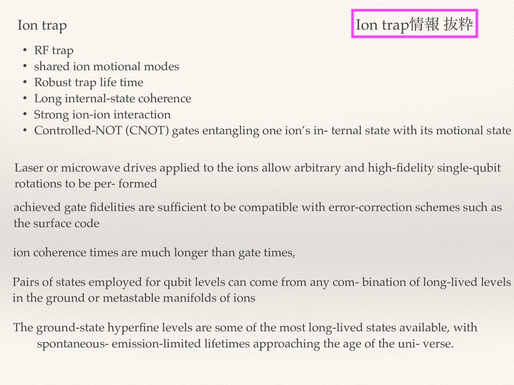 • Robust trap life time • Long internal-state coherence • Strong ion-ion interaction • Controlled-NOT (CNOT) gates entangling one ion’s in- ternal state with its motional state Laser or microwave drives applied to the ions allow arbitrary and high-fidelity single-qubit rotations to be per- formed achieved gate fidelities are sufficient to be compatible with error-correction schemes such as the surface code ion coherence times are much longer than gate times, Pairs of states employed for qubit levels can come from any com- bination of long-lived levels in the ground or metastable manifolds of ions The ground-state hyperfine levels are some of the most long-lived states available, with spontaneous- emission-limited lifetimes approaching the age of the uni- verse. Ion trapใ ൈਮ