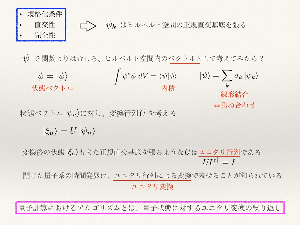 ަੑ • શੑ Z ⇤ dV = h | i <latexit sha1_base64="6fIKy+1cVFWLe/c8/adPTYK+OuE=">AAAC1HichVE7LwRRFP6M93vRSDQTG4JicxcJkUiERum1S2LYzIyLm51XZu5uwlKJRkGpUJEoRK2l0Ihe4SeIkkSjcGZ2EkFwJjPn3O+c78x37jE8SwSSsccKpbKquqa2rr6hsam5pTXR1p4N3IJv8ozpWq6/ZOgBt4TDM1JIiy95Ptdtw+KLRn4qzC8WuR8I11mQWx5fsfUNR6wLU5cE5RL9mnCkqnmBWB0gtyk0dS2rjqua4et5LkthZifEd3OJJEuxyNSfQToOkohtxk3cQ8MaXJgowAaHA0mxBR0BPctIg8EjbAUlwnyKRJTn2EUDcQtUxalCJzRP3w06LceoQ+ewZxCxTfqLRa9PTBU97IFdsBd2xy7ZE3v/tVcp6hFq2SJvlLncy7UedM6//cuyyUtsfrL+1CyxjtFIqyDtXoSEU5hlfnH7+GV+bK6n1MvO2DPpP2WP7JYmcIqv5vksnzv5Q49Bc+t05tTz95sL62yEa0x/X9rPIDuYSg+lBmeHkxOT8ULr0IVu9NHWRjCBacwgQ92PcIVr3ChZZUfZU/bLpUpFzOnAF1MOPwA6gajo</latexit> = | i <latexit sha1_base64="VjhsDkxI/60c3vQltnMXqqFbzWY=">AAACvHichVHLSsNAFD2Nr/quuhHcFEvFVZlWQRGUohuXWq0W2lKSOOrQvEimlVr6A/6AC3GhoCJ+hhtx78JPEJcKblx4kwZERb0hmTNn7rk5d67mGMKTjD1GlI7Oru6eaG9f/8Dg0HBsZHTLs2uuzvO6bdhuQVM9bgiL56WQBi84LldNzeDbWnXFP9+uc9cTtrUpGw4vm+qeJXaFrkqiKrGRkuOJ+GK8VOWy6eNWJZZgKRZE/CdIhyCBMNbs2D1K2IENHTWY4LAgCRtQ4dFTRBoMDnFlNIlzCYngnKOFPtLWKItThkpslb57tCuGrEV7v6YXqHX6i0GvS8o4kuyBXbMXdsdu2BN7/7VWM6jhe2nQqrW13KkMH41vvP2rMmmV2P9U/elZYhfzgVdB3p2A8bvQ2/r64fHLxkIu2Zxi5+yZ/J+xR3ZLHVj1V/1inedO/vCjUd8q7TnV/P3m/DwT/hjT34f2E2xlUumZVGZ9NpFdDgcaxQQmMU1Tm0MWq1hDnqof4BSXuFKWlB2lqpjtVCUSasbwJZT6B0SZn2g=</latexit> ঢ়ଶϕΫτϧ ੵ |⇠µ i = U | n i <latexit sha1_base64="0Osv/JUjYU/vCiYiwEVxT9g4ovk=">AAACynichVE7SwNBEP48X/EdtREsDAbFKmxUUARBtLGw8BUVjBx35xqX3Iu7TTAe6bTxD1hYKVhIWv0FNmJv4U8QSwUbC+cuB6KizrG3M9/ON/vNju6awpeMPTYojU3NLa2JtvaOzq7unmRv34bvlDyD5wzHdLwtXfO5KWyek0KafMv1uGbpJt/Uiwvh+WaZe75w7HVZcfmOpRVssScMTRKkJofyRS6D/IFQg7xVqlZTs6lcHXJ9odpVNZlmGRZZ6qeTjZ00Ylt2kvfIYxcODJRggcOGJN+EBp++bWTB4BK2g4AwjzwRnXNU0U7cEmVxytAILdK/QNF2jNoUhzX9iG3QLSYtj5gpjLAHdsVe2B2rsSf2/mutIKoRaqnQrte53FV7TgbW3v5lWbRL7H+y/tQssYfpSKsg7W6EhF0YdX758PRlbWZ1JBhlF+yZ9J+zR3ZLHdjlV+Nyha+e/aFHp741ijnV/P3lwjwL4Riz34f209kYz2QnMuMrk+m5+XigCQxiGGM0tSnMYRHLyFH1Y9RwjRtlSfGUihLUU5WGmNOPL6YcfQBFiqXY</latexit> ঢ়ଶϕΫτϧɹɹ ʹର͠ɺมߦྻɹ Λߟ͑Δ | n i <latexit sha1_base64="ch1tAdqobveVTzEVVIL7ZGtvTG4=">AAACtXichVG7SgNBFD1ZXzE+ErURbMSgWIVJFCJWoo2lGmMCJoTdzUSH7IvdSUBDfsAP0MLCB1iIn2Ej9hb5BLFUsLHw7mZBVIx3mZ17z9xz59y5mmMITzLWiSh9/QODQ9Hh2Mjo2Hg8MTG559kNV+d53TZst6ipHjeExfNSSIMXHZerpmbwglbf8M8LTe56wrZ25ZHDy6Z6YIma0FVJUKlU57JVcjxRsdqVRJKlWGCzv5106CQR2padeEQJVdjQ0YAJDguSfAMqPPr2kQaDQ1gZLcJc8kRwztFGjLgNyuKUoRJap/8BRfshalHs1/QCtk63GLRcYs5inj2xW/bKHtgde2Yff9ZqBTV8LUe0a10udyrxk+nc+78sk3aJwy9WT80SNawEWgVpdwLE70Lv8pvHZ6+51Z351gK7Zi+k/4p12D11YDXf9JttvnPeQ49GfasUc6r598v5eSb8MaZ/Du23s5dJpZdSme3l5Np6ONAoZjCHRZpaFmvYxBbyVN3BKS5wqWSVslJVat1UJRJypvDNFPsT1XGdrQ==</latexit> U <latexit sha1_base64="JwiRE4gitx2dIxFZDSnmZMKIIKE=">AAACqnichVG7SgNRED2urxgfidoINsEQsZBwo4JiFbSxzMM8JIawu7nRxX2xuwnEkB/QVrGwUrAQP8NG7C38BLGMYGPh7GZBNCTOcvfOnDtn7pk7kqkqtsPY65AwPDI6Nh6YCE5OTc+EwrNzeduoWzLPyYZqWEVJtLmq6DznKI7Ki6bFRU1SeUE62XXPCw1u2Yqh7ztNk5c18UhXaoosOgSlc5VwlMWZZ5FeJ+E7UfiWMsLPOEQVBmTUoYFDh0O+ChE2fSUkwGASVkaLMIs8xTvnaCNI3DplccoQCT2h/xFFJR/VKXZr2h5bpltUWhYxI4ixF3bPOuyJPbA39tW3Vsur4Wpp0i51udyshM4Wsp//sjTaHRz/sAZqdlDDlqdVIe2mh7hdyF1+4/Sqk93OxFrL7Ja9k/4b9soeqQO98SHfpXnmeoAeifoWKeZUs//LuXka2jTGxN+h9Tr5tXhiPb6W3ogmd/yBBrCIJazQ1DaRxB5SyFF1jnNc4FJYFTLCgVDqpgpDPmcev0yofgNgppiH</latexit> มޙͷঢ়ଶɹɹ·ͨਖ਼نަجఈΛுΔΑ͏ͳɹϢχλϦߦྻͰ͋Δ U <latexit sha1_base64="JwiRE4gitx2dIxFZDSnmZMKIIKE=">AAACqnichVG7SgNRED2urxgfidoINsEQsZBwo4JiFbSxzMM8JIawu7nRxX2xuwnEkB/QVrGwUrAQP8NG7C38BLGMYGPh7GZBNCTOcvfOnDtn7pk7kqkqtsPY65AwPDI6Nh6YCE5OTc+EwrNzeduoWzLPyYZqWEVJtLmq6DznKI7Ki6bFRU1SeUE62XXPCw1u2Yqh7ztNk5c18UhXaoosOgSlc5VwlMWZZ5FeJ+E7UfiWMsLPOEQVBmTUoYFDh0O+ChE2fSUkwGASVkaLMIs8xTvnaCNI3DplccoQCT2h/xFFJR/VKXZr2h5bpltUWhYxI4ixF3bPOuyJPbA39tW3Vsur4Wpp0i51udyshM4Wsp//sjTaHRz/sAZqdlDDlqdVIe2mh7hdyF1+4/Sqk93OxFrL7Ja9k/4b9soeqQO98SHfpXnmeoAeifoWKeZUs//LuXka2jTGxN+h9Tr5tXhiPb6W3ogmd/yBBrCIJazQ1DaRxB5SyFF1jnNc4FJYFTLCgVDqpgpDPmcev0yofgNgppiH</latexit> |⇠µ i <latexit sha1_base64="pJFyuE6yLNC2SATPUxz6Jff3k/8=">AAACunichVG7SgNBFD1ZX/GZqI1gEwwRqzCJgiIWQRtLX9FAEsLuOuqQfbE7CcYlP+APWFgpWoifYSP2FvkEsVSwsfDuZkFU1LvMzr1n7rlz7lzNMYQnGevElJ7evv6B+ODQ8MjoWCI5PrHr2Q1X50XdNmy3pKkeN4TFi1JIg5ccl6umZvA9rb4WnO81uesJ29qRLYdXTfXQEgdCVyVBtWSiUufSrxyLml8xG+12LZlmWRZa6qeTi5w0Ituwkw+oYB82dDRggsOCJN+ACo++MnJgcAirwifMJU+E5xxtDBG3QVmcMlRC6/Q/pKgcoRbFQU0vZOt0i0HLJWYKGfbIbtgLu2e37Im9/1rLD2sEWlq0a10ud2qJ06ntt39ZJu0SR5+sPzVLHGAp1CpIuxMiQRd6l988OXvZXt7K+LPskj2T/gvWYXfUgdV81a83+db5H3o06lulmFPN318uyDMRjDH3fWg/nd18NjefzW8upAur0UDjmMYM5mhqiyhgHRsohpM9xxWulRVFU4RS76YqsYgziS+myA//6J9Z</latexit> UU† = I <latexit sha1_base64="B+qNIQOEII+kjqBDDmBbidTIzLM=">AAACvHichVHLSsNQED2N73fVjeAmWCquyq0KiqAU3eiuPqIFHyVJb2NoXiRppZb+gD/gQlwoqIif4Ubcu/ATxKWCGxdO0oCotE64uTPnzpl75o7iGLrnM/YcE9raOzq7unt6+/oHBofiwyPbnl12VS6ptmG7OUX2uKFbXPJ13+A5x+WyqRh8RymtBOc7Fe56um1t+VWH75uyZulFXZV9gvLxYUmUDmp7BVnTuFsXF8W1fDzBUiw08a+TjpwEIsva8UfsoQAbKsowwWHBJ9+ADI++XaTB4BC2jxphLnl6eM5RRy9xy5TFKUMmtER/jaLdCLUoDmp6IVulWwxaLjFFJNkTu2Vv7IHdsRf22bRWLawRaKnSrjS43MkPnYxtfvzLMmn3cfjNaqnZRxHzoVadtDshEnShNviV49O3zYWNZG2SXbJX0n/Bntk9dWBV3tWrdb5x1kKPQn3LFHOq2fzlgjwTdRpj+vfQ/jrb06n0TGp6fTaRWY4G2o1xTGCKpjaHDFaRhUTVj3COa9wIS0JBKAlmI1WIRZxR/DCh8gWfRp6v</latexit> ดͨ͡ྔࢠܥͷ࣌ؒൃలɺϢχλϦߦྻʹΑΔมͰදͤΔ͜ͱ͕ΒΕ͍ͯΔ ϢχλϦม ྔࢠܭࢉʹ͓͚ΔΞϧΰϦζϜͱɺྔࢠঢ়ଶʹର͢ΔϢχλϦมͷ܁Γฦ͠ | i = X k ak | k i <latexit sha1_base64="B4YvNakM/LBXli/WKToWttzSKSQ=">AAACznichVE7LwRRFP6M93vRSDQTG6La3F0SIpEIjXI9FomVycy4uJlnZu5uwmajxR9QqEgUotBSa0Sv8BNESaJRODM7IQjO5M4957vnO/c79xi+LULJ2EOdUt/Q2NTc0trW3tHZ1Z3q6V0OvVJg8oLp2V6waught4XLC1JIm6/6Adcdw+YrhjUbna+UeRAKz12SOz5fd/QtV2wKU5cEaal00eKyUvRDUVWn1GJYcjRL1TXrA9asKmWxDItN/elkEyeNxPJe6g5FbMCDiRIccLiQ5NvQEdK3hiwYfMLWUSEsIE/E5xxVtBG3RFmcMnRCLfpvUbSWoC7FUc0wZpt0i00rIKaKIXbPztkzu2UX7JG9/VqrEteItOzQbtS43Ne6D/sXX/9lObRLbH+y/tQssYmJWKsg7X6MRF2YNX559+h5cXJhqDLMTtkT6T9hD+yGOnDLL+bZPF84/kOPQX3rFHOq+fvLRXkOojFmvw/tp7Ocy2RHM7n5sfT0TDLQFgxgECM0tXFMYw55FKj6AS5xhWslr5SVqrJXS1XqEk4fvpiy/w7oOKdE</latexit> ઢܗ݁߹ ⇔ॏͶ߹Θ