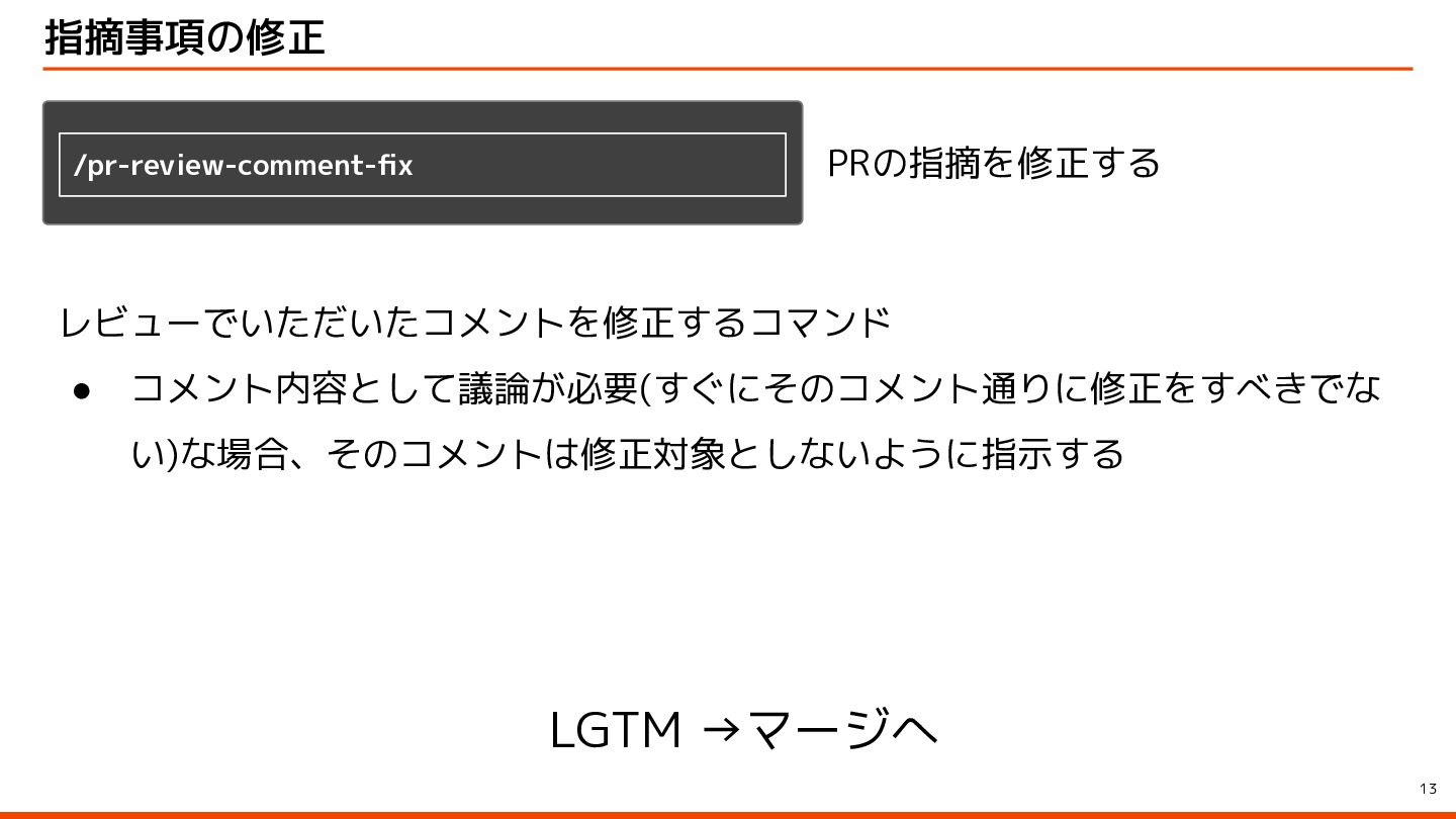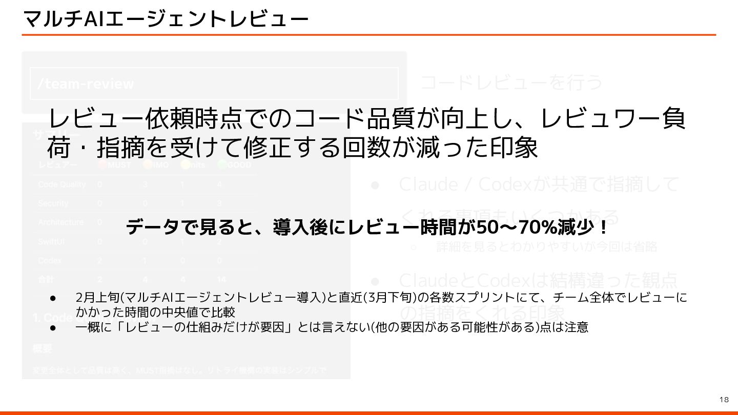 詳細を見るとわかりやすいが今回は省略 • ClaudeとCodexは結構違った観点 の指摘をくれる印象 レビュー依頼時点でのコード品質が向上し、レビュワー負 荷・指摘を受けて修正する回数が減った印象 データで見ると、導入後にレビュー時間が50〜70%減少! • 2月上旬(マルチAIエージェントレビュー導入)と直近(3月下旬)の各数スプリントにて、チーム全体でレビューに かかった時間の中央値で比較 • 一概に「レビューの仕組みだけが要因」とは言えない(他の要因がある可能性がある)点は注意