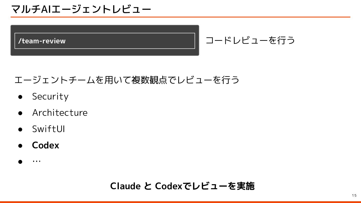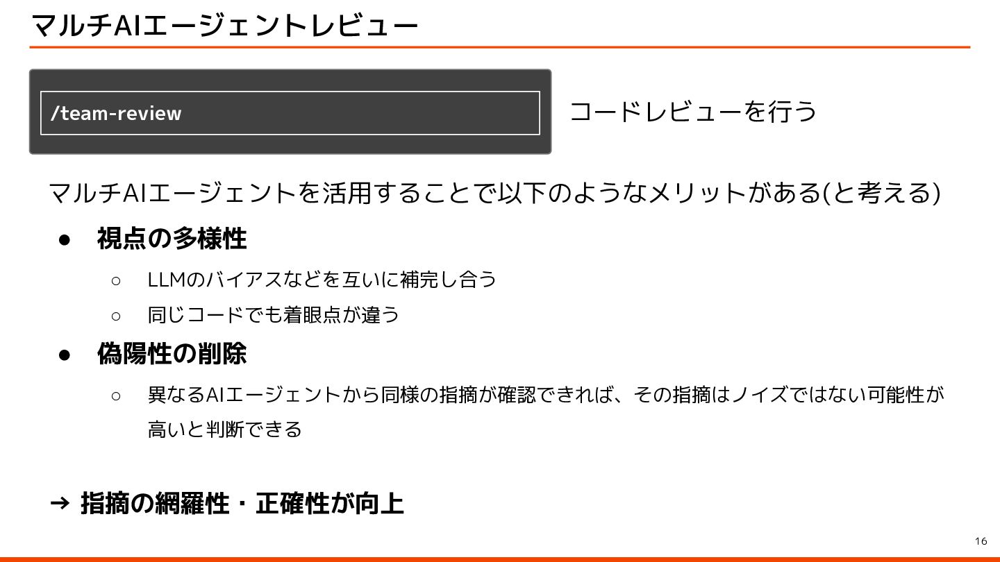 3. 16 マルチAIエージェントレビュー /team-review コードレビューを行う マルチAIエージェントを活用することで以下のようなメリットがある(と考える) • 視点の多様性 ◦ LLMのバイアスなどを互いに補完し合う ◦