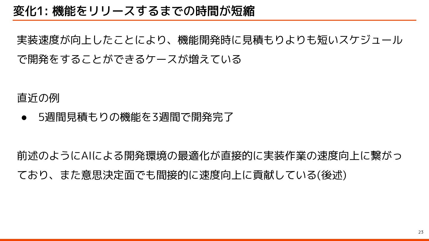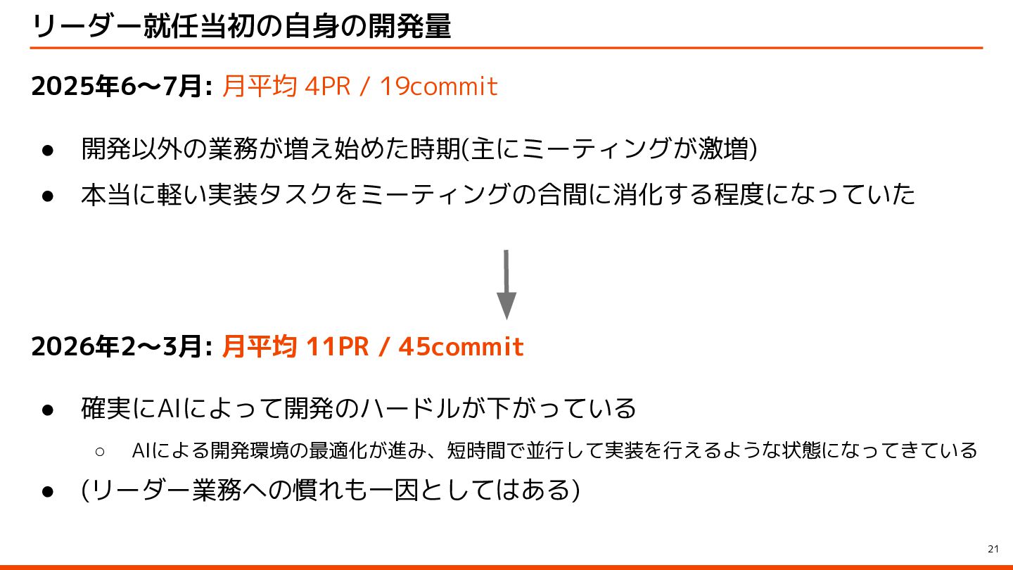 本当に軽い実装タスクをミーティングの合間に消化する程度になっていた 2026年2〜3月: 月平均 11PR / 45commit • 確実にAIによって開発のハードルが下がっている ◦ AIによる開発環境の最適化が進み、短時間で並行して実装を行えるような状態になってきている • (リーダー業務への慣れも一因としてはある)