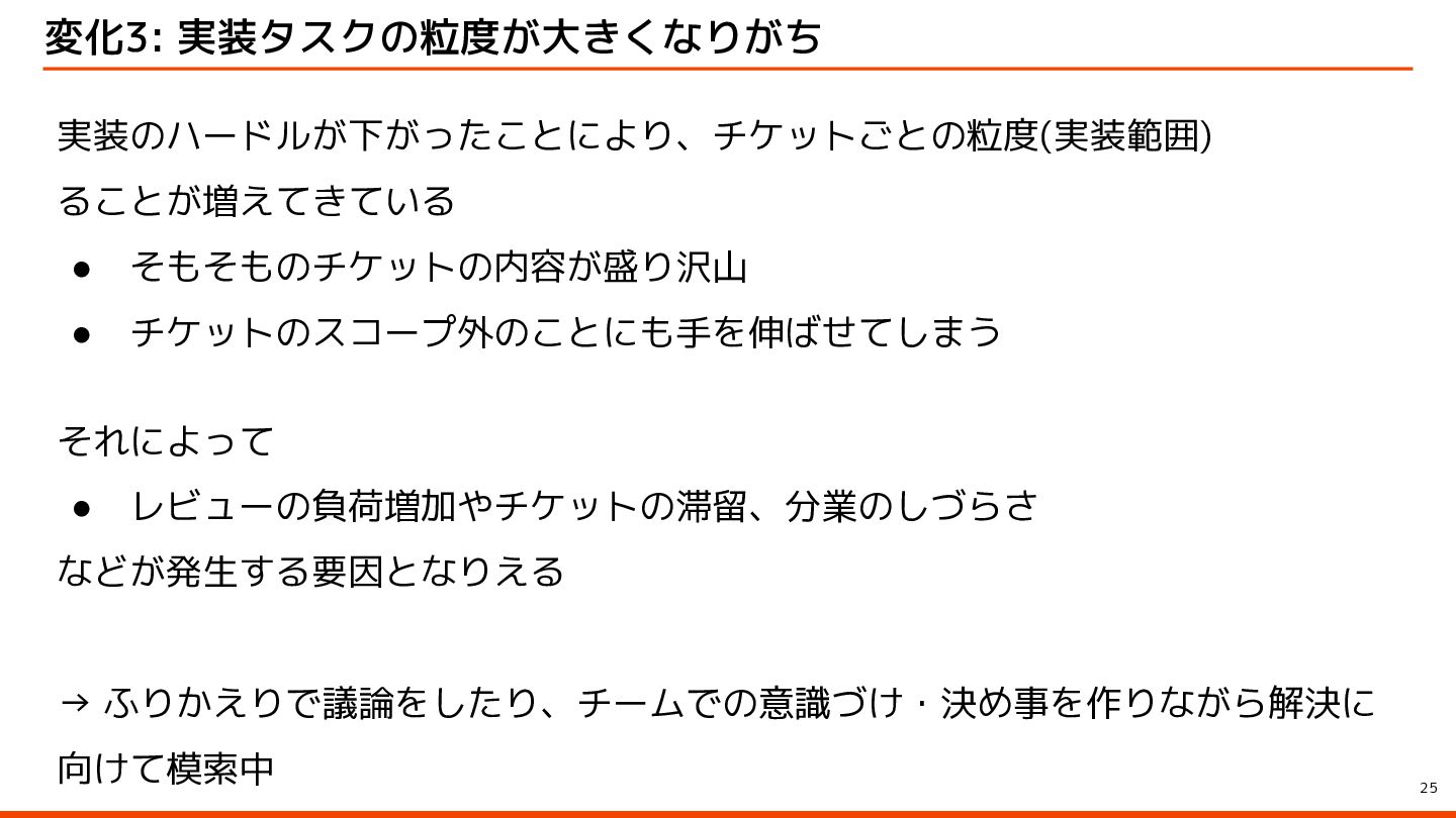 8. 25 変化3: 実装タスクの粒度が大きくなりがち 実装のハードルが下がったことにより、チケットごとの粒度(実装範囲)が大きくな ることが増えてきている • そもそものチケットの内容が盛り沢山 • チケットのスコープ外のことにも手を伸ばせてしまう それによって