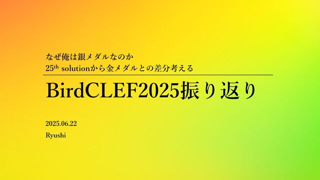 Train(1st.) 1st single model Train soundscape (unlabeled data) Pseudo labeling Train(2nd.) 2nd single model Ryushi 2g Ryushi 2g s1_exp435 Ensemble s1_exp378 s1_exp269 bc119 bc118 bc112 0.863 / 0.864 0.865 / 0.871 0.857 / 0.866 0.863 / 0.889 unknown unknown s2_exp348 s2_exp294 bc132 bc111 0.901 / 0.899 0.898 / 0.902 0.896 / 0.896 0.894 / 0.894 ens020 0.908 / 0.910 (Pub./Pri.) (Pub./Pri.)
