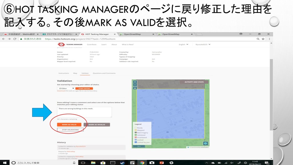 ⑥HOT TASKING MANAGERのページに戻り修正した理由を 記入する。その後MARK AS VALIDを選択。