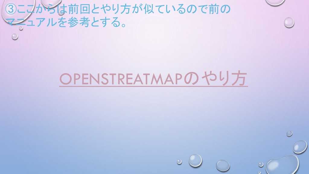 OPENSTREATMAPのやり方 ③ここからは前回とやり方が似ているので前の マニュアルを参考とする。