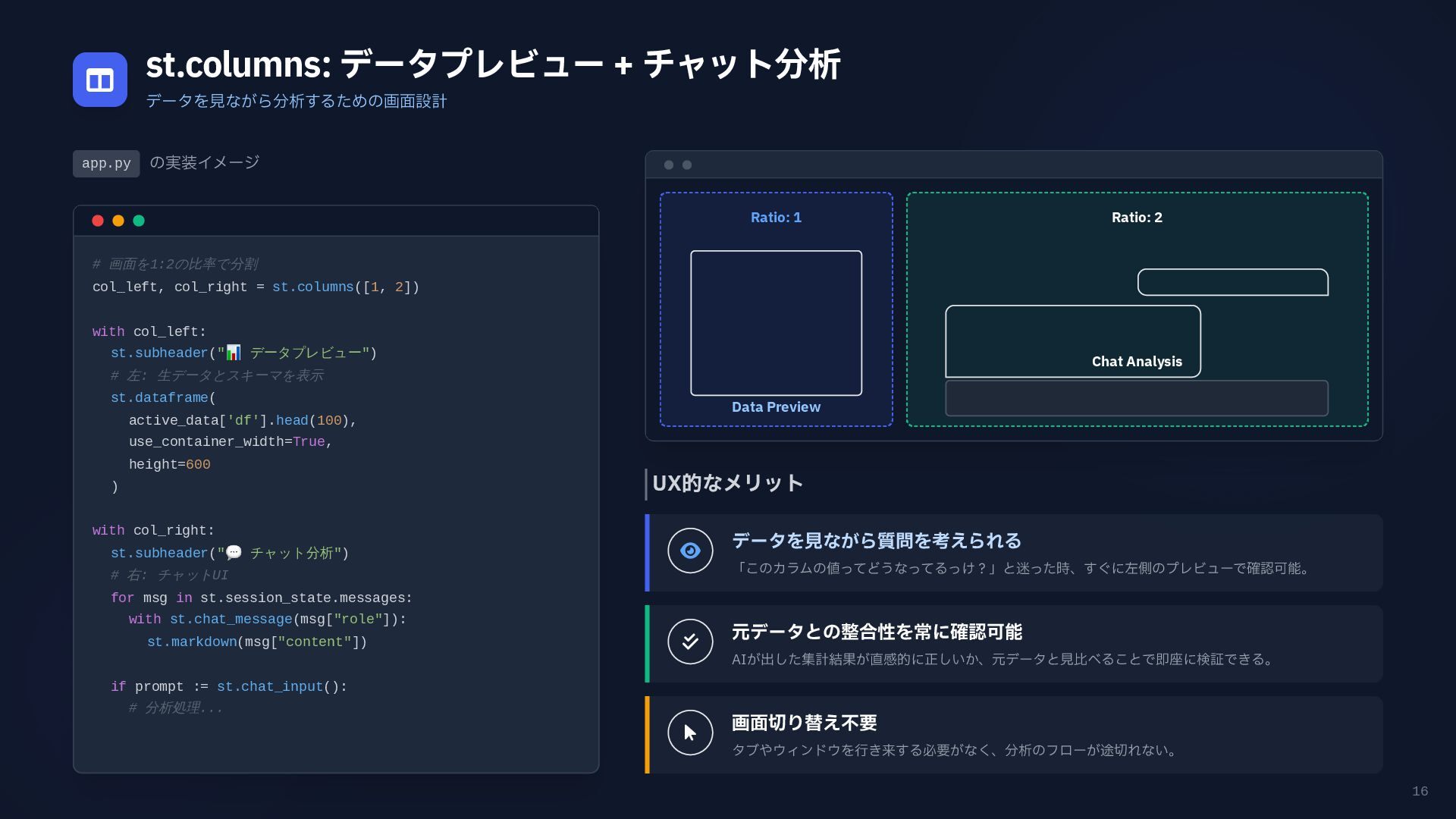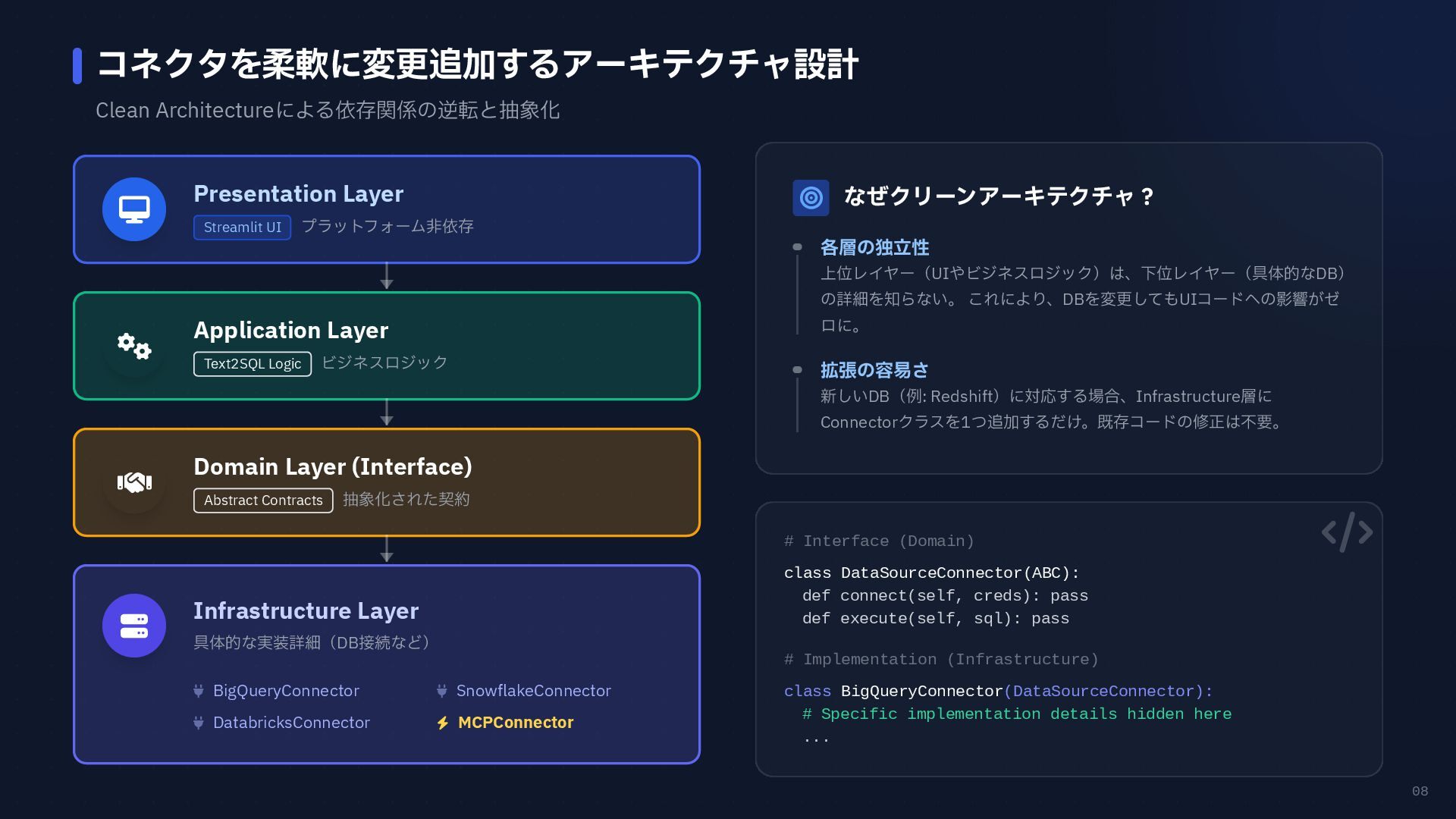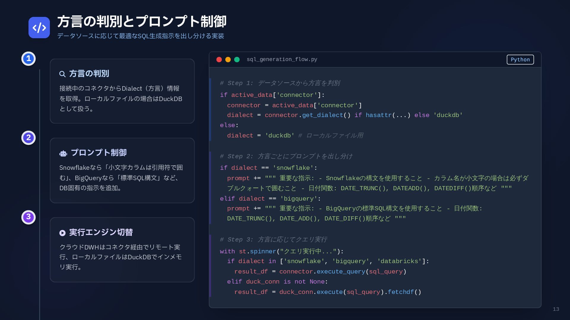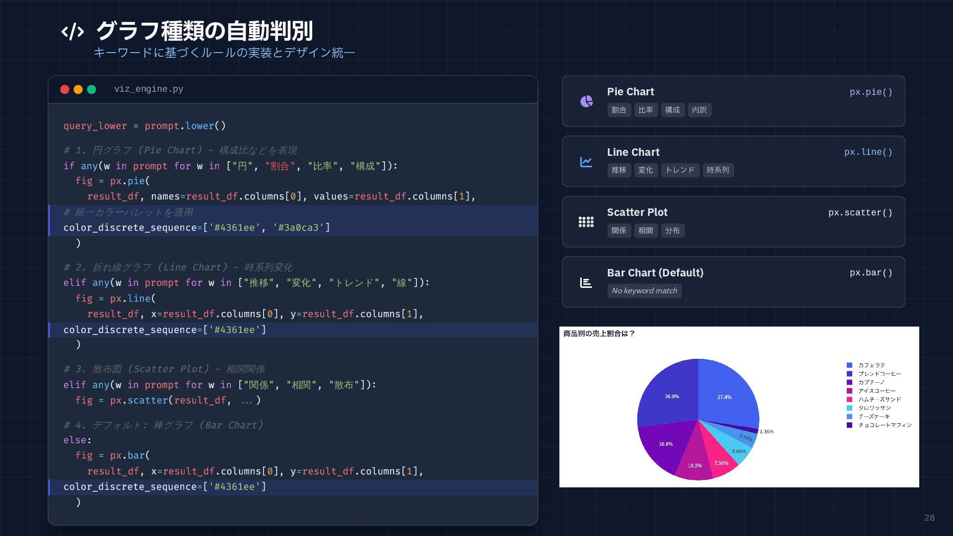 円グラフ (Pie Chart) - 構成比などを表現 if any(w in prompt for w in ["円", "割合", "比率", "構成"]): fig = px.pie( result_df, names=result_df.columns[0], values=result_df.columns[1], # 統一カラーパレットを適用 color_discrete_sequence=['#4361ee', '#3a0ca3'] ) # 2. 折れ線グラフ (Line Chart) - 時系列変化 elif any(w in prompt for w in ["推移", "変化", "トレンド", "線"]): fig = px.line( result_df, x=result_df.columns[0], y=result_df.columns[1], color_discrete_sequence=['#4361ee'] ) # 3. 散布図 (Scatter Plot) - 相関関係 elif any(w in prompt for w in ["関係", "相関", "散布"]): fig = px.scatter(result_df, ...) # 4. デフォルト: 棒グラフ (Bar Chart) else: fig = px.bar( result_df, x=result_df.columns[0], y=result_df.columns[1], color_discrete_sequence=['#4361ee'] ) Pie Chart px.pie() 割合 比率 構成 内訳 Line Chart px.line() 推移 変化 トレンド 時系列 Scatter Plot px.scatter() 関係 相関 分布 Bar Chart (Default) px.bar() No keyword match