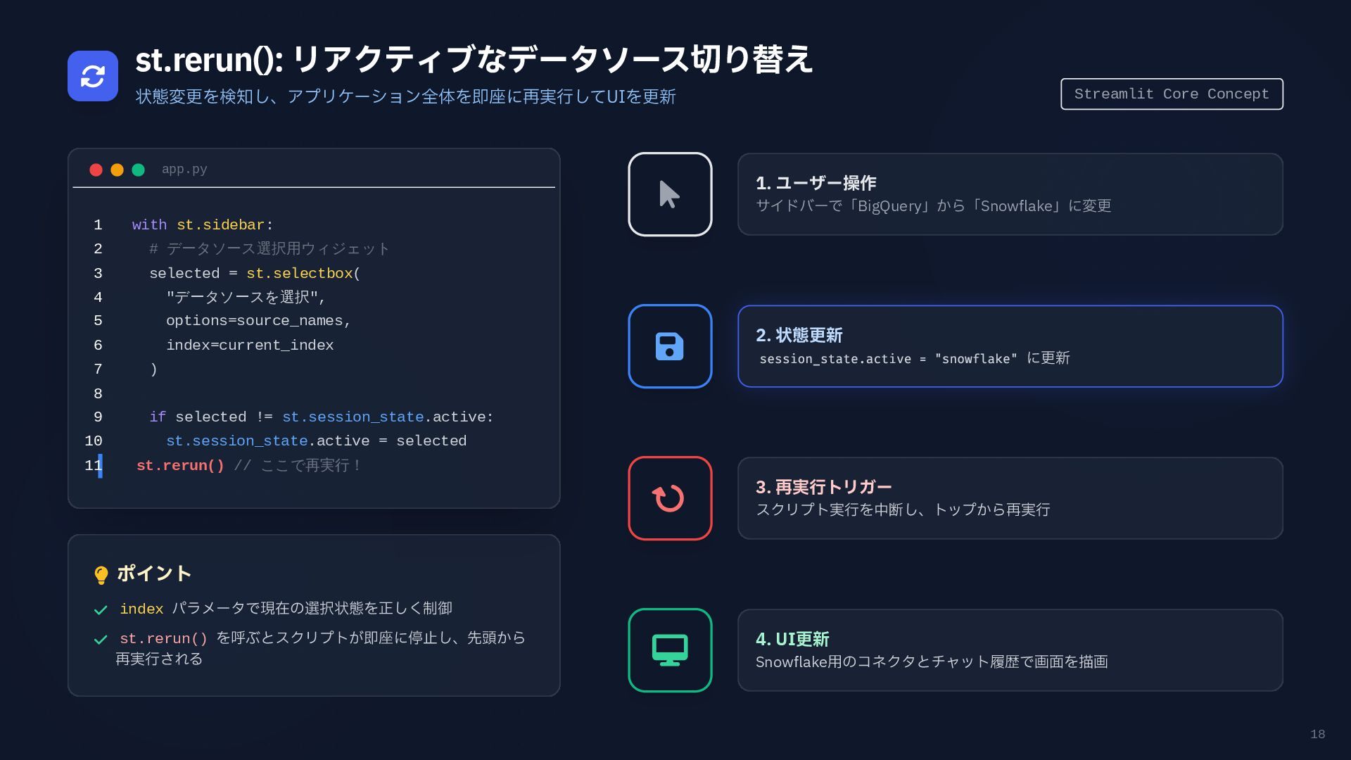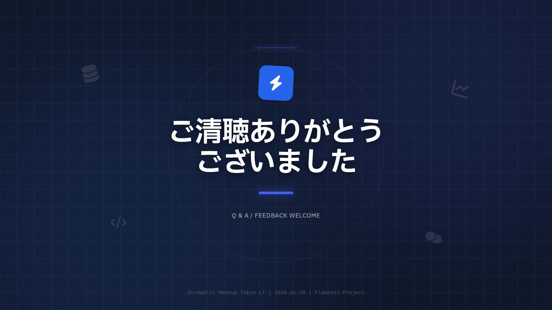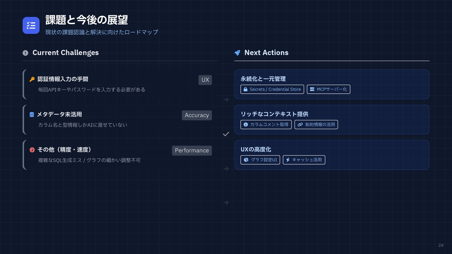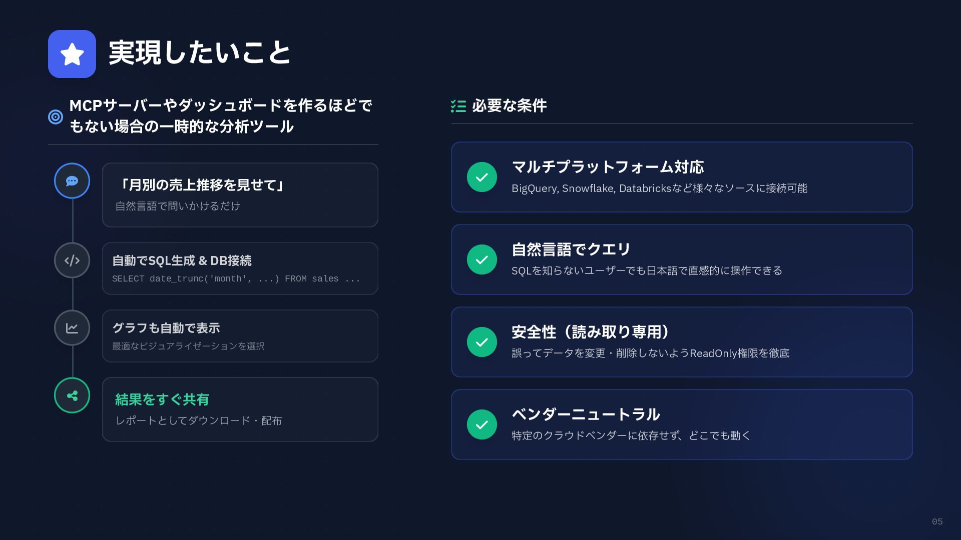 円グラフ (Pie Chart) - 構成比などを表現 if any(w in prompt for w in ["円", "割合", "比率", "構成"]): fig = px.pie( result_df, names=result_df.columns[0], values=result_df.columns[1], # 統一カラーパレットを適用 color_discrete_sequence=['#4361ee', '#3a0ca3'] ) # 2. 折れ線グラフ (Line Chart) - 時系列変化 elif any(w in prompt for w in ["推移", "変化", "トレンド", "線"]): fig = px.line( result_df, x=result_df.columns[0], y=result_df.columns[1], color_discrete_sequence=['#4361ee'] ) # 3. 散布図 (Scatter Plot) - 相関関係 elif any(w in prompt for w in ["関係", "相関", "散布"]): fig = px.scatter(result_df, ...) # 4. デフォルト: 棒グラフ (Bar Chart) else: fig = px.bar( result_df, x=result_df.columns[0], y=result_df.columns[1], color_discrete_sequence=['#4361ee'] ) Pie Chart px.pie() 割合 比率 構成 内訳 Line Chart px.line() 推移 変化 トレンド 時系列 Scatter Plot px.scatter() 関係 相関 分布 Bar Chart (Default) px.bar() No keyword match