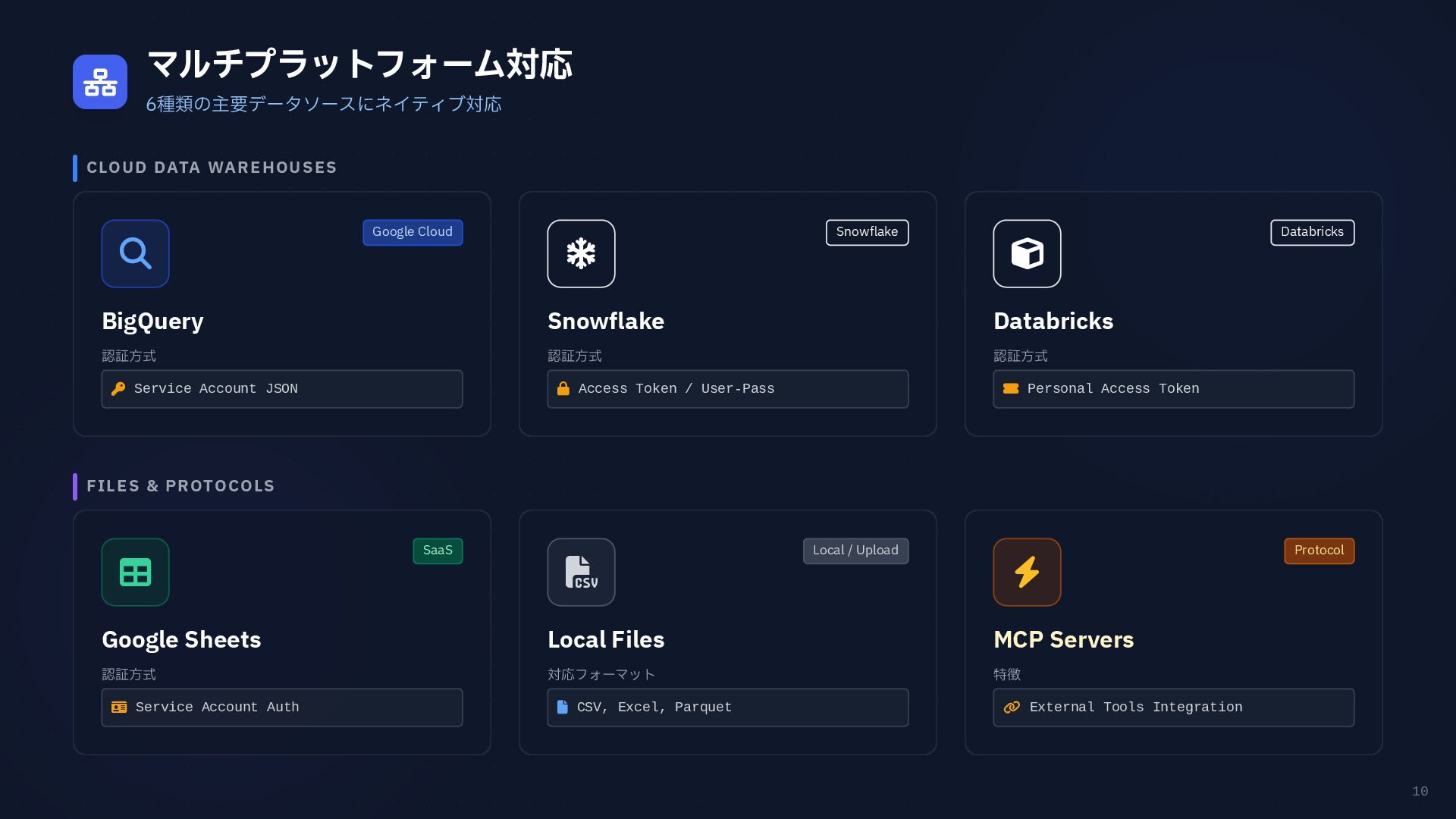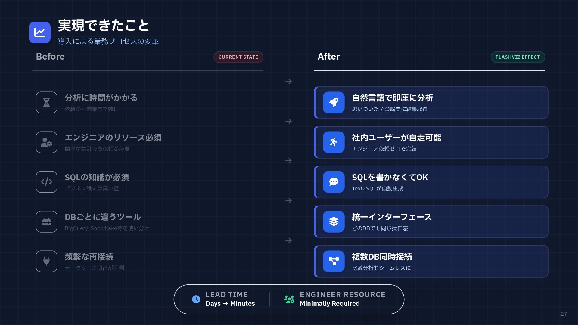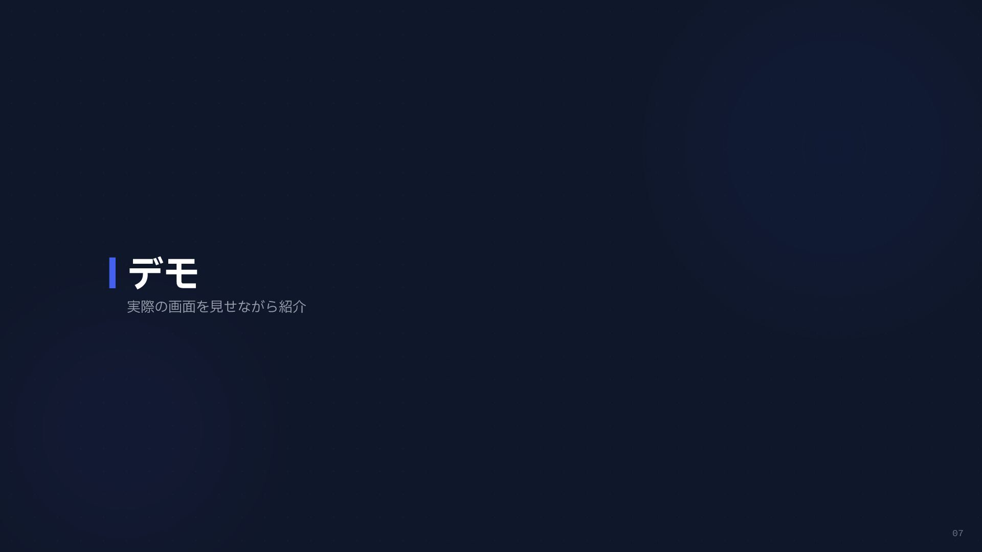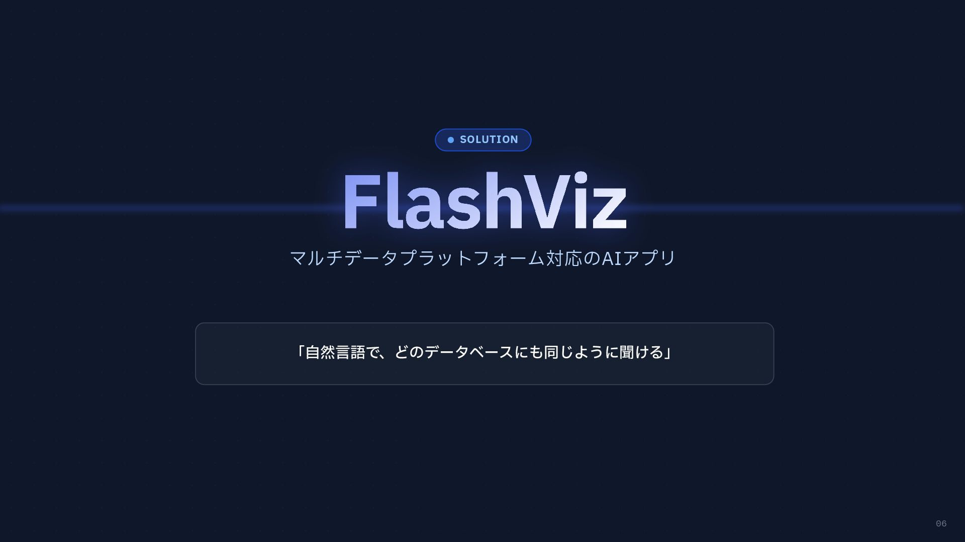 円グラフ (Pie Chart) - 構成比などを表現 if any(w in prompt for w in ["円", "割合", "比率", "構成"]): fig = px.pie( result_df, names=result_df.columns[0], values=result_df.columns[1], # 統一カラーパレットを適用 color_discrete_sequence=['#4361ee', '#3a0ca3'] ) # 2. 折れ線グラフ (Line Chart) - 時系列変化 elif any(w in prompt for w in ["推移", "変化", "トレンド", "線"]): fig = px.line( result_df, x=result_df.columns[0], y=result_df.columns[1], color_discrete_sequence=['#4361ee'] ) # 3. 散布図 (Scatter Plot) - 相関関係 elif any(w in prompt for w in ["関係", "相関", "散布"]): fig = px.scatter(result_df, ...) # 4. デフォルト: 棒グラフ (Bar Chart) else: fig = px.bar( result_df, x=result_df.columns[0], y=result_df.columns[1], color_discrete_sequence=['#4361ee'] ) Pie Chart px.pie() 割合 比率 構成 内訳 Line Chart px.line() 推移 変化 トレンド 時系列 Scatter Plot px.scatter() 関係 相関 分布 Bar Chart (Default) px.bar() No keyword match