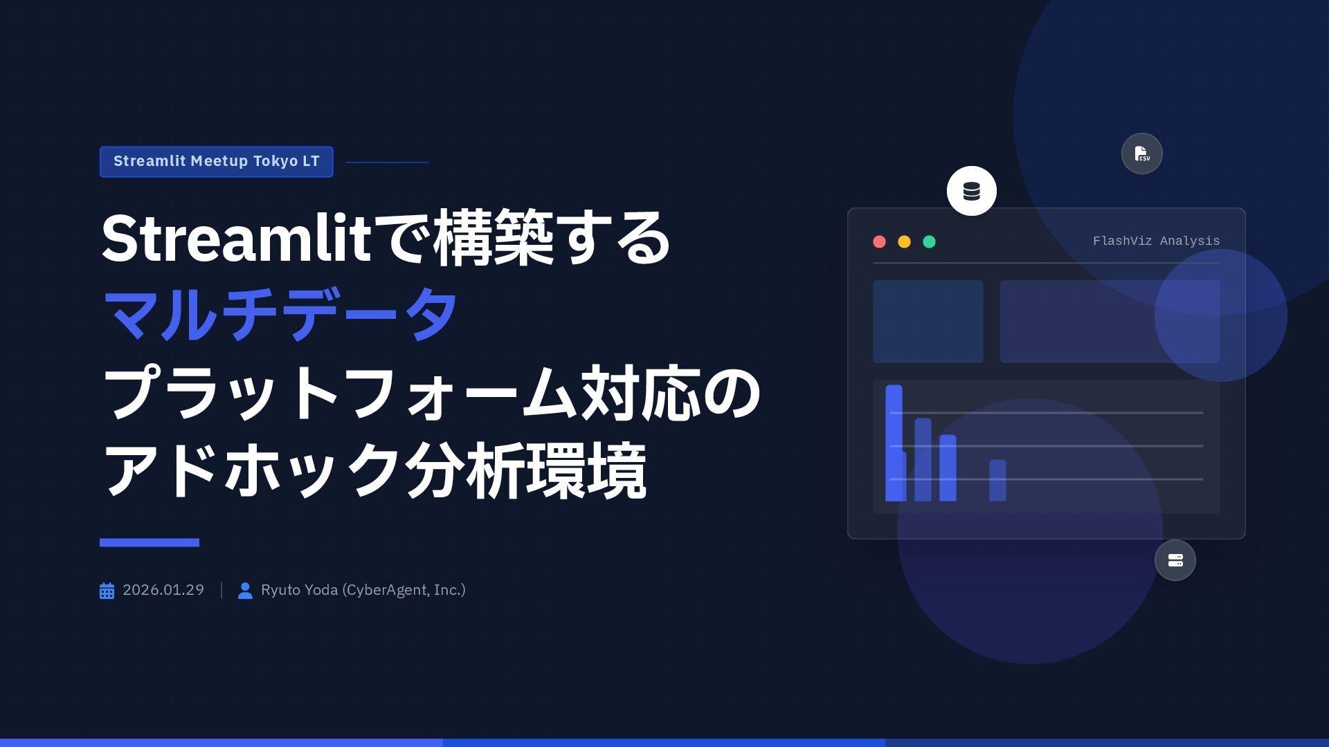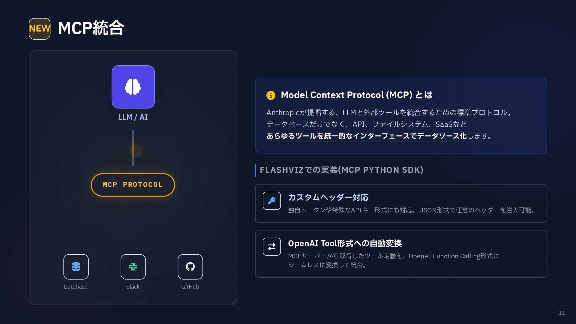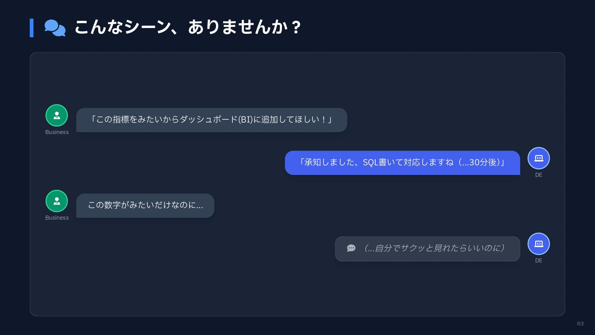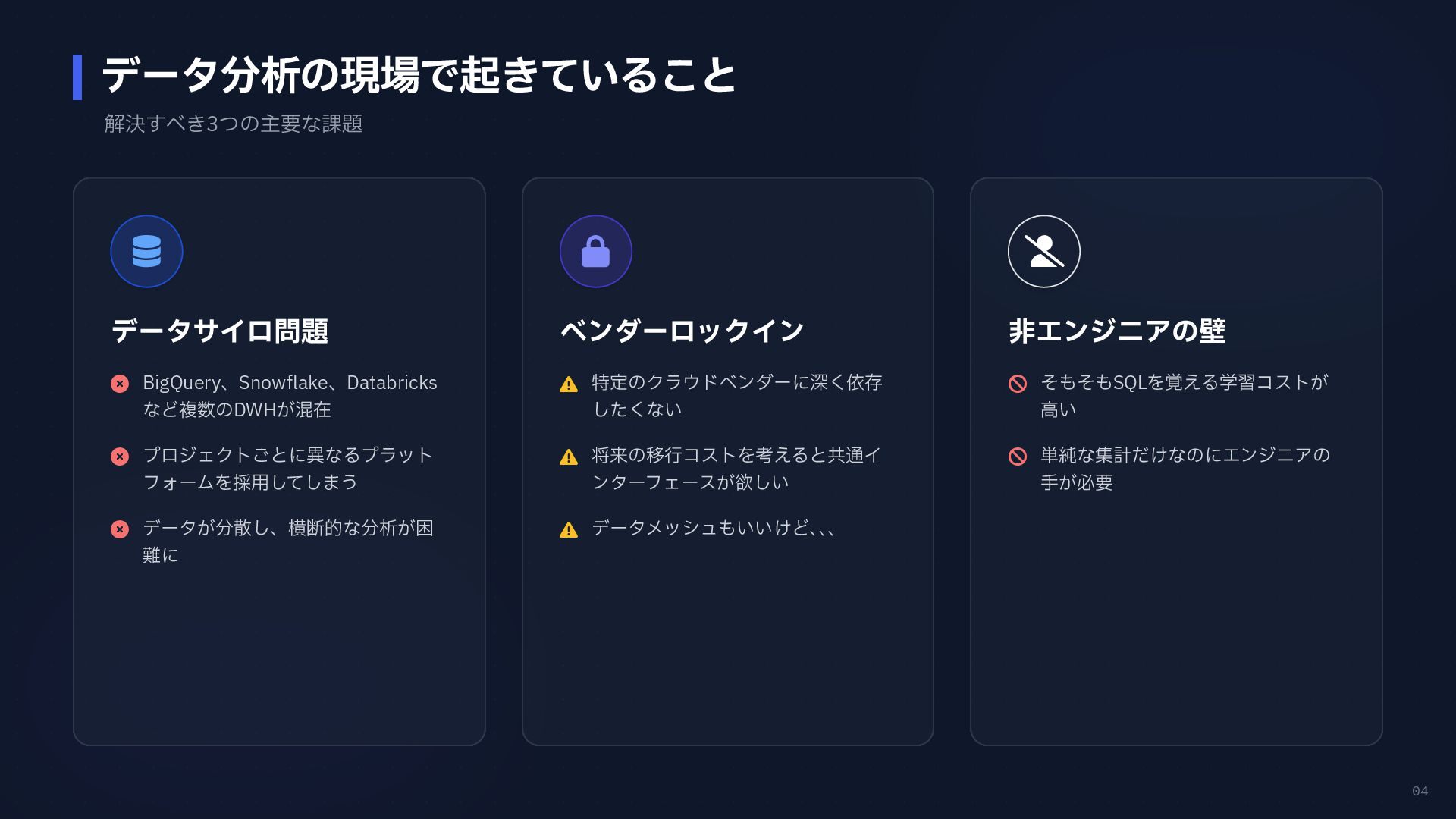 円グラフ (Pie Chart) - 構成比などを表現 if any(w in prompt for w in ["円", "割合", "比率", "構成"]): fig = px.pie( result_df, names=result_df.columns[0], values=result_df.columns[1], # 統一カラーパレットを適用 color_discrete_sequence=['#4361ee', '#3a0ca3'] ) # 2. 折れ線グラフ (Line Chart) - 時系列変化 elif any(w in prompt for w in ["推移", "変化", "トレンド", "線"]): fig = px.line( result_df, x=result_df.columns[0], y=result_df.columns[1], color_discrete_sequence=['#4361ee'] ) # 3. 散布図 (Scatter Plot) - 相関関係 elif any(w in prompt for w in ["関係", "相関", "散布"]): fig = px.scatter(result_df, ...) # 4. デフォルト: 棒グラフ (Bar Chart) else: fig = px.bar( result_df, x=result_df.columns[0], y=result_df.columns[1], color_discrete_sequence=['#4361ee'] ) Pie Chart px.pie() 割合 比率 構成 内訳 Line Chart px.line() 推移 変化 トレンド 時系列 Scatter Plot px.scatter() 関係 相関 分布 Bar Chart (Default) px.bar() No keyword match