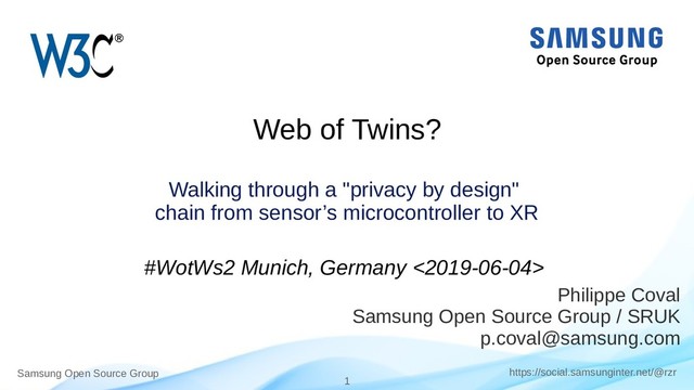 Coval • Software engineer for Samsung OSG – Belongs to SRUK team, based in Rennes, France – Interest: Web of Things with “Privacy by Design” – Contributor: Tizen, IoTivity, Mozilla WebThings, IoT.js, TizenRT... – Multi-active: FLOSS, OSHW, IoT, Web, 3D/XR, Communities • Ping me online: – https://social.samsunginter.net/@rzr