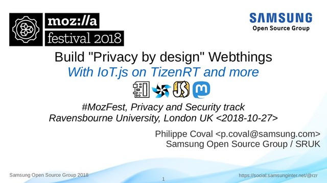 Input/Output https://github.com/rzr/webthing-iotjs/wiki/Sensor • Analog: Measured phenomena – Physics, Chemicals, Probabilities • Digital→Several bits (On/Off) • Analog↔Digital conversion – Quantification • Time matters – Periodic (frequencies) • Sensors and actuators • I/O Pins – GPIO: General Input (or) Output • Numeric: 3.3v = 1 , 0v = 0 • Used for input: buttons, switch – or output: relay, LED, lights – PWM: Pulse width modulation • Pulse signal (frequency) • Used for buzzer, motors, dimmed LED – UART: Universal Asynchronous Receiver Transmitter • Serial line: Send (TX) / Receive (RX) data • Speed in baud (bit per second) • Used for console, modems, peripheral MCU – I2C & SPI buses • Used for chips (ADC/DAC, sensors, memory)