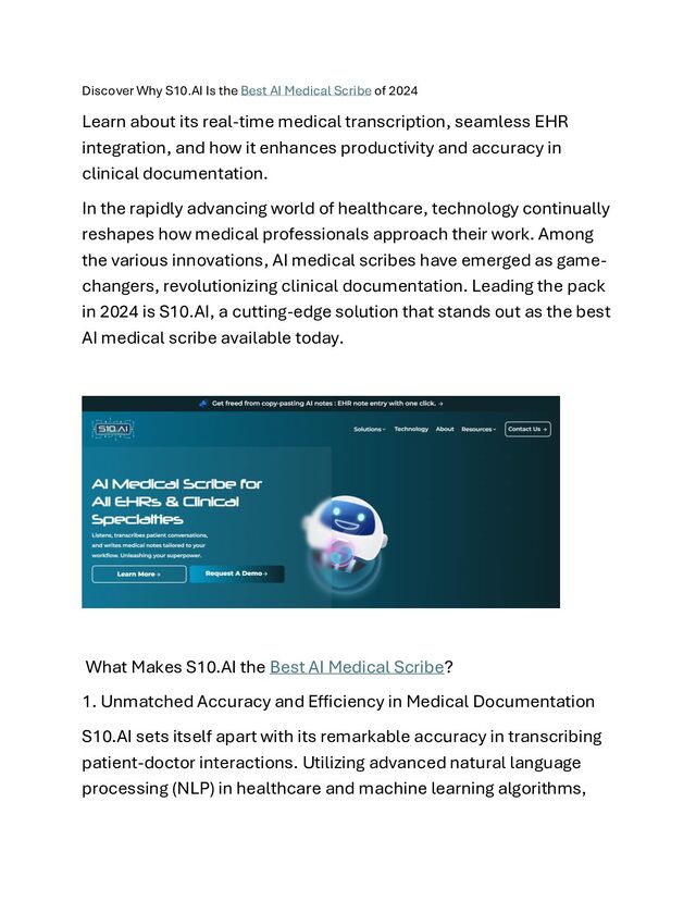 2024 Learn about its real-time medical transcription, seamless EHR integration, and how it enhances productivity and accuracy in clinical documentation. In the rapidly advancing world of healthcare, technology continually reshapes how medical professionals approach their work. Among the various innovations, AI medical scribes have emerged as game- changers, revolutionizing clinical documentation. Leading the pack in 2024 is S10.AI, a cutting-edge solution that stands out as the best AI medical scribe available today. What Makes S10.AI the Best AI Medical Scribe? 1. Unmatched Accuracy and Efficiency in Medical Documentation S10.AI sets itself apart with its remarkable accuracy in transcribing patient-doctor interactions. Utilizing advanced natural language processing (NLP) in healthcare and machine learning algorithms,