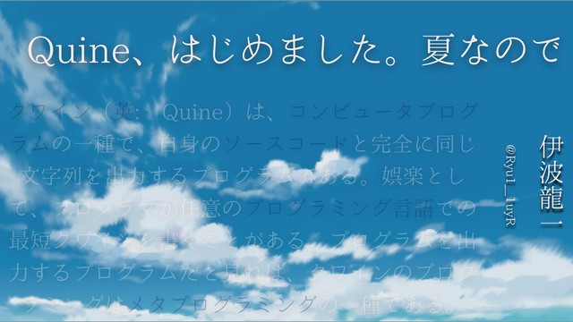ҏ ཾ Ұ =2VJOFɺ͡Ί·ͨ͠ɻՆͳͷͰ ΫϫΠϯʢӳ2VJOFʣɺίϯϐϡʔλϓϩά ϥϜͷҰछͰɺࣗͷιʔείʔυͱશʹಉ͡ จࣈྻΛग़ྗ͢ΔϓϩάϥϜͰ͋Δɻޘָͱ͠ ͯɺϓϩάϥϚ͕ҙͷϓϩάϥϛϯάݴޠͰͷ ࠷ΫϫΠϯΛॻ͘͜ͱ͕͋ΔɻϓϩάϥϜΛग़