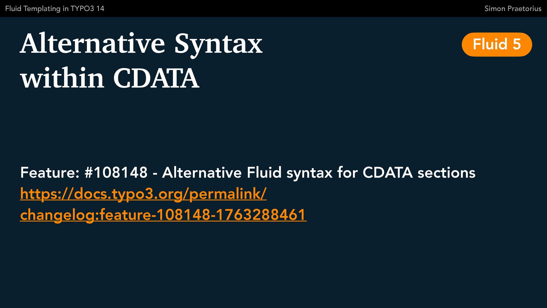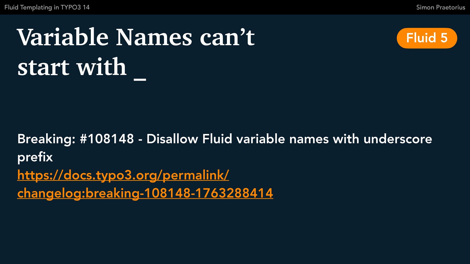 - Disallow Fluid variable names with underscore pre fi x https://docs.typo3.org/permalink/ changelog:breaking-108148-1763288414 Fluid Templating in TYPO3 14 Fluid 5