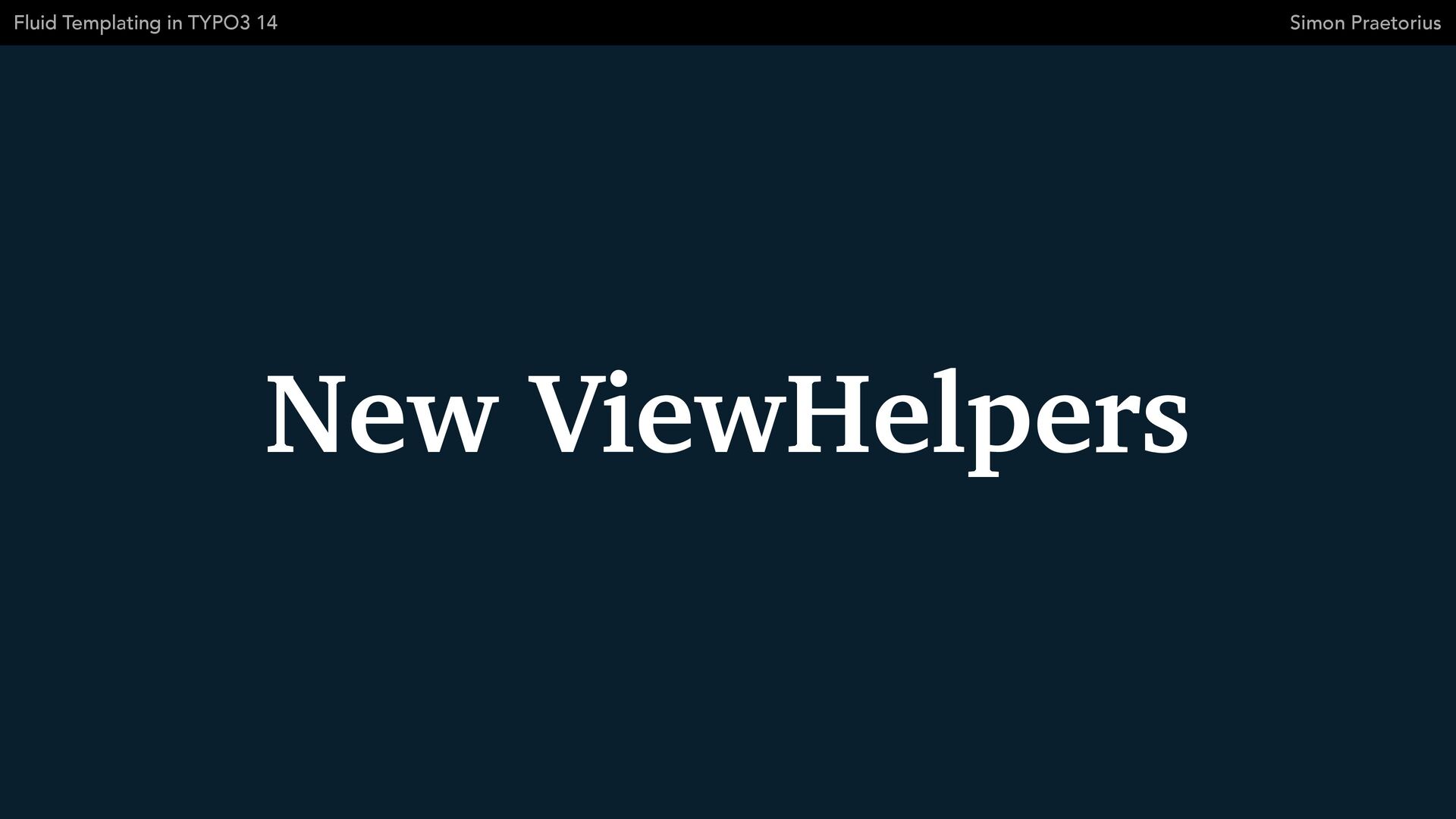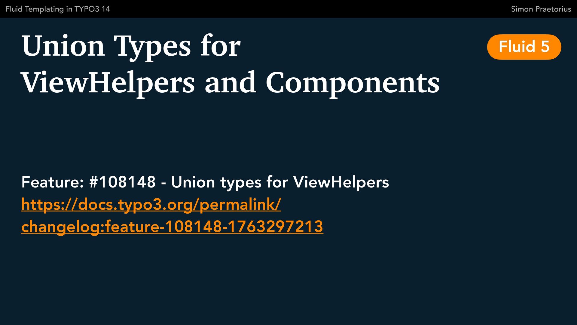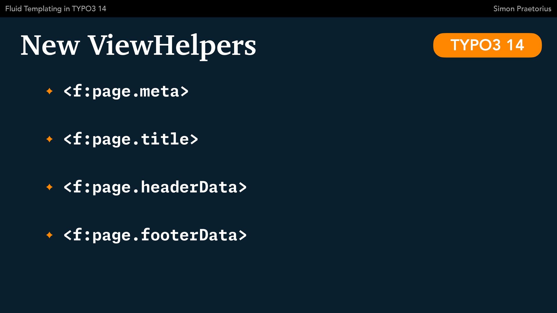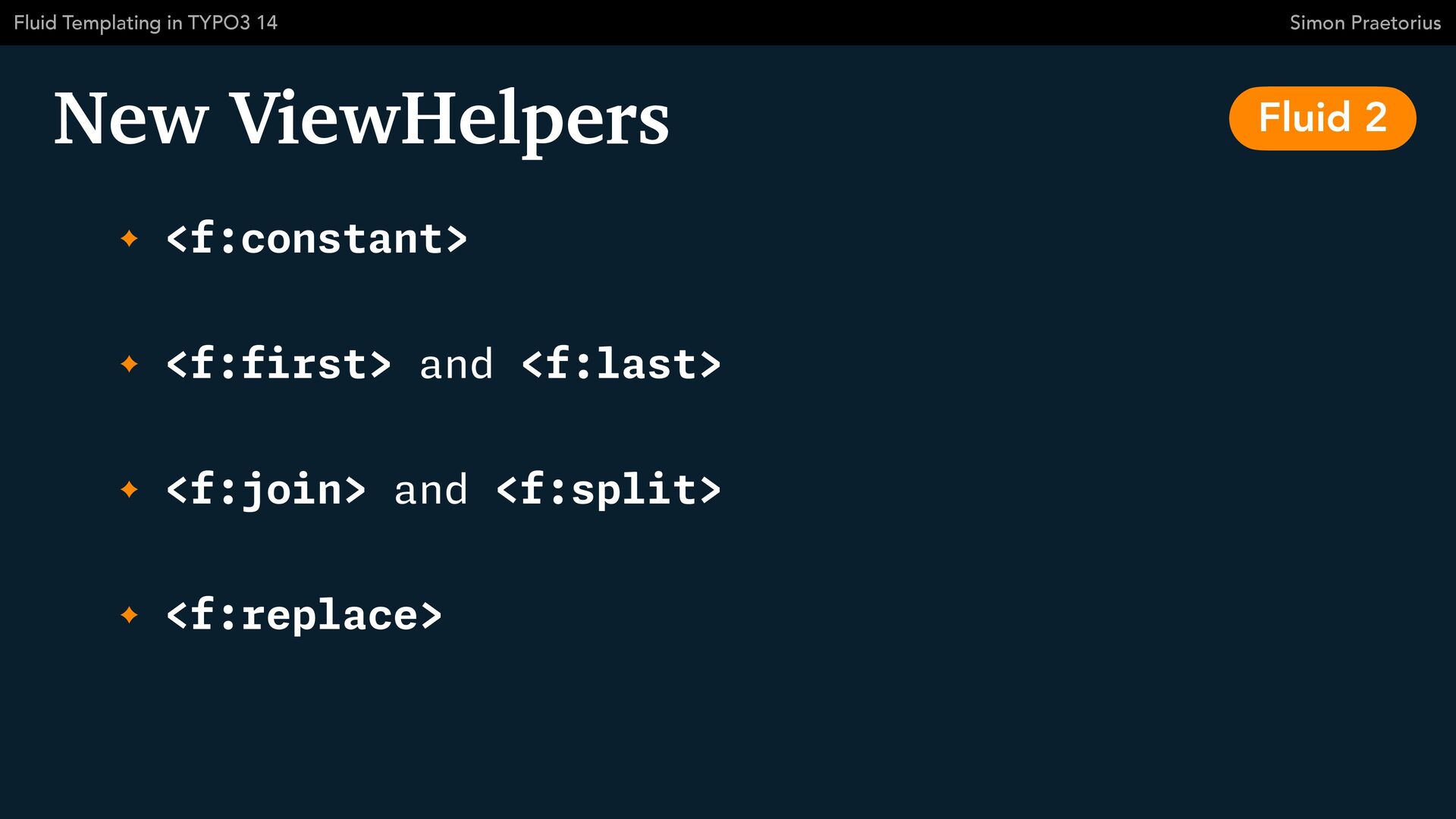 ✦ <f:length> ✦ <f: m erge> ✦ <f:starts Wi th> and <f:ends Wi th> ✦ <f:round>, <f:ceil> and <f:floor> ✦ <f: mi n> and <f: m ax> ✦ <f:contains> ✦ <f:argument> ✦ <f:slot> and <f:fragment> Fluid 4 Fluid Templating in TYPO3 14