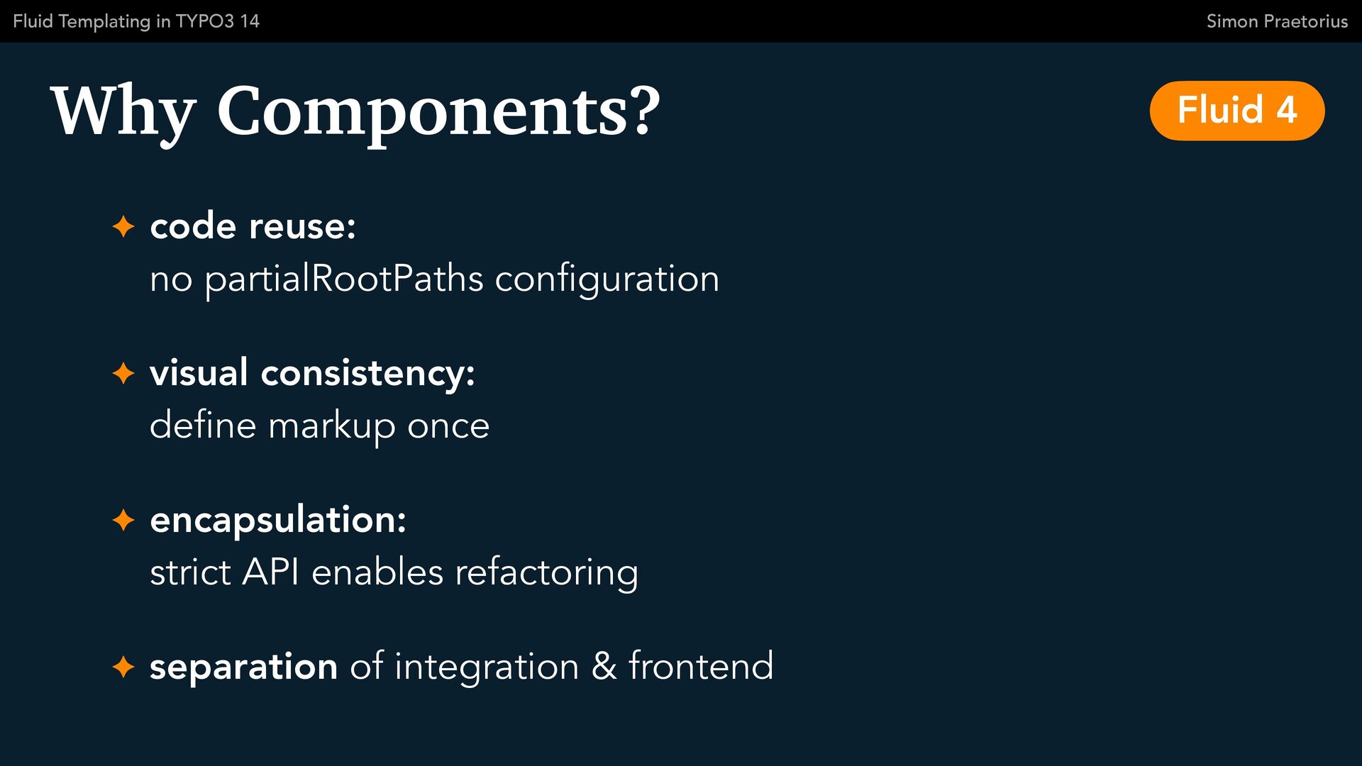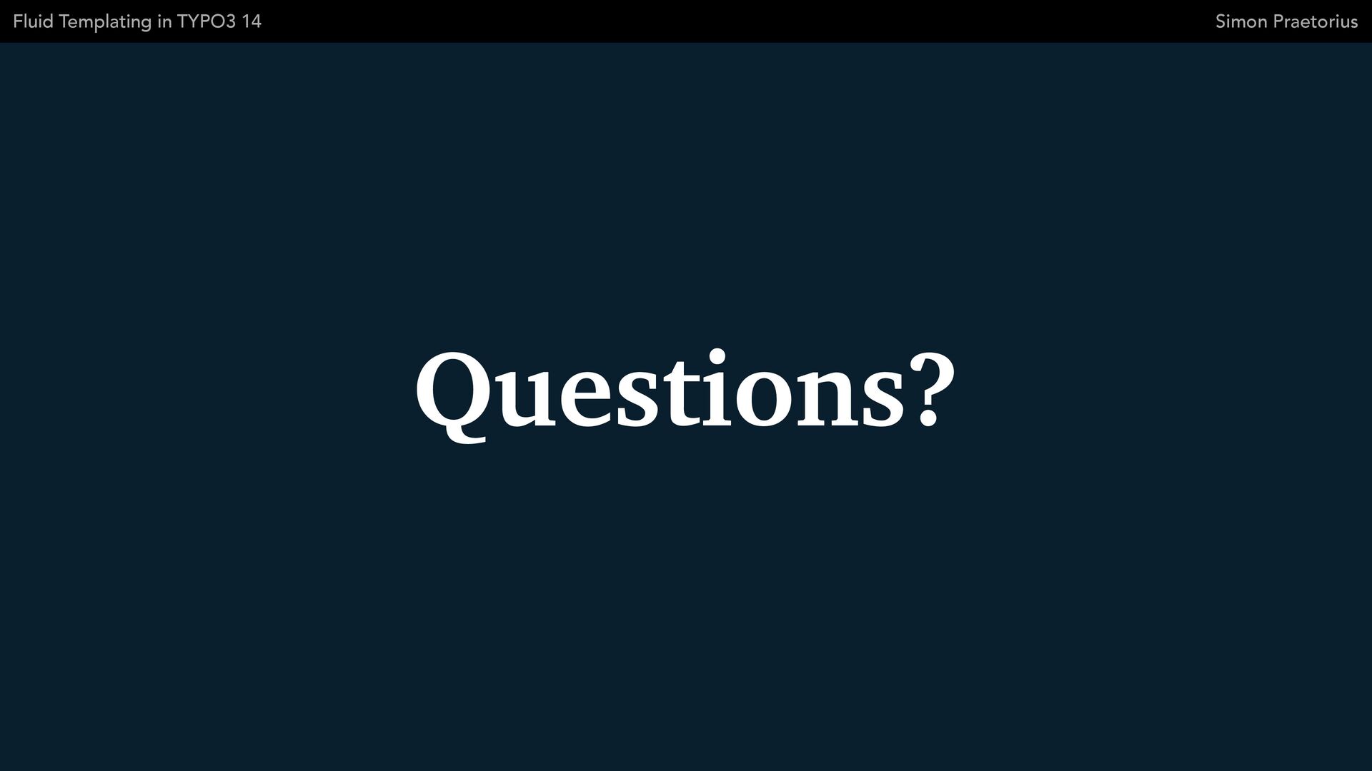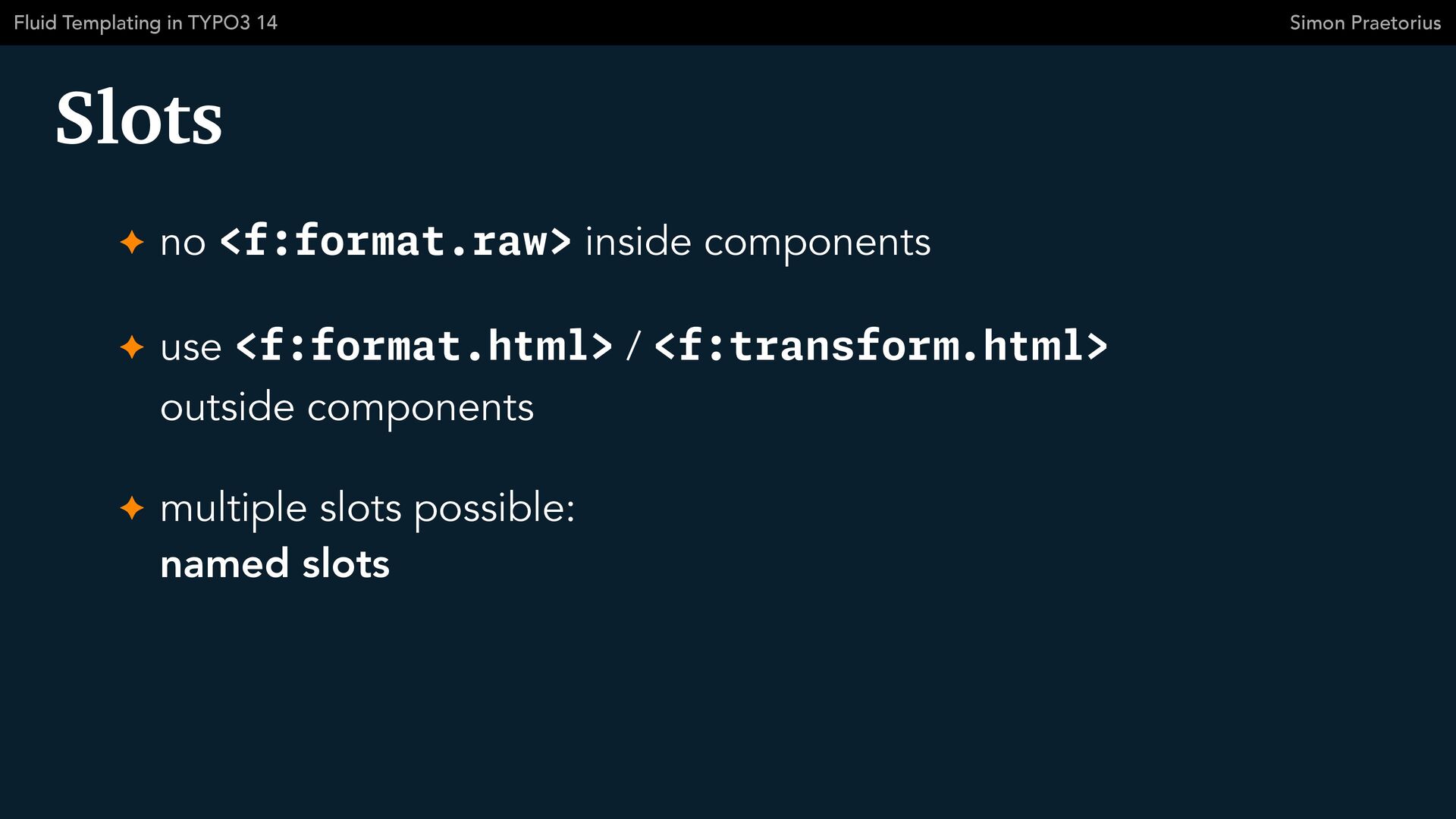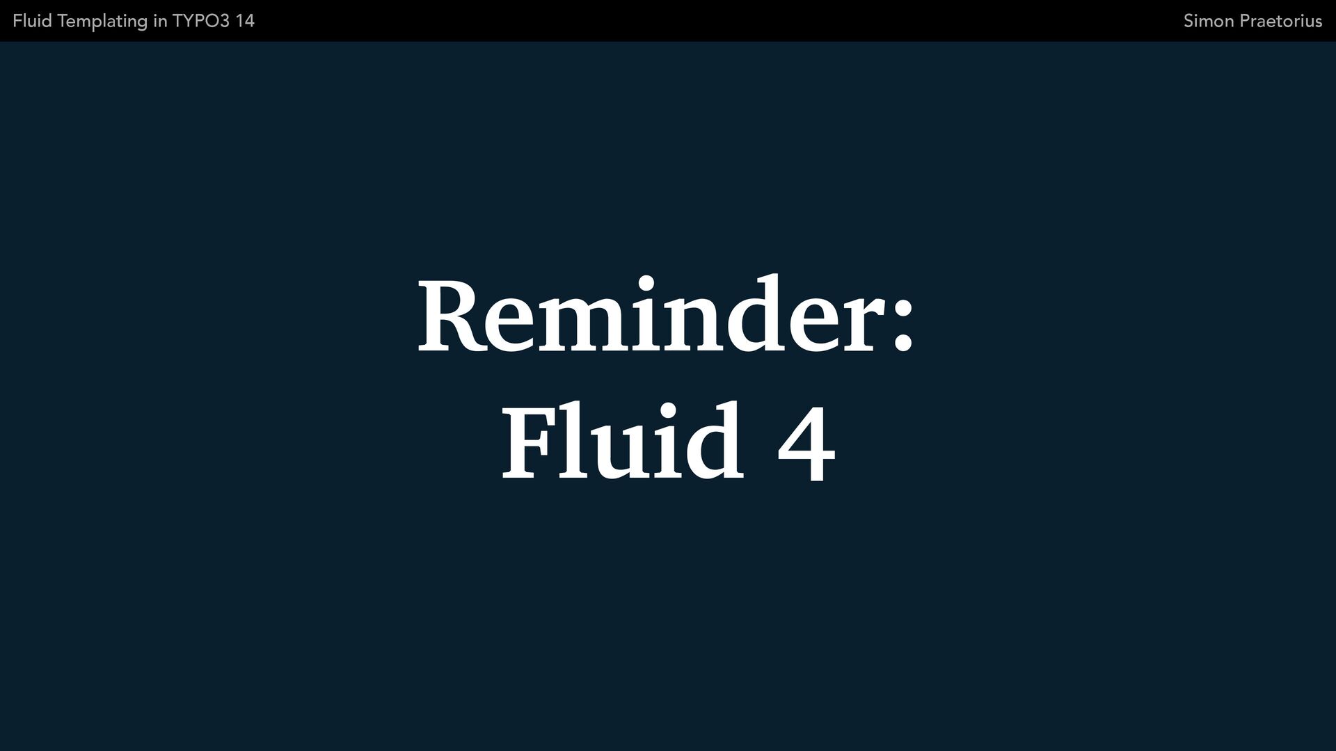 ✦ <f:length> ✦ <f: m erge> ✦ <f:starts Wi th> and <f:ends Wi th> ✦ <f:round>, <f:ceil> and <f:floor> ✦ <f: mi n> and <f: m ax> ✦ <f:contains> ✦ <f:argument> ✦ <f:slot> and <f:fragment> Fluid 4 Fluid Templating in TYPO3 14