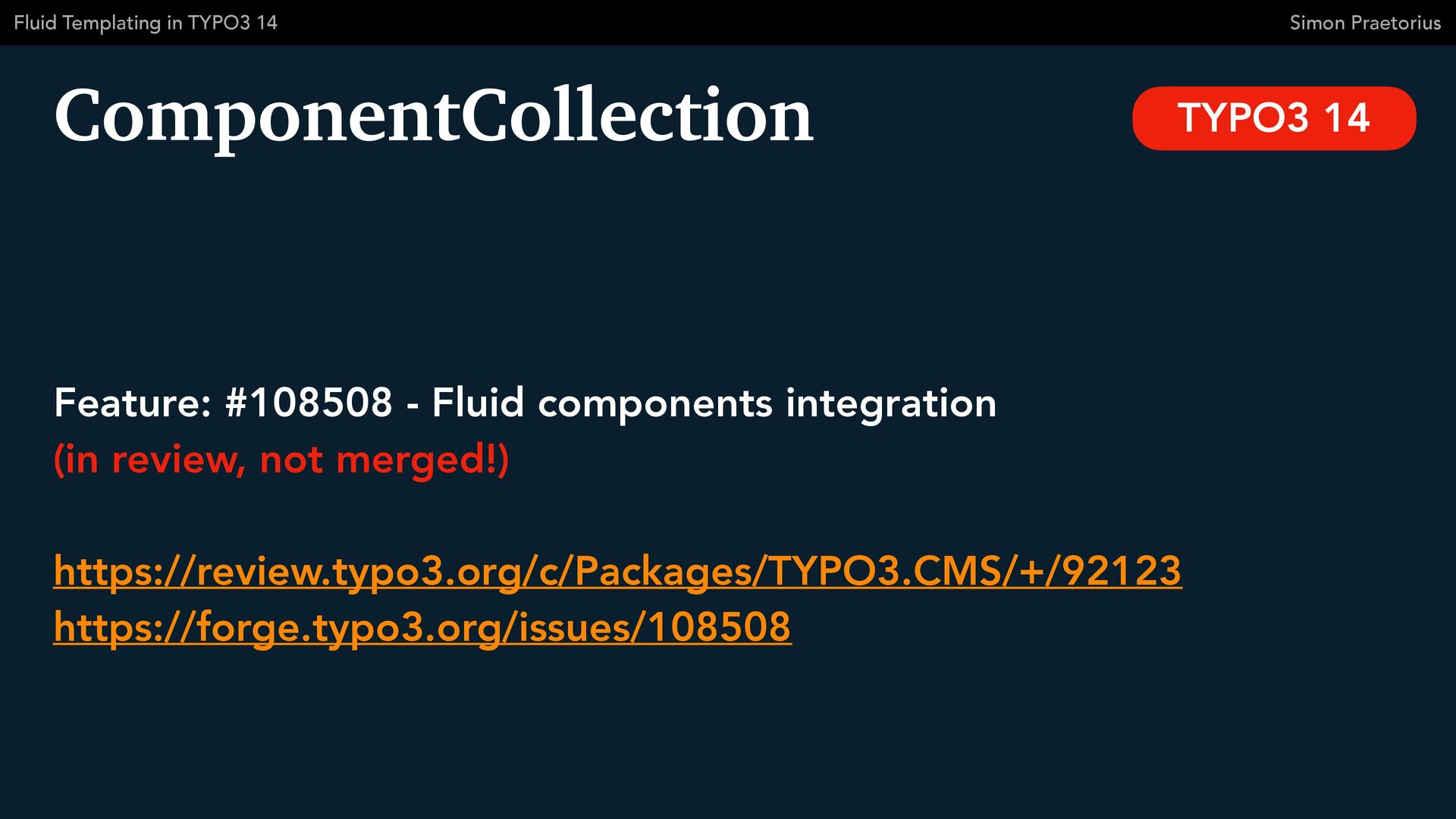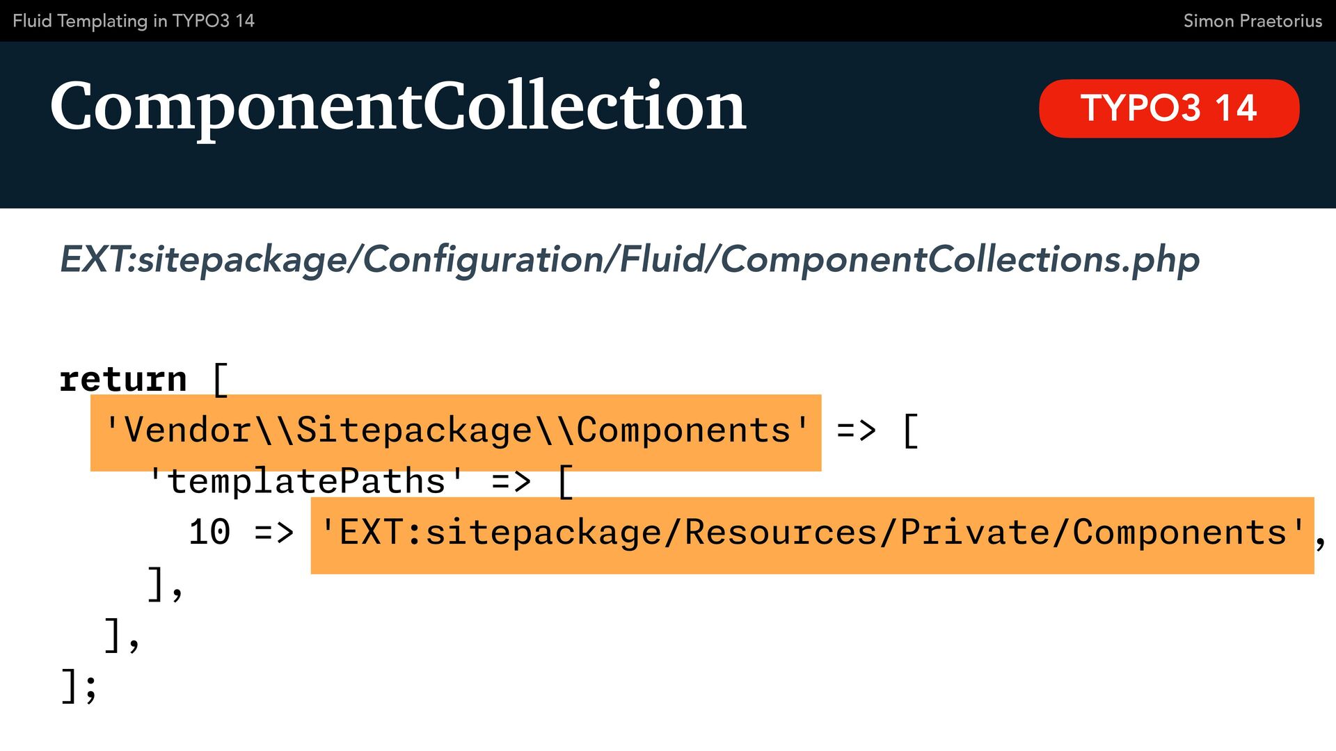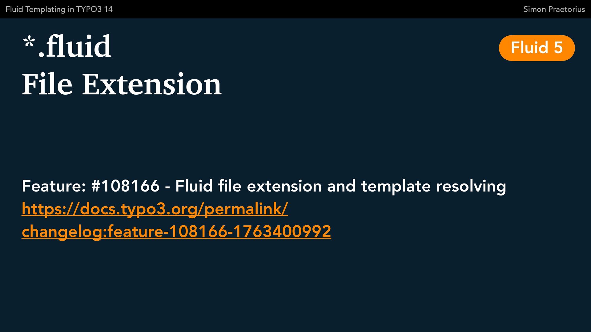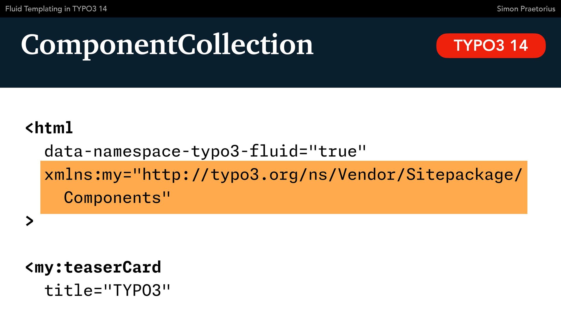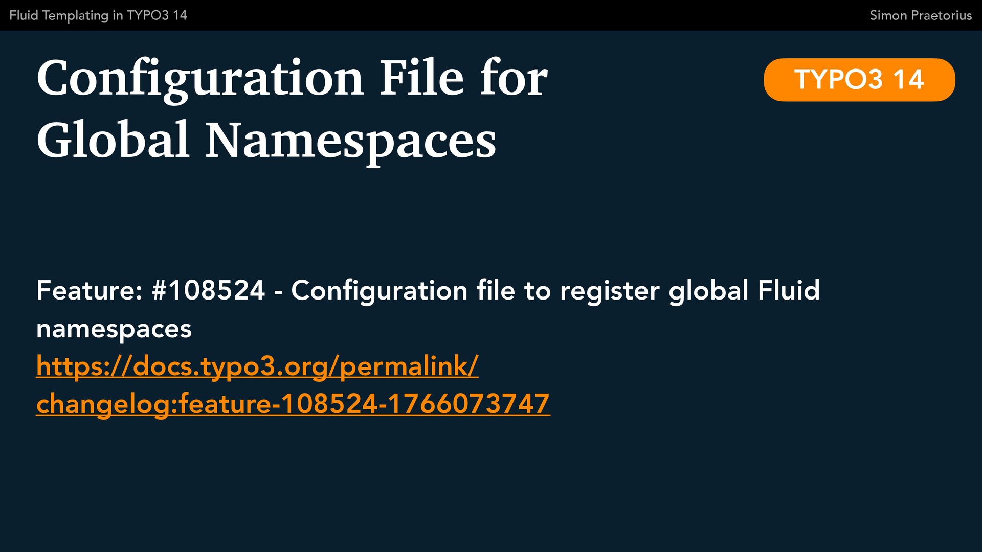 Con fi guration fi le to register global Fluid namespaces https://docs.typo3.org/permalink/ changelog:feature-108524-1766073747 Fluid Templating in TYPO3 14 TYPO3 14
