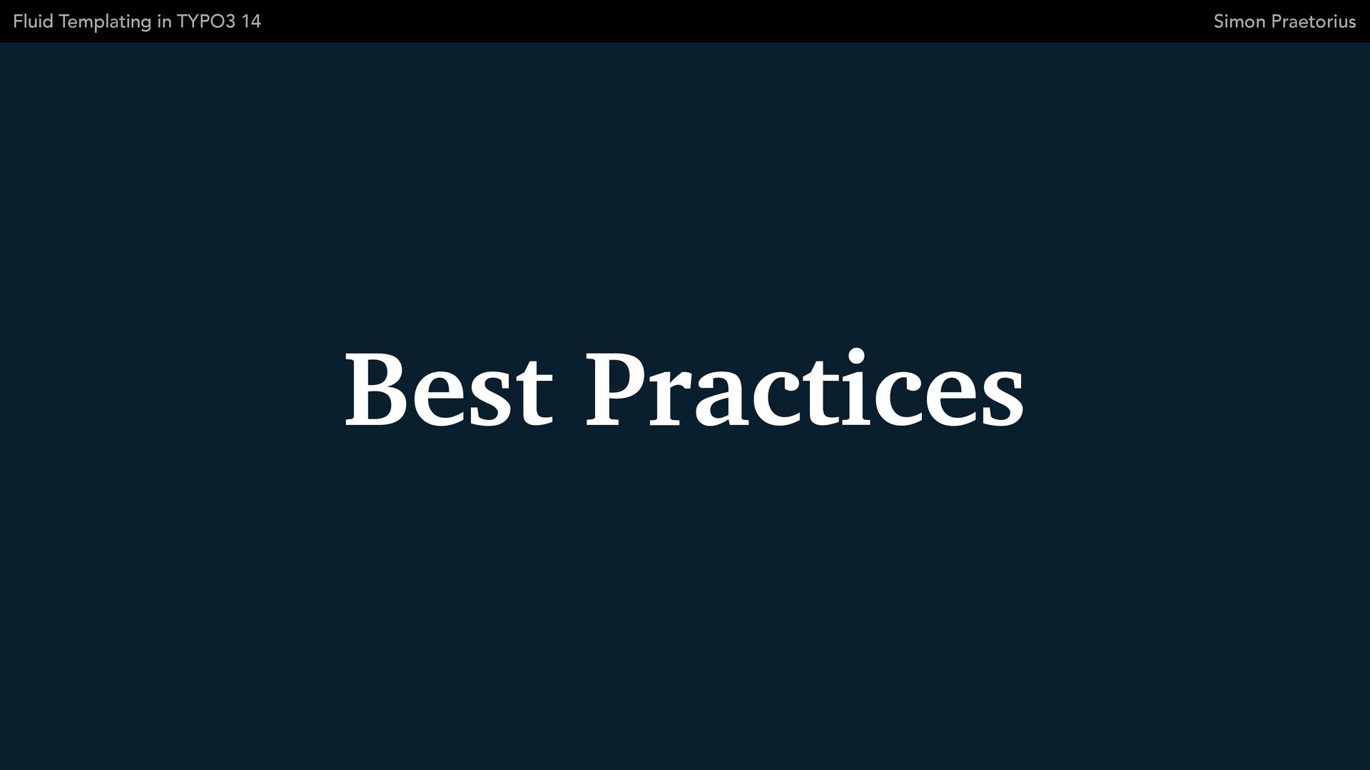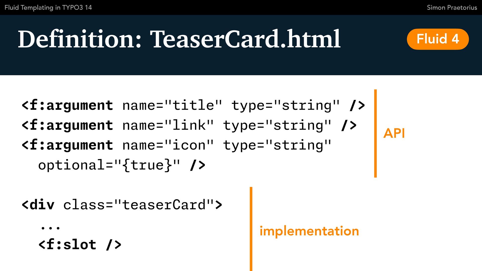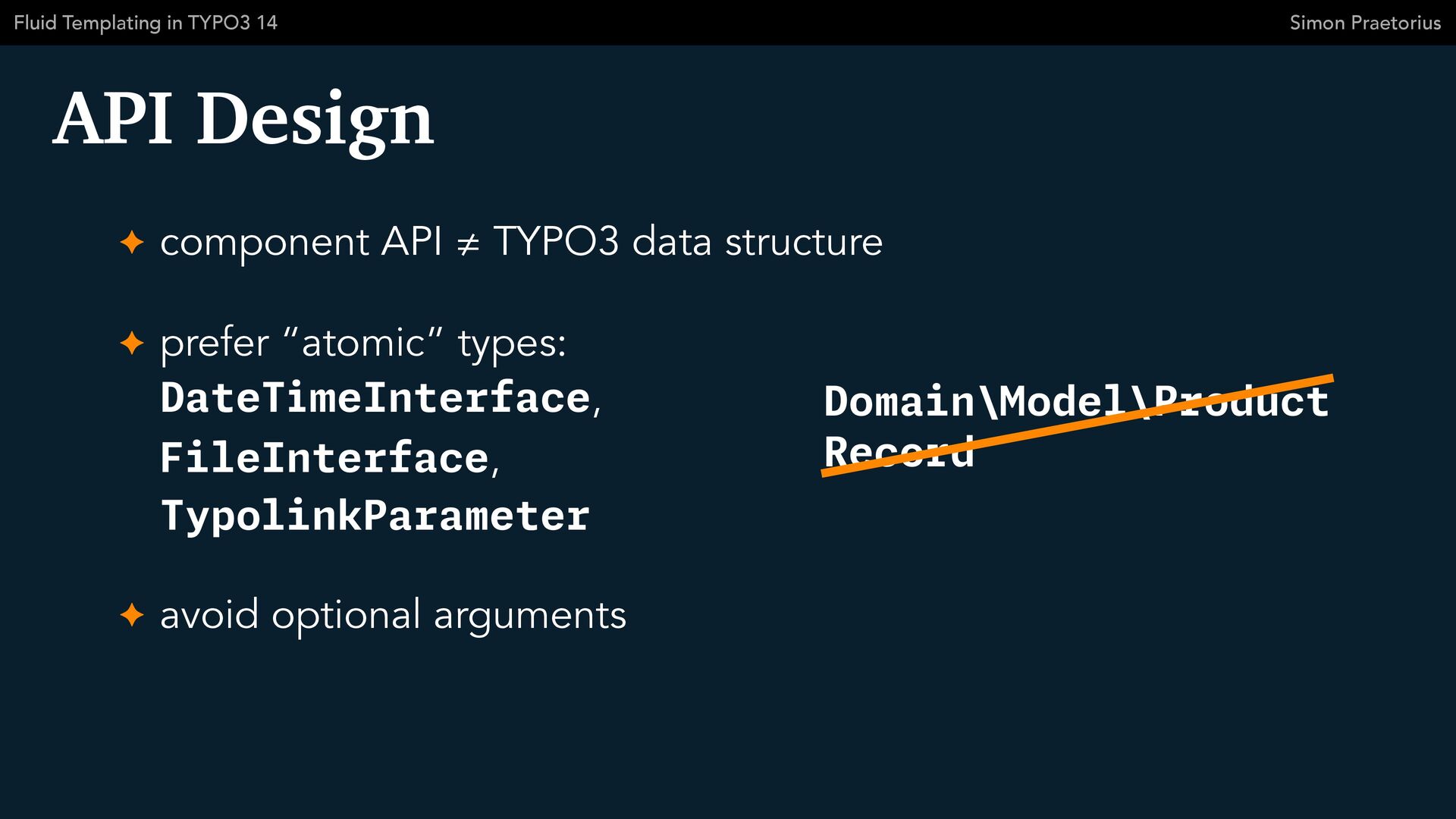 prefer “atomic” types: DateT i m eInterface, FileInterface, TypolinkParameter ✦ avoid optional arguments API Design Domain\ M odel\Product Record Fluid Templating in TYPO3 14