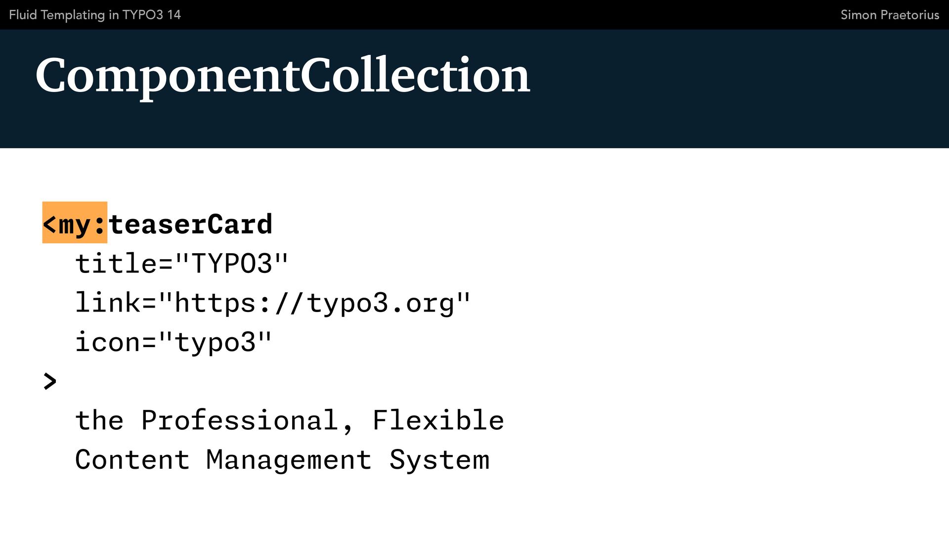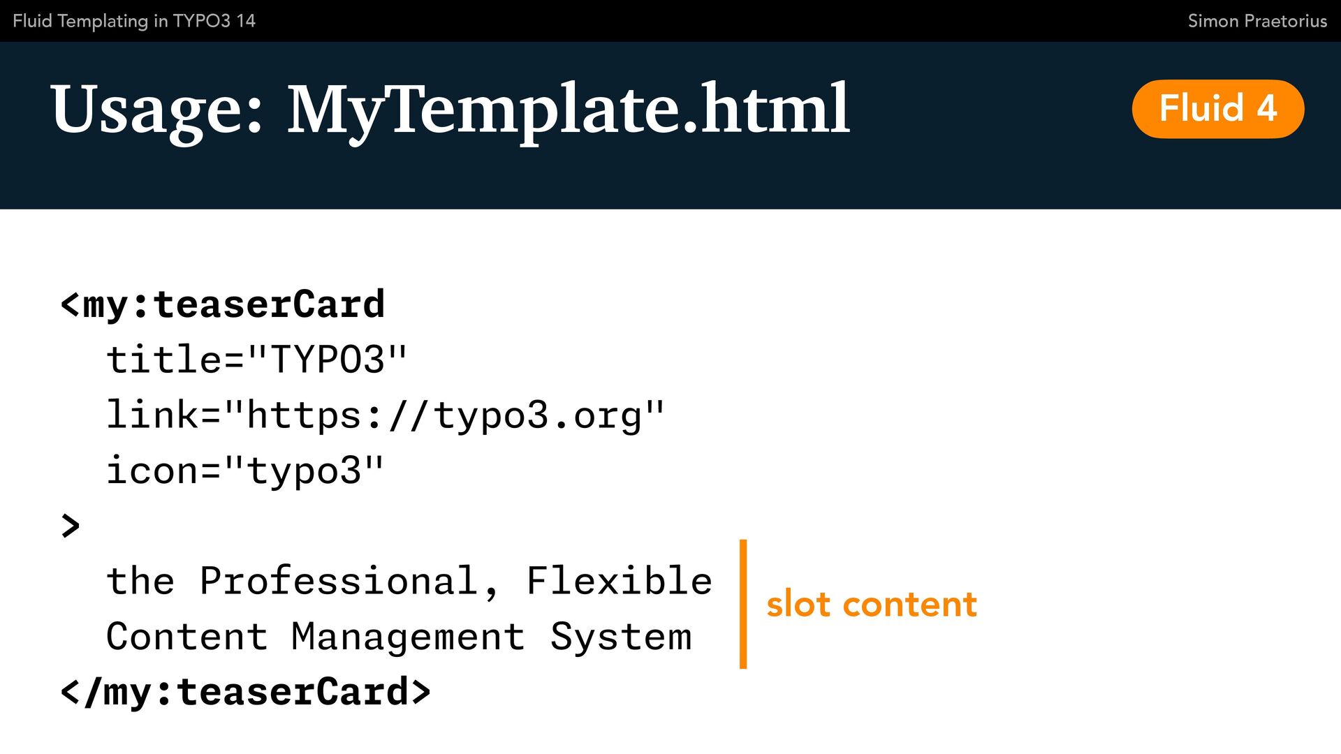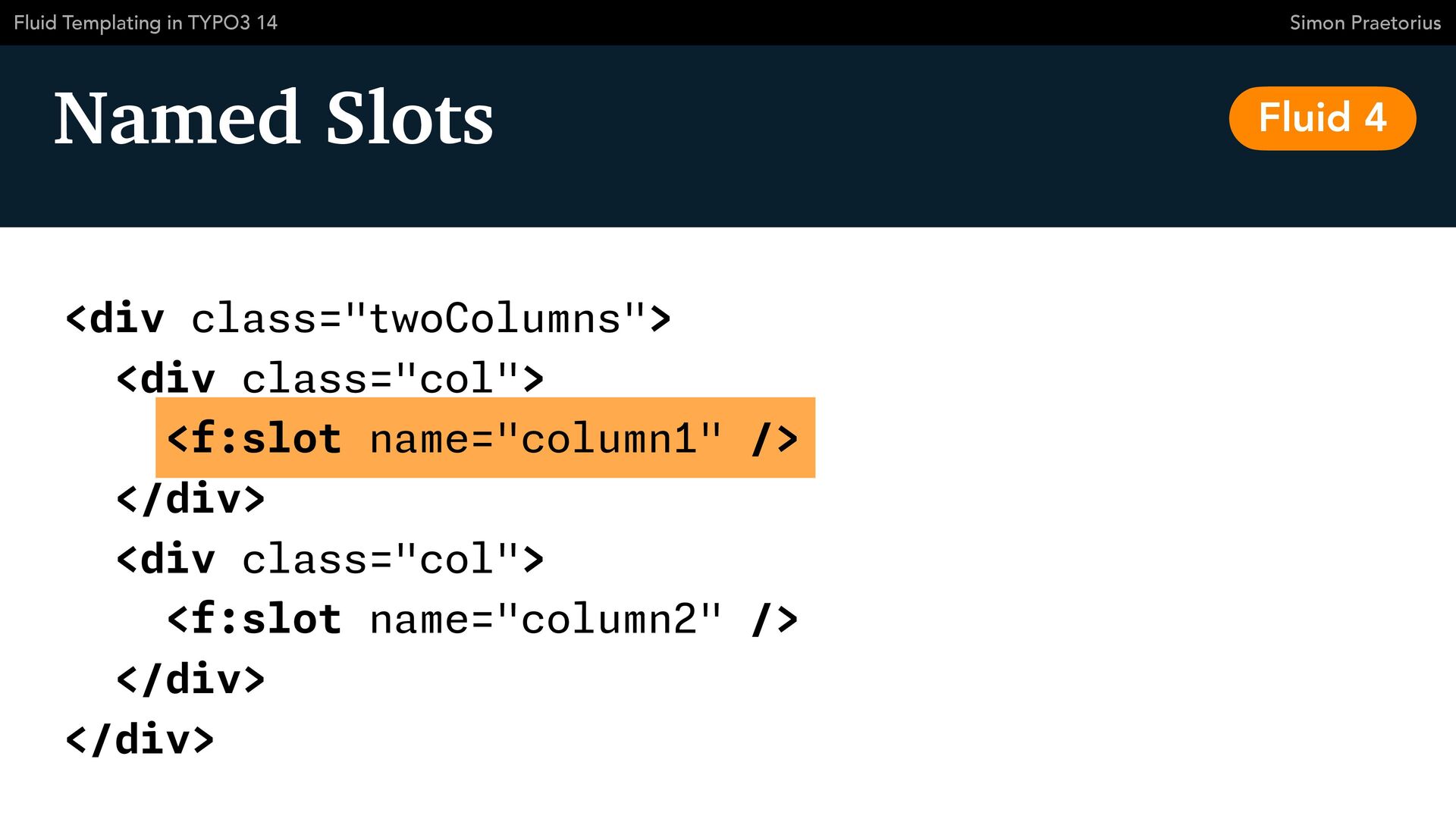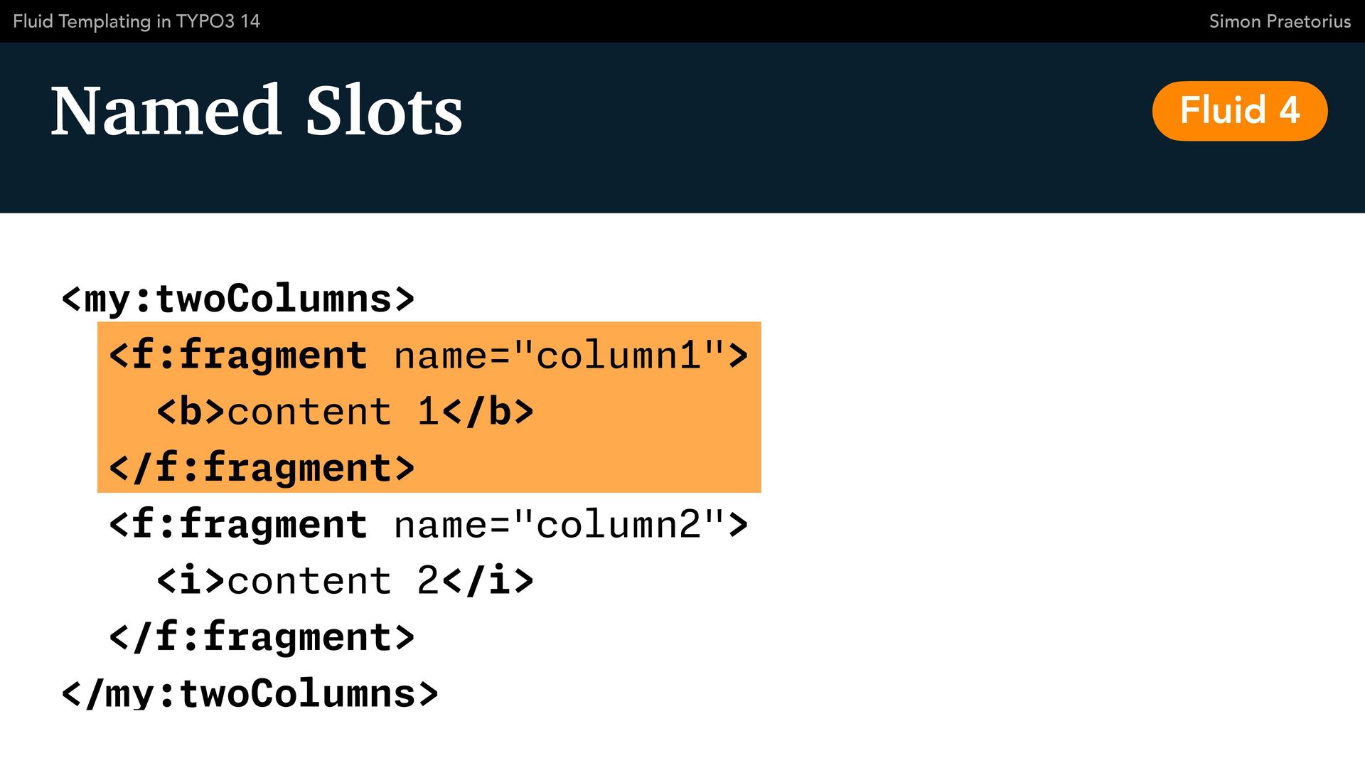 name="column1"> <b>content 1</b> </f:fragment> <f:fragment name="column2"> <i>content 2</i> </f:fragment> </ m y: t w oColumns> Fluid Templating in TYPO3 14