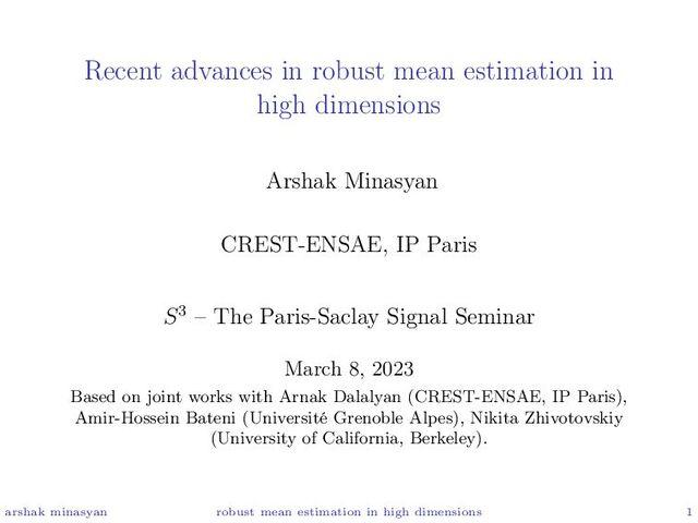 2. Bateni A.-H., Minasyan A. and Dalalyan A. Nearly minimax robust estimator of the mean vector by iterative spectral dimension reduction. arXiv preprint arXiv:2204.02323, 2022.