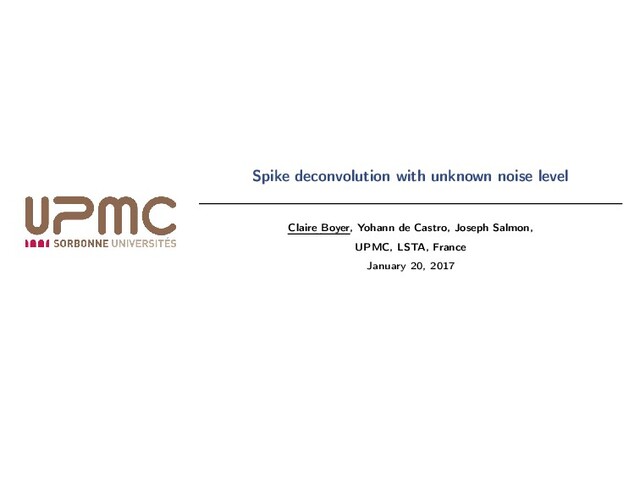 Abstract — We study sparse spikes deconvolution over the space of complex-valued measures when the input measure is a finite sum of Dirac masses. We introduce a new procedure to handle the spike deconvolution when the noise level is unknown. Prediction and localization results will be presented for this approach. An insight on the probabilistic tools used in the proofs could be briefly given as well.