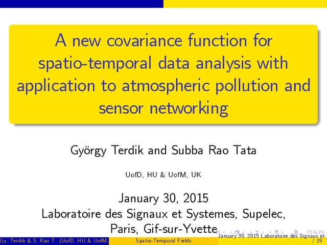second order stationary, homogeneous and isotropic, i.e. E [Z (s, t)] = µ, Var [Z (s, t)] = σ2 Z < ∞ Cov [Z (s, t) , Z (s + h, t + u)] = c (h, u) = c (khk , u) , We note that c (h, 0) and c (0, u) correspond to the purely spatial and purely temporal covariances. Spatio-temporal variogram for fZ (h, t)g 2γ (h, u) = Var [Z (s + h, t + u) Z (s, t)] . 2γ (h, u) = 2 [c (0, 0) c (h, u)] , for an isotropic process, γ (h, u) = γ (khk , u). Gy. Terdik & S. Rao T. (UofD, HU & UofM, UK ) Spatio-Temporal Fields January 30, 2015 Laboratoire des Signaux et S / 19