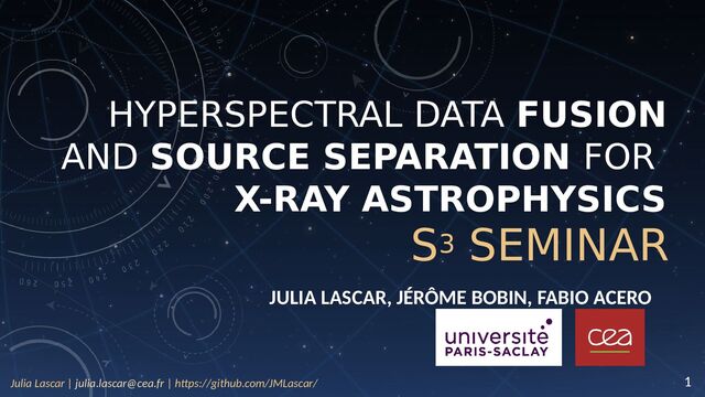 Julia Lascar is a 2nd year PhD student working at the CEA with Jérôme Bobin and Fabio Acero. Her research focuses on implementing signal processing algorithms applied to hyperspectral X-ray astrophysics, with a particular interest in supernova remnants. She has a Master’s degree in astrophysics from McGill University, Montreal, and a M2 in statistics from ENSAI, Rennes. Before that, she studied Physics and Philosophy at King’s College London.