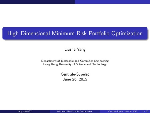 Biography — Liusha Yang received the B.S. in Communication Engineering from the Beijing University of Posts and Telecommunications in 2012. Currently, she is a Ph.D. student in the Department of Electronic and Computer Engineering at the Hong Kong University of Science and Technology. Her research interests include random matrix theory and signal processing, with applications in financial engineering.