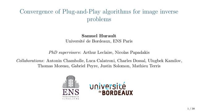 Abstract — Plug-and-play methods constitute a class of iterative algorithms for imaging inverse problems where regularization is performed by an off-the-shelf Gaussian denoiser. These methods have demonstrated impressive visual results, particularly when the denoiser is parameterized by deep neural networks. However, the theoretical convergence of PnP methods has yet to be fully established. This talk begins with an overview of the literature on PnP algorithms, followed by the introduction of new convergence results for these methods when paired with specific denoisers. Our analysis shows that the resulting PnP algorithms converge to stationary points of explicit nonconvex functionals. These algorithms are then applied to various ill-posed inverse problems, including deblurring, super-resolution, and inpainting. Finally, to address inverse problems corrupted by Poisson noise, we will introduce a novel Bregman version of PnP based on the Bregman Proximal Gradient (BPG) optimization algorithm.