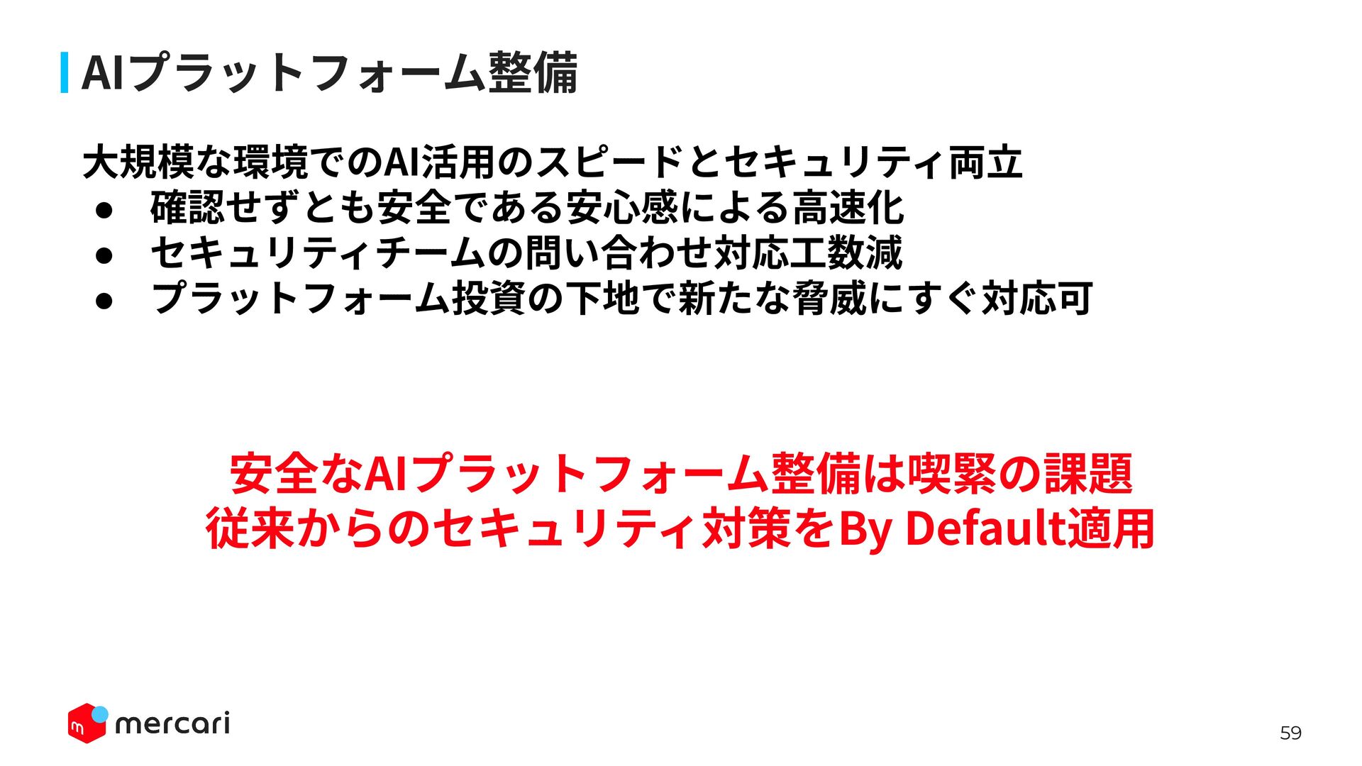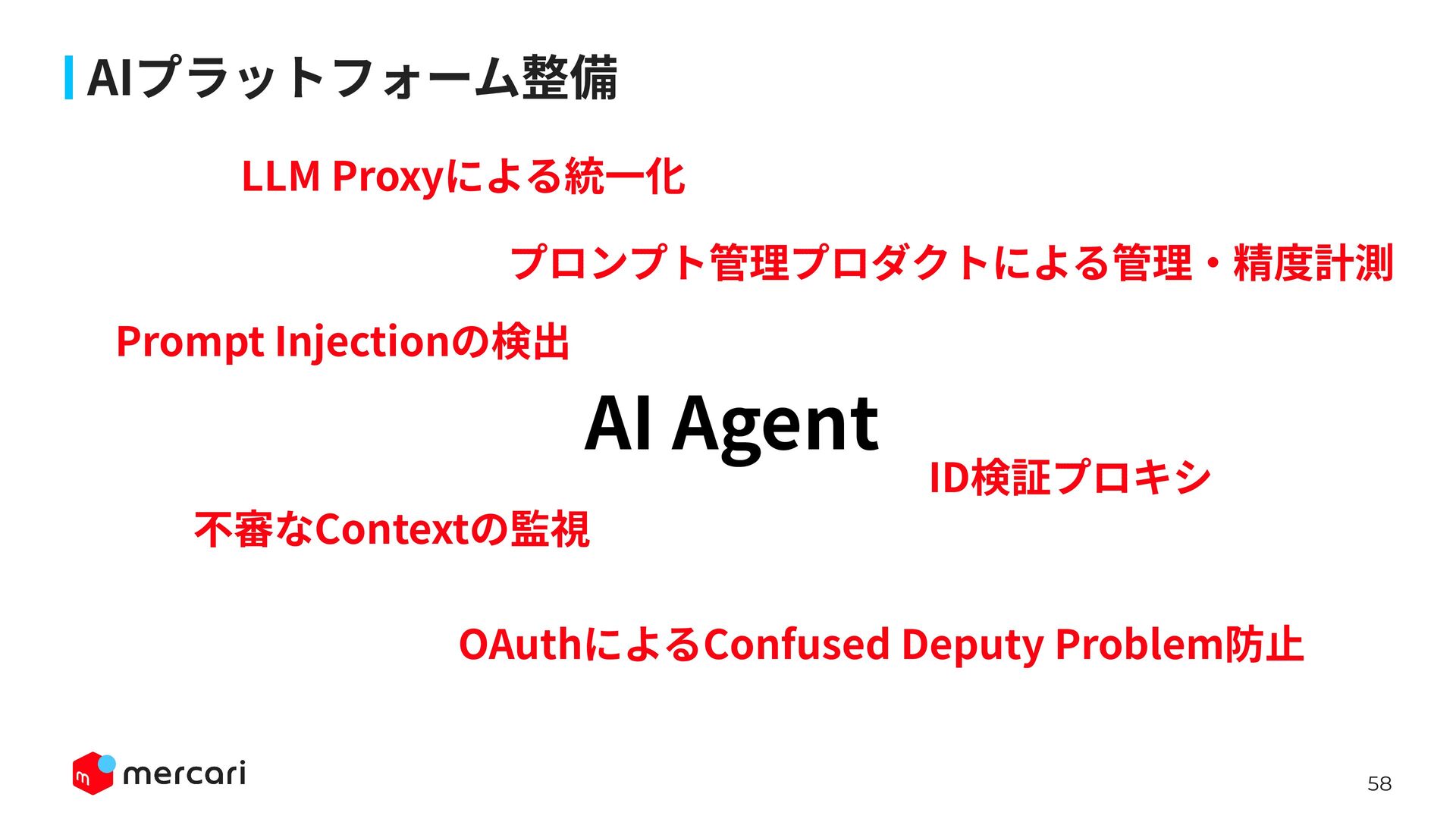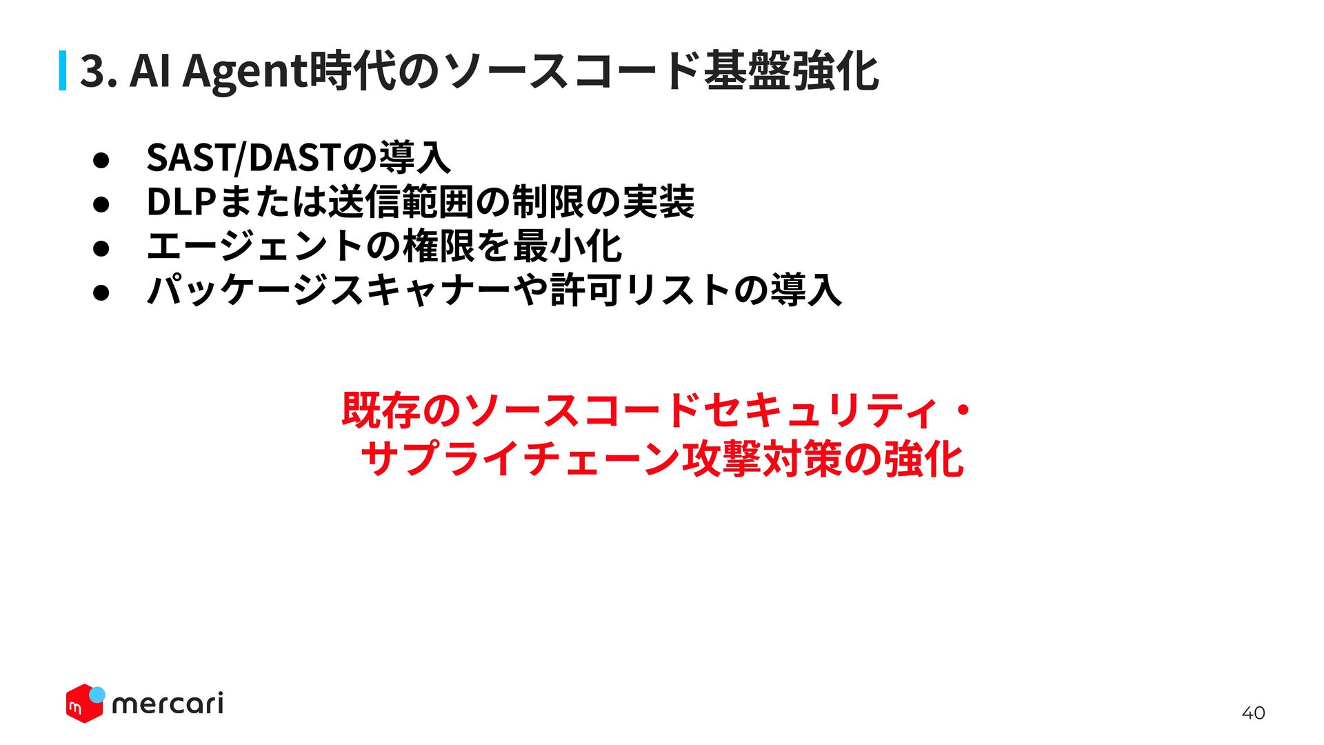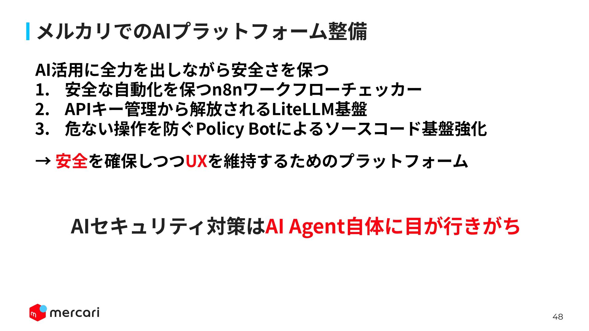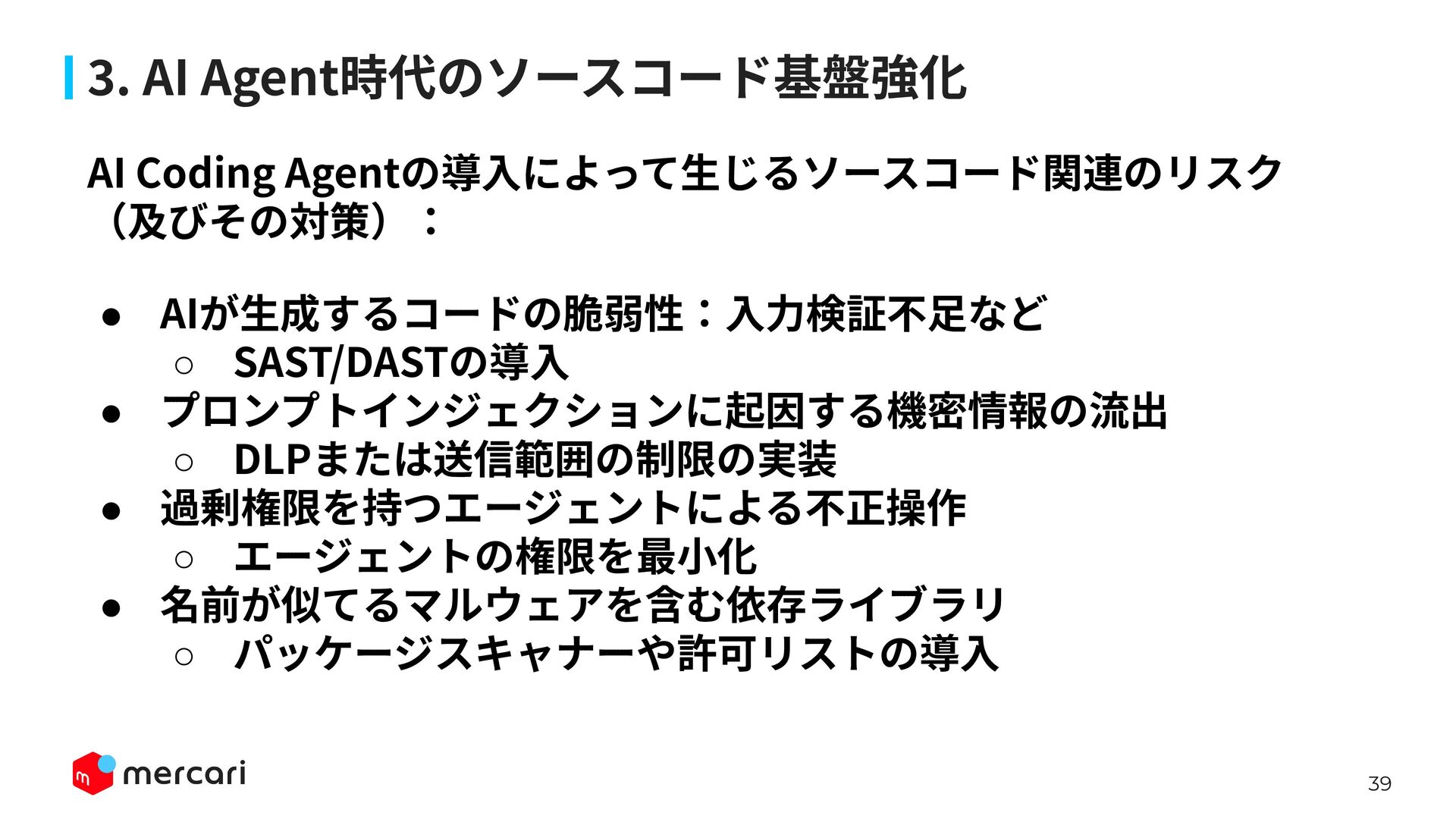AIセキュリティではAIに特有の対策だけでなく、従来からのセキュリティ対策が依然として有効であり、自律型エージェントの時代にむしろ重要性が増しています。適切なアイデンティティ管理とアクセス制御、最小権限の原則や変更管理が欠ければ、AIのスケールの速さによって脆弱性がすぐに顕在化します。 本講演では、代表的な課題と対処法、そして既存のセキュリティ原則から得られる示唆を議論します。最後に、MercariにおけるAIセキュリティへの取り組みから生産性向上とセキュリティ確保の両立について紹介します。