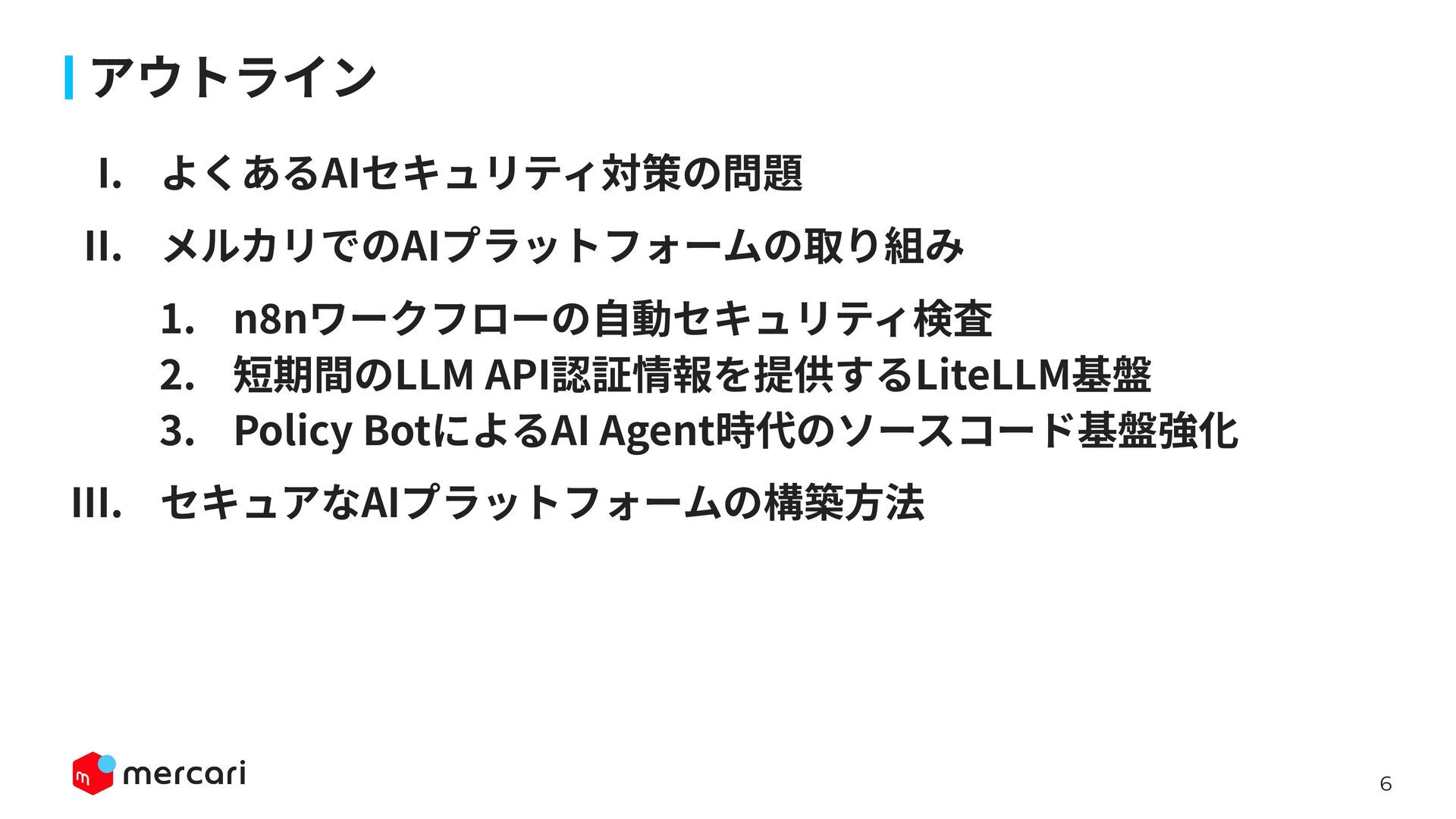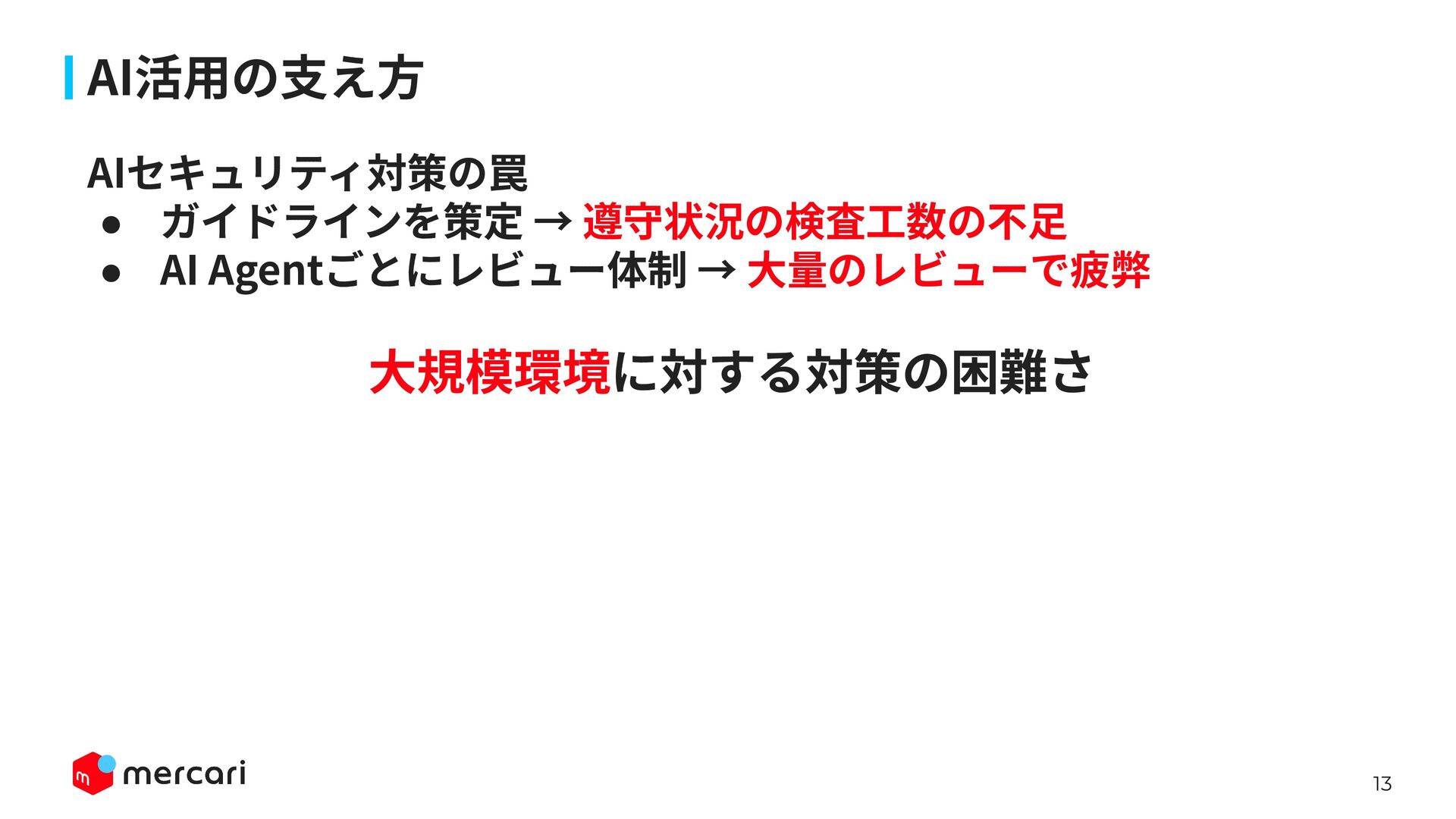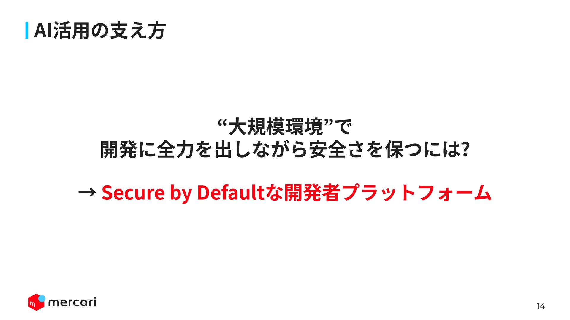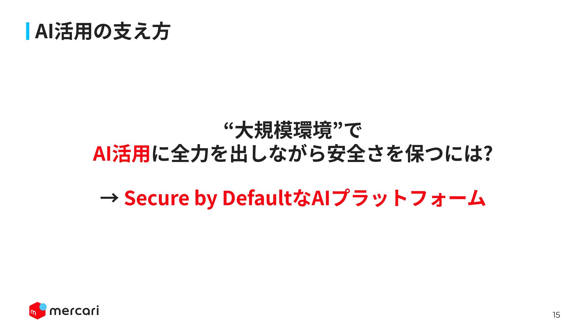 AIセキュリティではAIに特有の対策だけでなく、従来からのセキュリティ対策が依然として有効であり、自律型エージェントの時代にむしろ重要性が増しています。適切なアイデンティティ管理とアクセス制御、最小権限の原則や変更管理が欠ければ、AIのスケールの速さによって脆弱性がすぐに顕在化します。 本講演では、代表的な課題と対処法、そして既存のセキュリティ原則から得られる示唆を議論します。最後に、MercariにおけるAIセキュリティへの取り組みから生産性向上とセキュリティ確保の両立について紹介します。