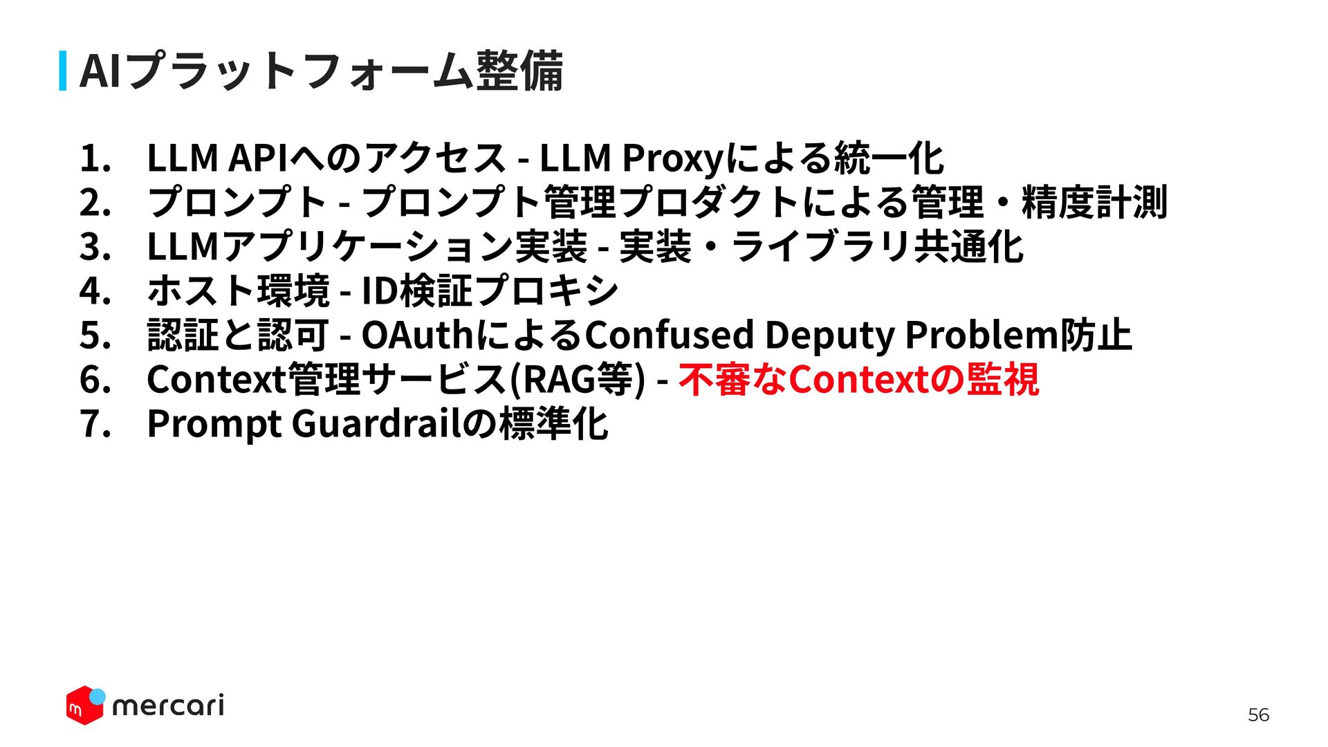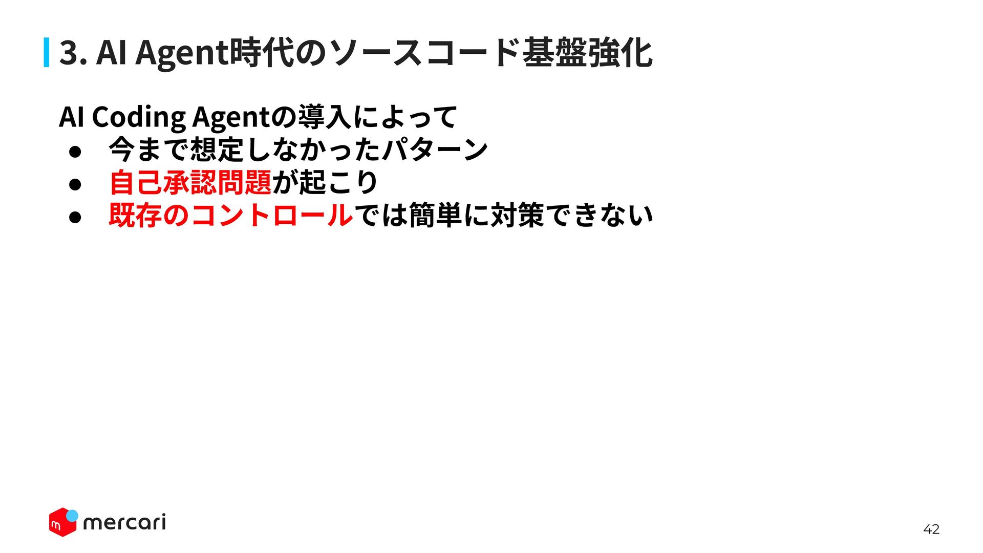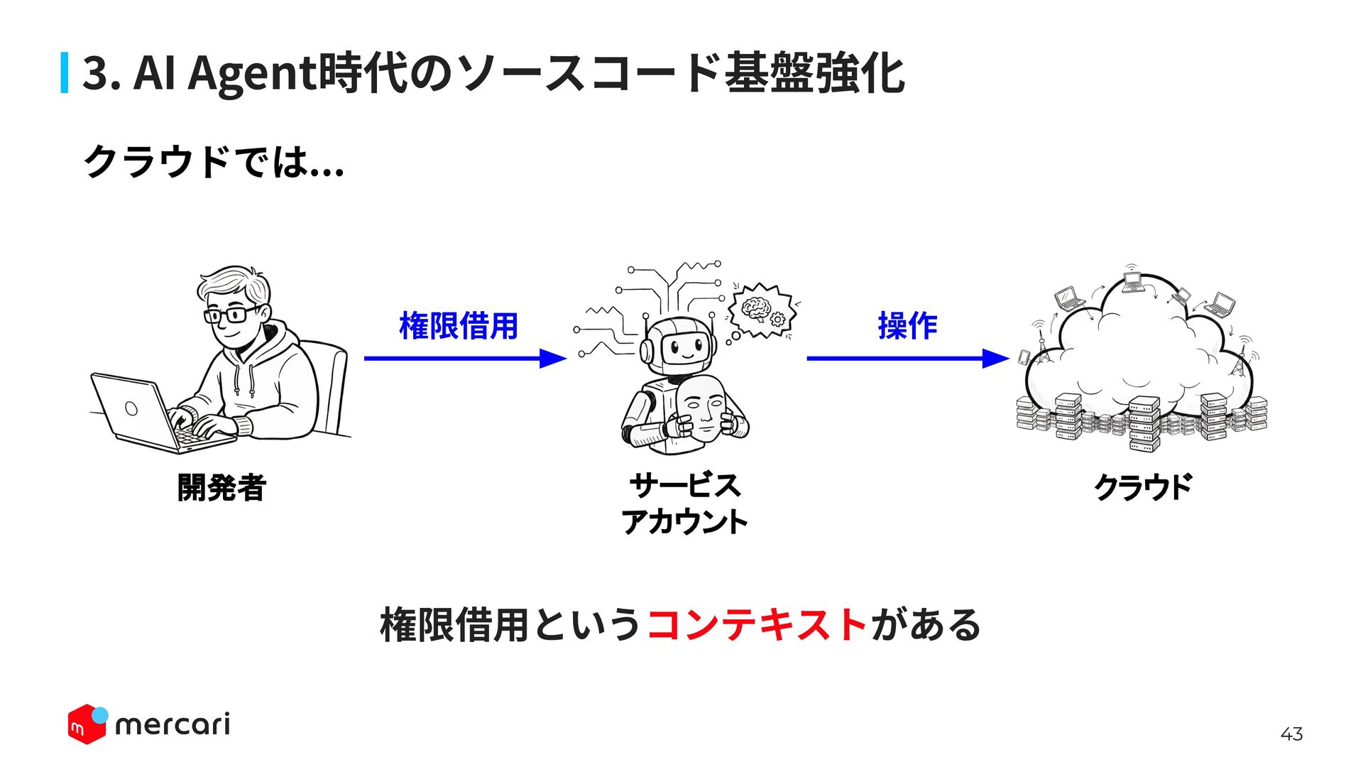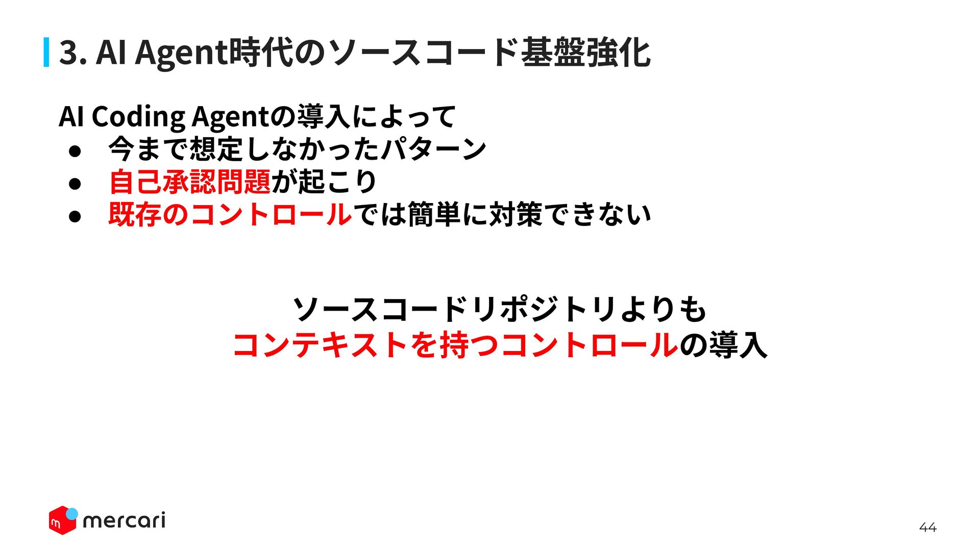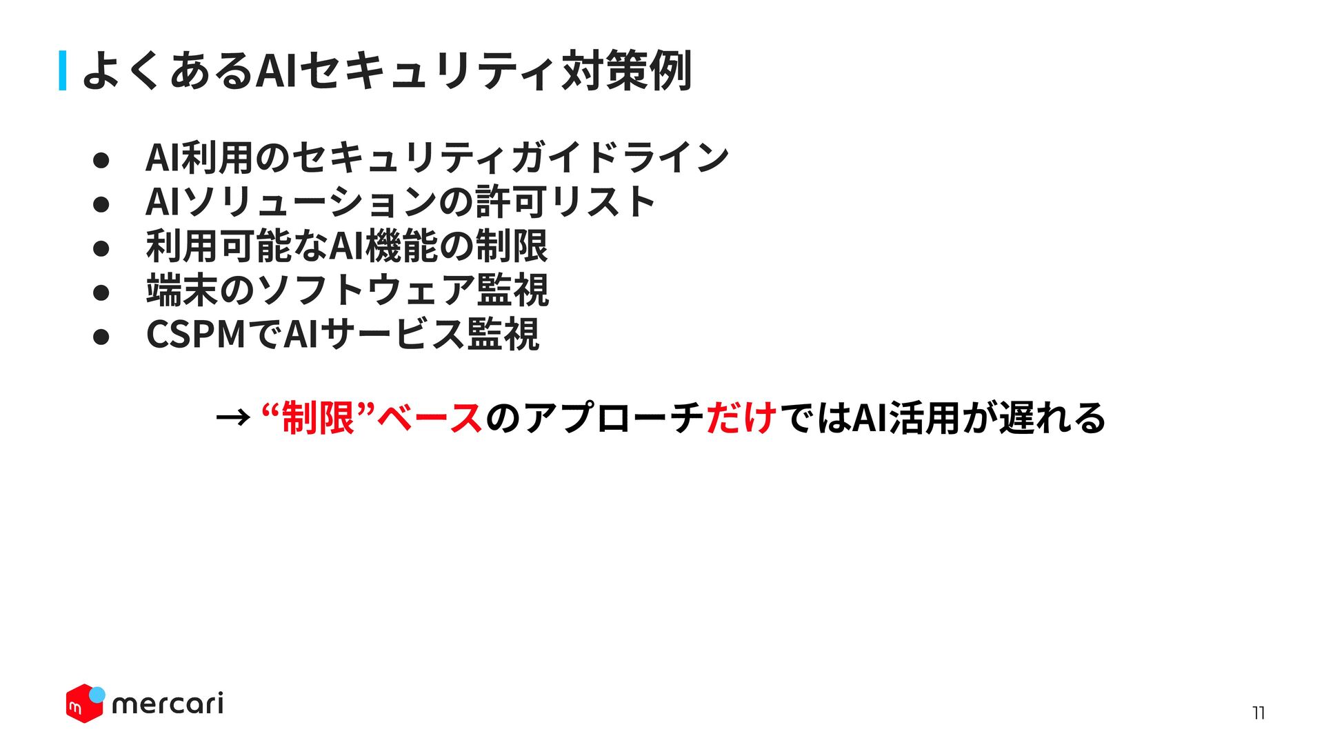 AIセキュリティではAIに特有の対策だけでなく、従来からのセキュリティ対策が依然として有効であり、自律型エージェントの時代にむしろ重要性が増しています。適切なアイデンティティ管理とアクセス制御、最小権限の原則や変更管理が欠ければ、AIのスケールの速さによって脆弱性がすぐに顕在化します。 本講演では、代表的な課題と対処法、そして既存のセキュリティ原則から得られる示唆を議論します。最後に、MercariにおけるAIセキュリティへの取り組みから生産性向上とセキュリティ確保の両立について紹介します。