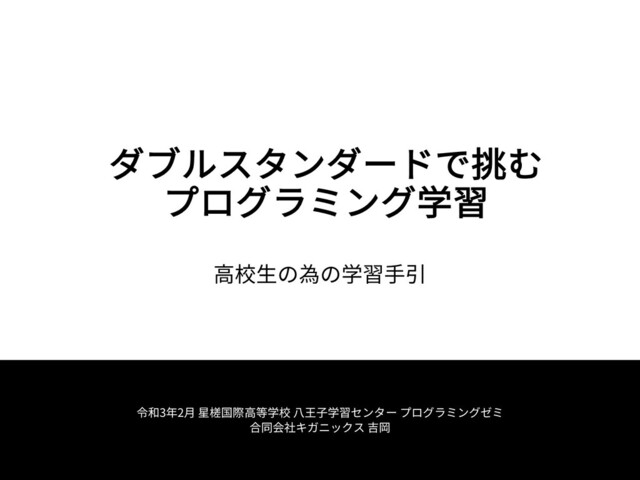 令和3年2⽉ 星槎国際⾼等学校 ⼋王⼦学習センター プログラミングゼミ 合同会社キガニックス 吉岡 ⾼校⽣の為の学習⼿引 ダブルスタンダードで挑む プログラミング学習
