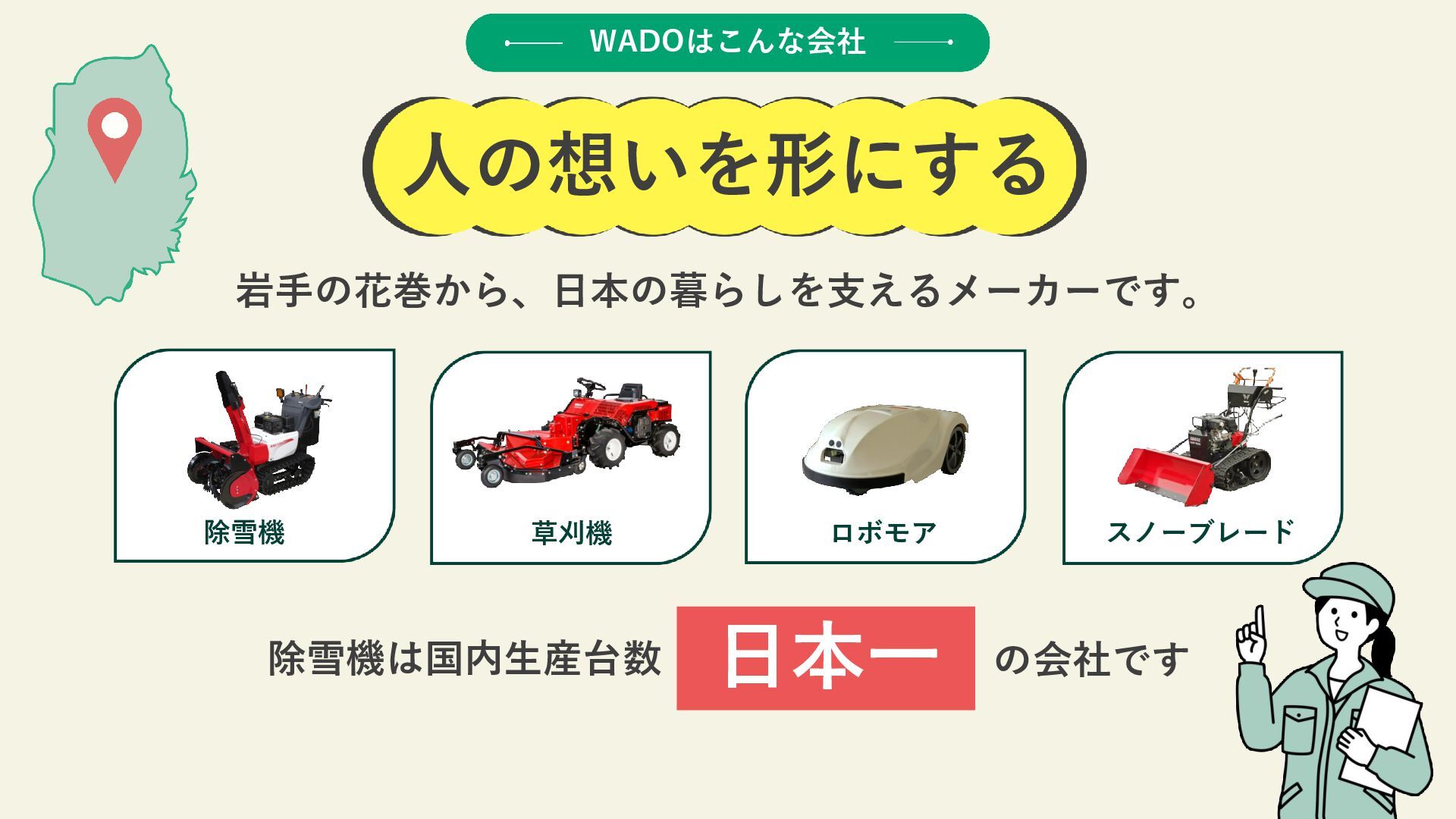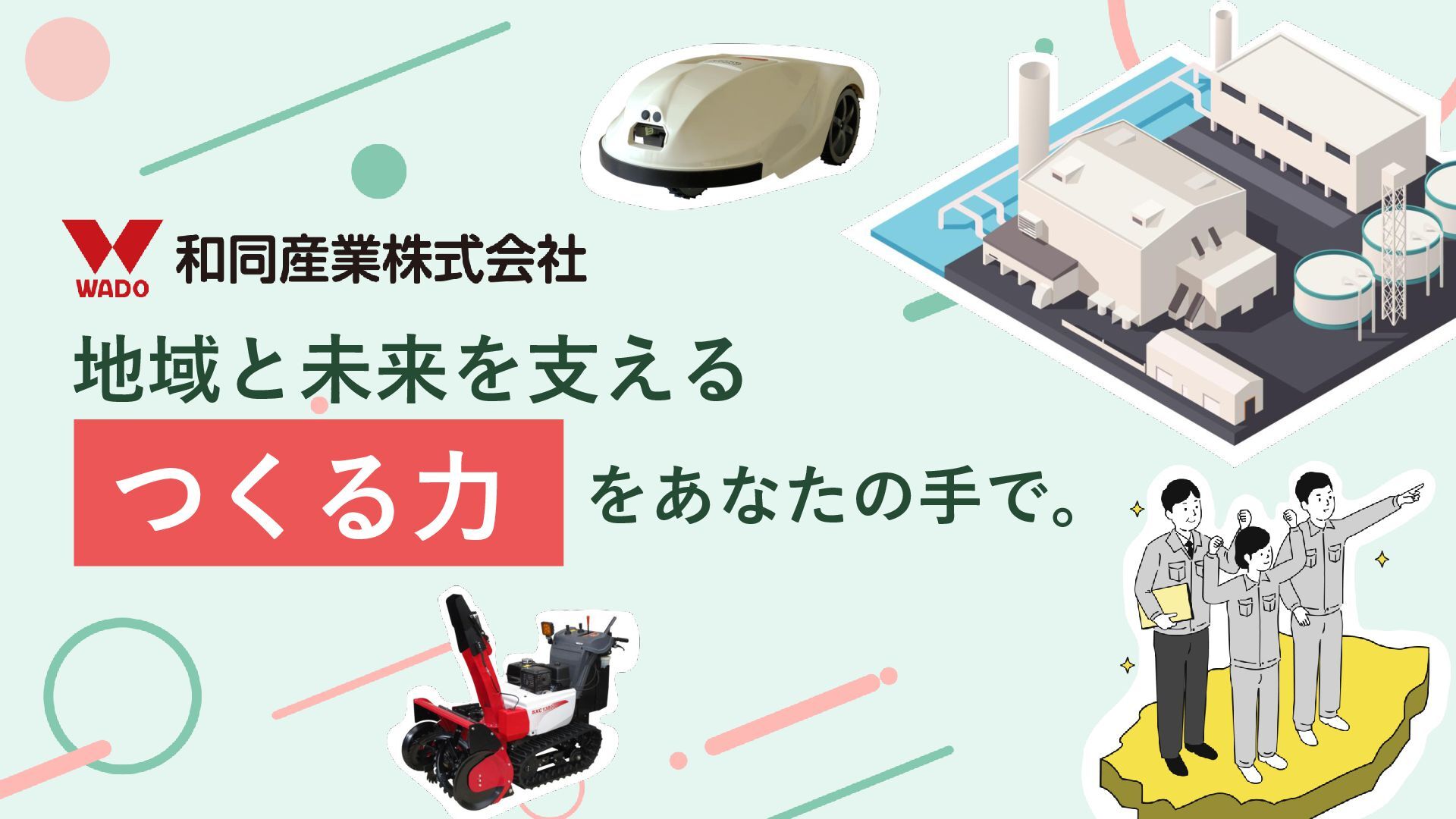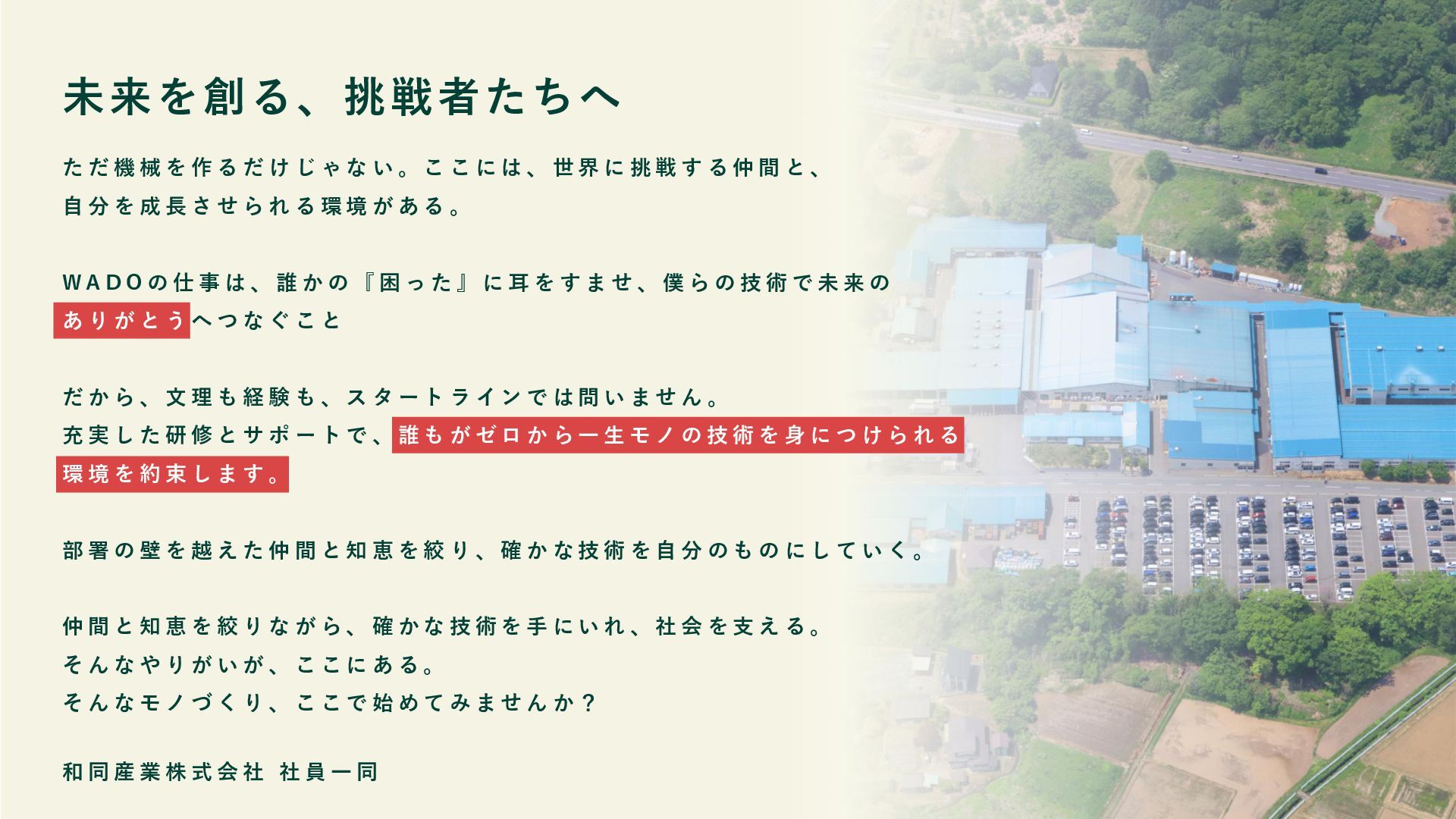 じ ゃ な い 。 こ こ に は 、 世 界 に 挑 戦 す る 仲 間 と 、 自 分 を 成 長 さ せ ら れ る 環 境 が あ る 。 W A D O の 仕 事 は 、 誰 か の 『 困 っ た 』 に 耳 を す ま せ 、 僕 ら の 技 術 で 未 来 の あ り が と う へ つ な ぐ こ と だ か ら 、 文 理 も 経 験 も 、 ス タ ー ト ラ イ ン で は 問 い ま せ ん 。 充 実 し た 研 修 と サ ポ ー ト で 、 誰 も が ゼ ロ か ら 一 生 モ ノ の 技 術 を 身 に つ け ら れ る 環 境 を 約 束 し ま す 。 部 署 の 壁 を 越 え た 仲 間 と 知 恵 を 絞 り 、 確 か な 技 術 を 自 分 の も の に し て い く 。 仲 間 と 知 恵 を 絞 り な が ら 、 確 か な 技 術 を 手 に い れ 、 社 会 を 支 え る 。 そ ん な や り が い が 、 こ こ に あ る 。 そ ん な モ ノ づ く り 、 こ こ で 始 め て み ま せ ん か ? 和 同 産 業 株 式 会 社 社 員 一 同