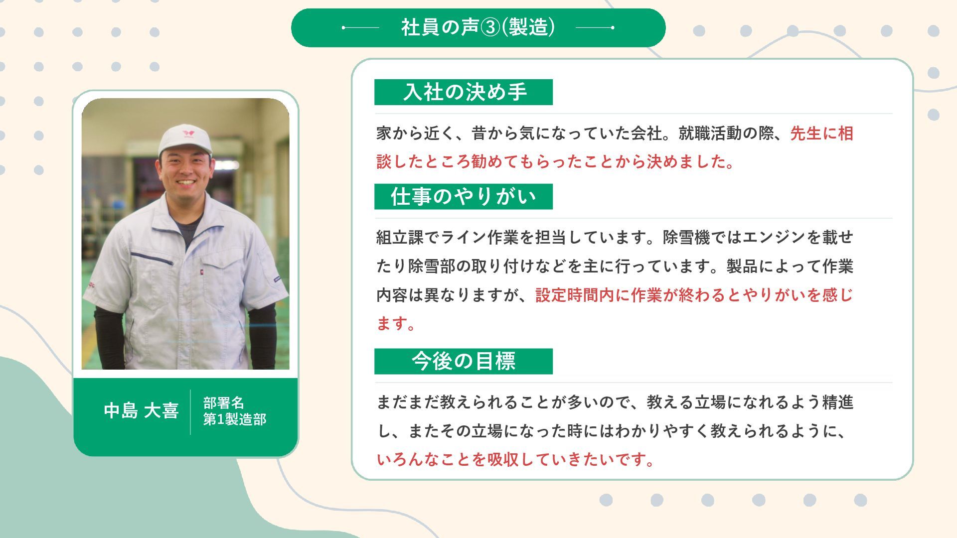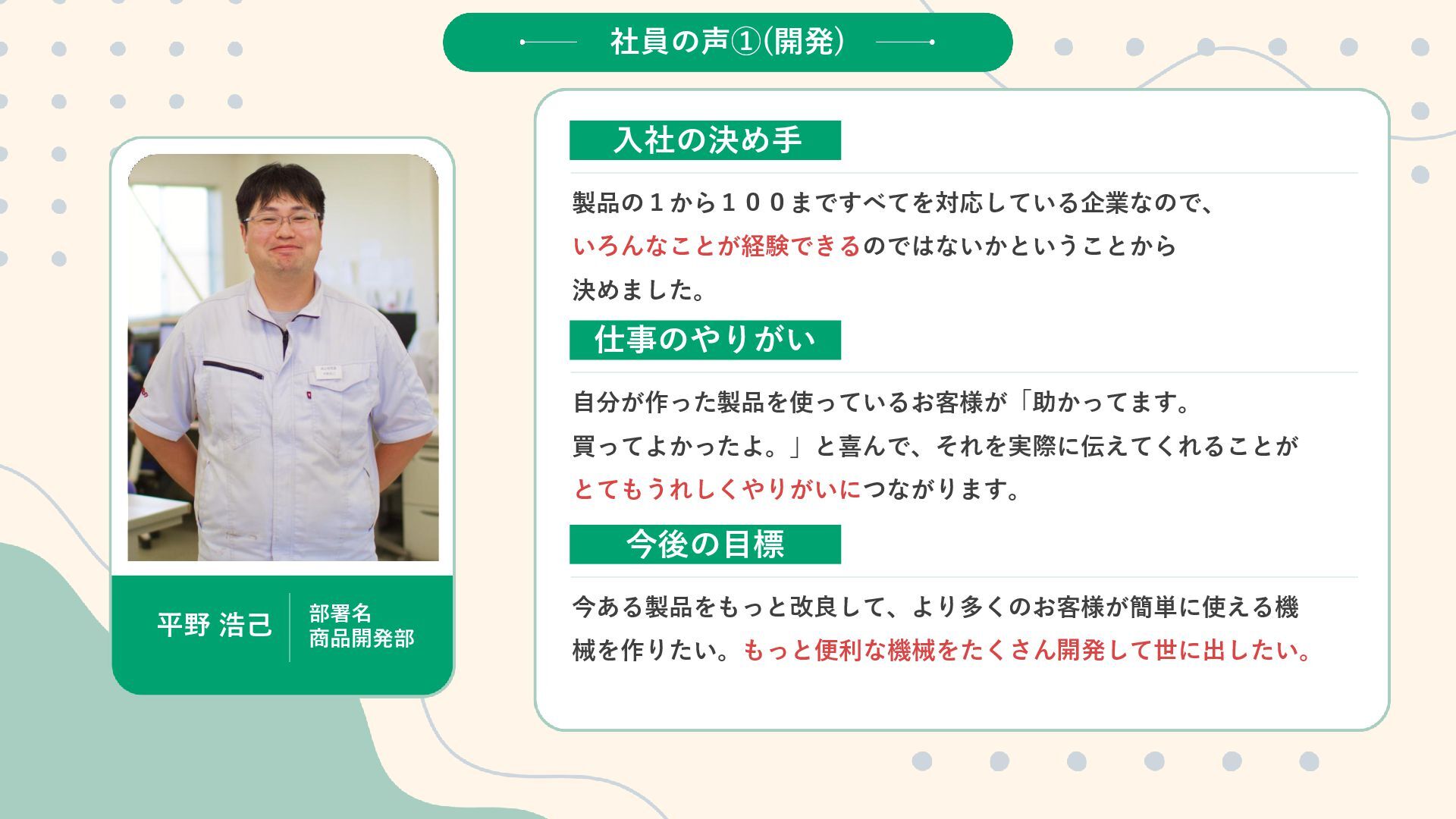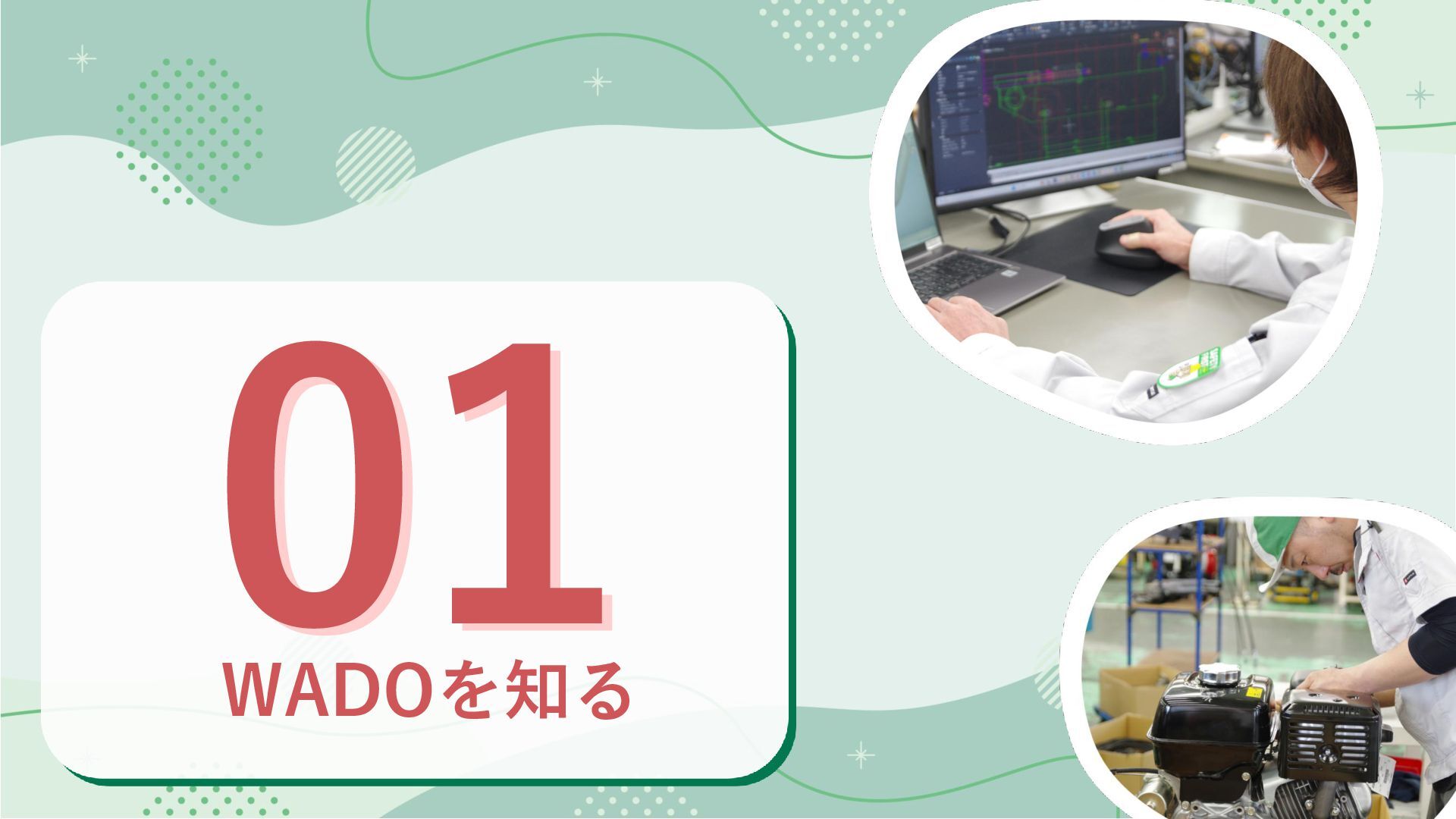 じ ゃ な い 。 こ こ に は 、 世 界 に 挑 戦 す る 仲 間 と 、 自 分 を 成 長 さ せ ら れ る 環 境 が あ る 。 W A D O の 仕 事 は 、 誰 か の 『 困 っ た 』 に 耳 を す ま せ 、 僕 ら の 技 術 で 未 来 の あ り が と う へ つ な ぐ こ と だ か ら 、 文 理 も 経 験 も 、 ス タ ー ト ラ イ ン で は 問 い ま せ ん 。 充 実 し た 研 修 と サ ポ ー ト で 、 誰 も が ゼ ロ か ら 一 生 モ ノ の 技 術 を 身 に つ け ら れ る 環 境 を 約 束 し ま す 。 部 署 の 壁 を 越 え た 仲 間 と 知 恵 を 絞 り 、 確 か な 技 術 を 自 分 の も の に し て い く 。 仲 間 と 知 恵 を 絞 り な が ら 、 確 か な 技 術 を 手 に い れ 、 社 会 を 支 え る 。 そ ん な や り が い が 、 こ こ に あ る 。 そ ん な モ ノ づ く り 、 こ こ で 始 め て み ま せ ん か ? 和 同 産 業 株 式 会 社 社 員 一 同