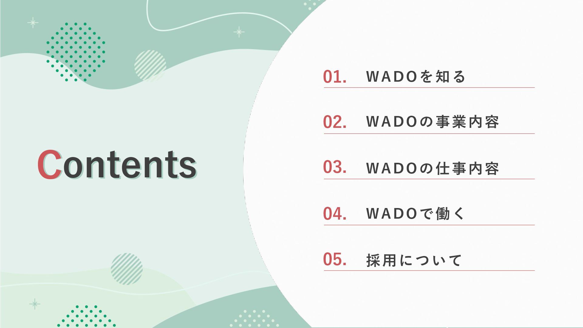 1. Contents ontents C 01. 02. 03. 04. 05. WADOを知る WADOの事業内容
