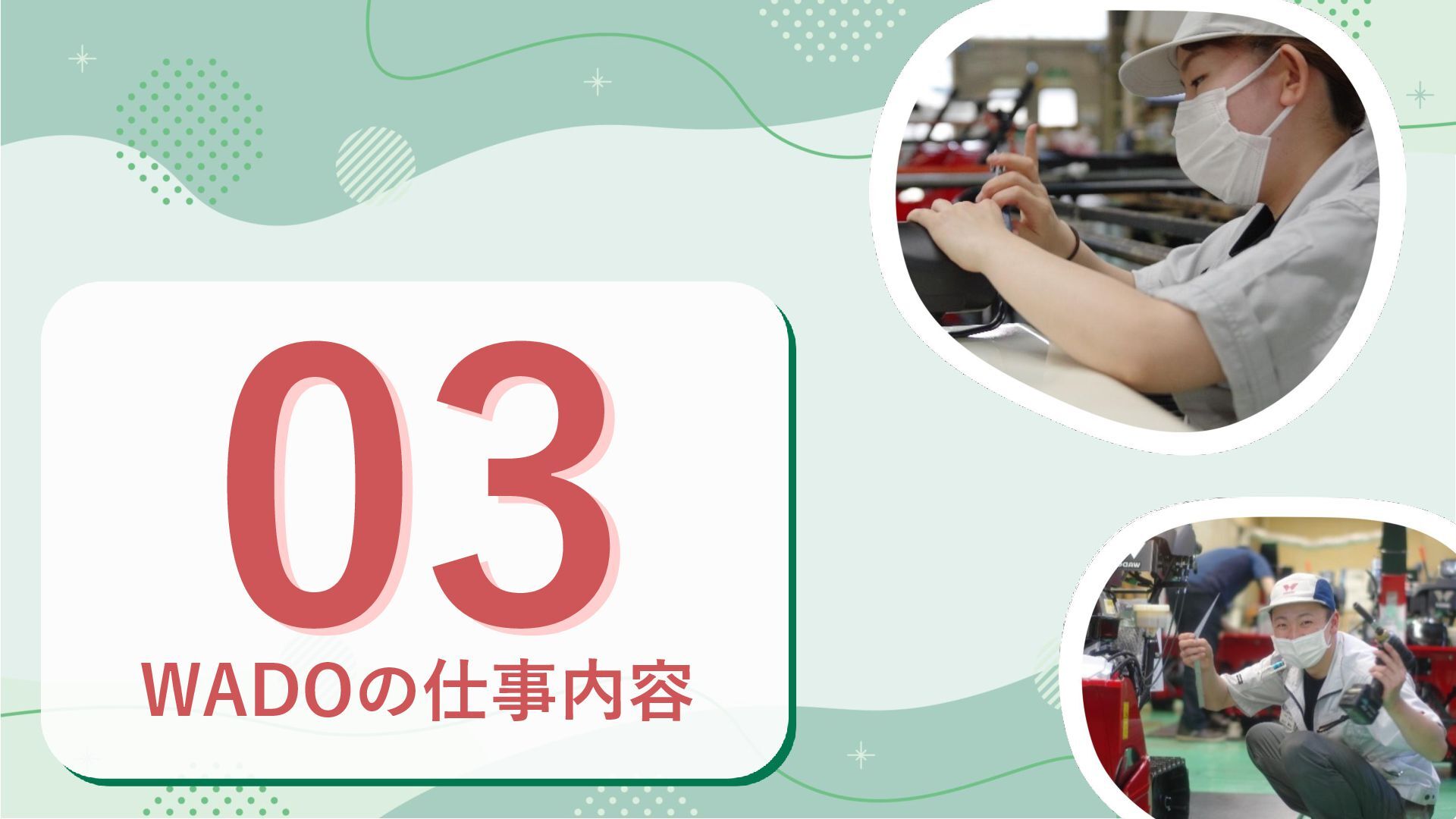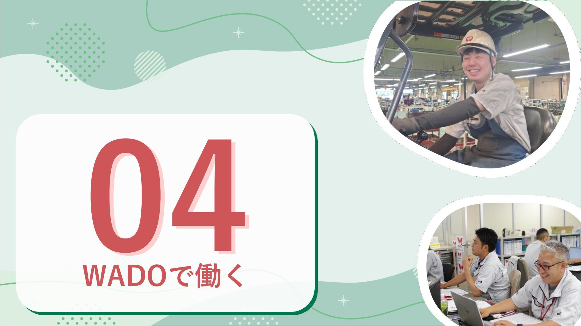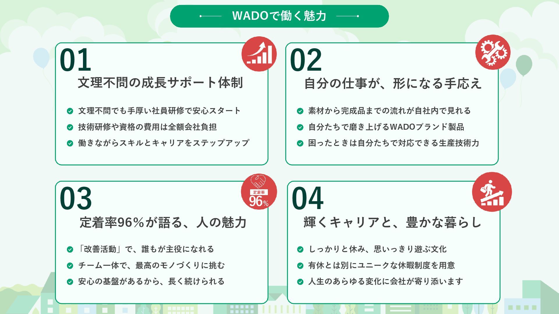 03 誰かの役に立つことに、やりがいを見出せる方 私たちの製品は、誰かの暮らしを支えています。 その先にいるお客様の笑顔を想像し、 仕事のやりがいを見出せる方を歓迎します。 04 失敗を恐れず、挑戦し続けられる方 前例のないことにも、果敢に挑む姿勢を応援します。 数多くの挑戦と、そこから得られる学びこそが、 あなたを成長させます。 WADOが求める人物像