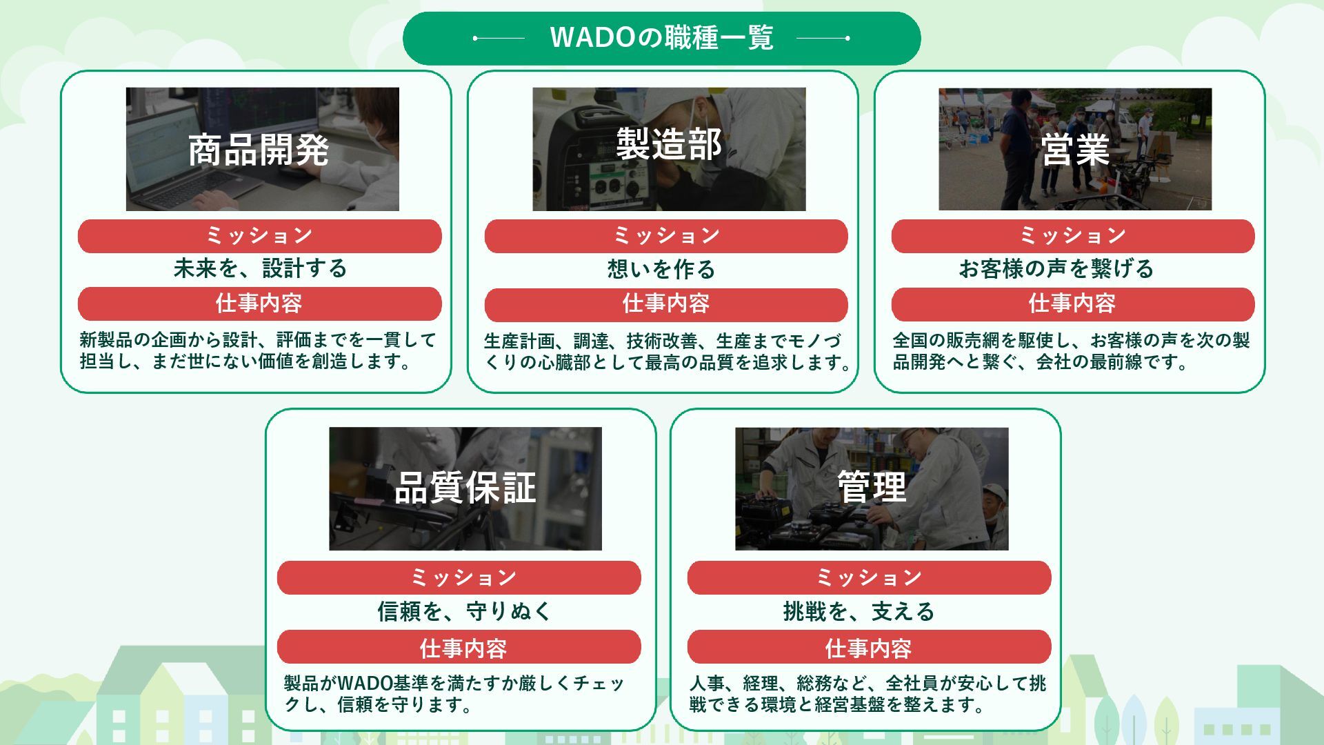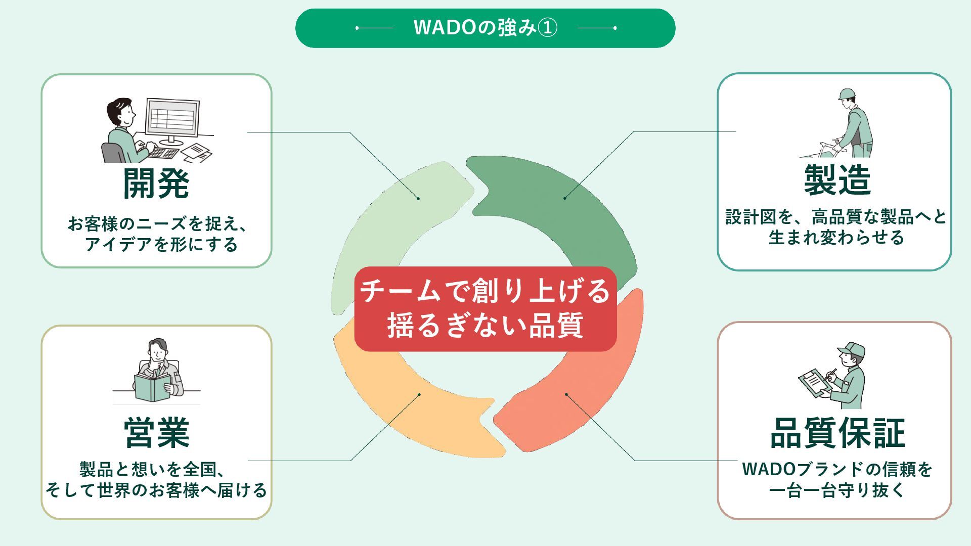 全国の販売網を駆使し、お客様の声を次の製 品開発へと繋ぐ、会社の最前線です。 営業 ミッション 仕事内容 想いを作る 生産計画、調達、技術改善、生産までモノづ くりの心臓部として最高の品質を追求します。 製造部 仕事内容 ミッション 信頼を、守りぬく 製品がWADO基準を満たすか厳しくチェッ クし、信頼を守ります。 品質保証 ミッション 仕事内容 挑戦を、支える 人事、経理、総務など、全社員が安心して挑 戦できる環境と経営基盤を整えます。 管理 WADOの職種一覧